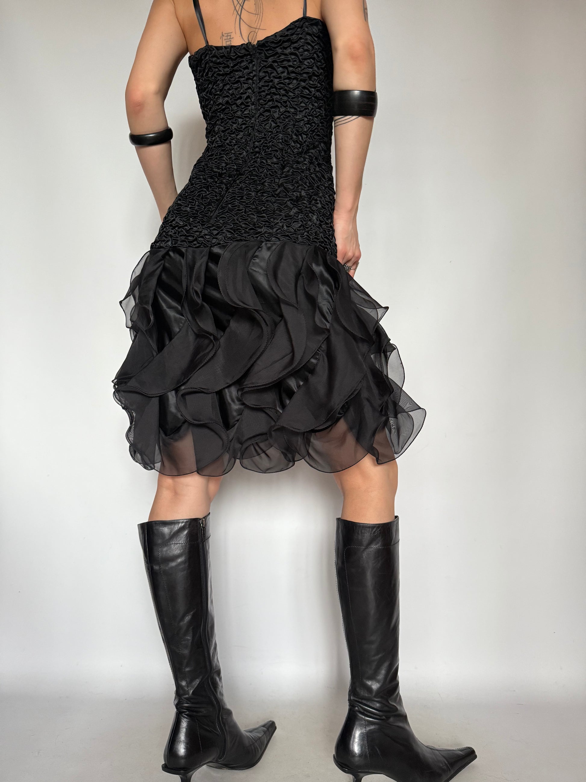 A chic vintage black mini dress featuring a ruched bodice and a layered ruffle hem. Feminine and stylish, perfect for cocktail parties, evening outings, or statement looks
