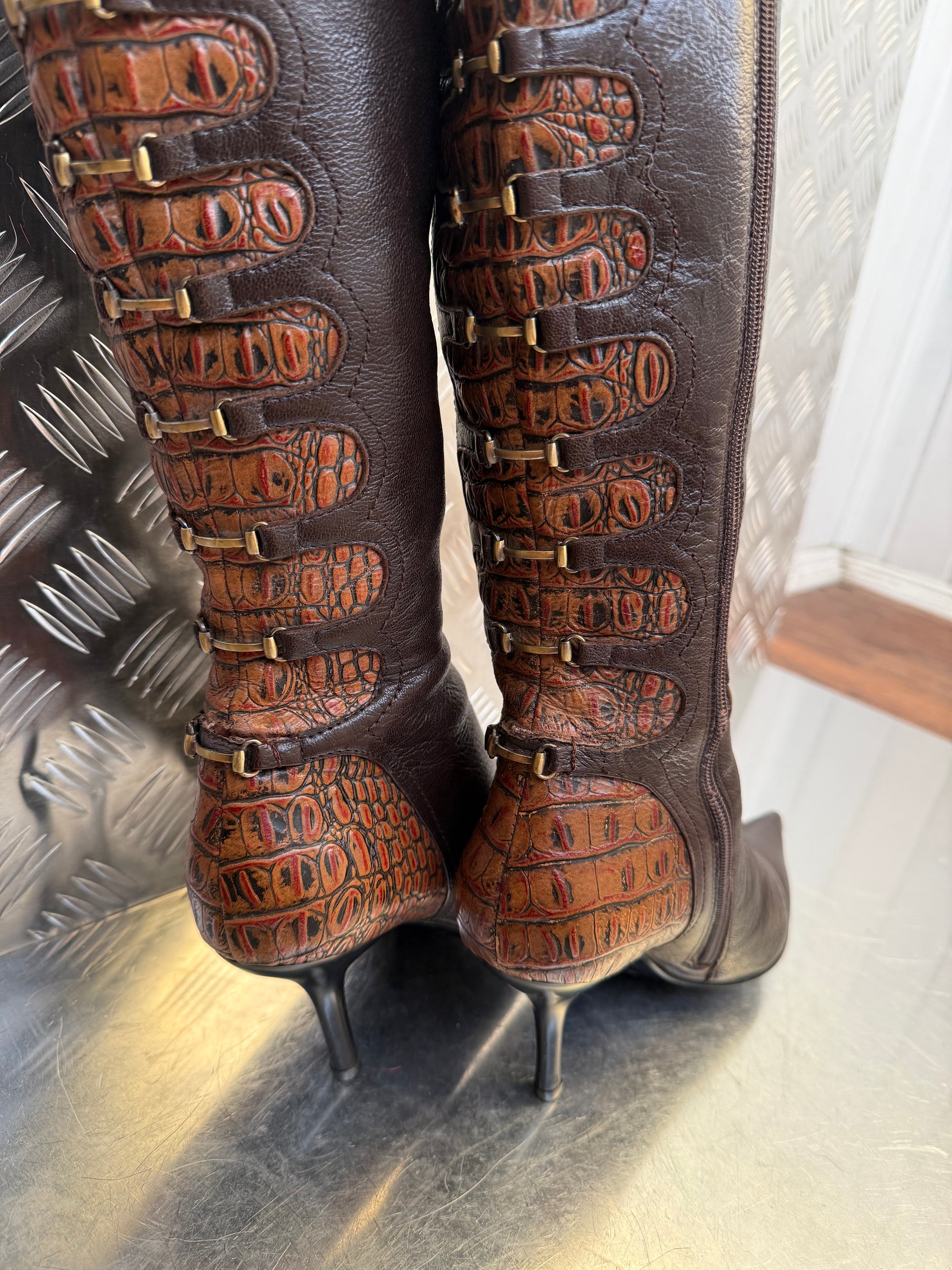 Vintage brown leather high-heel boots with croc-effect trim Twinkling Global