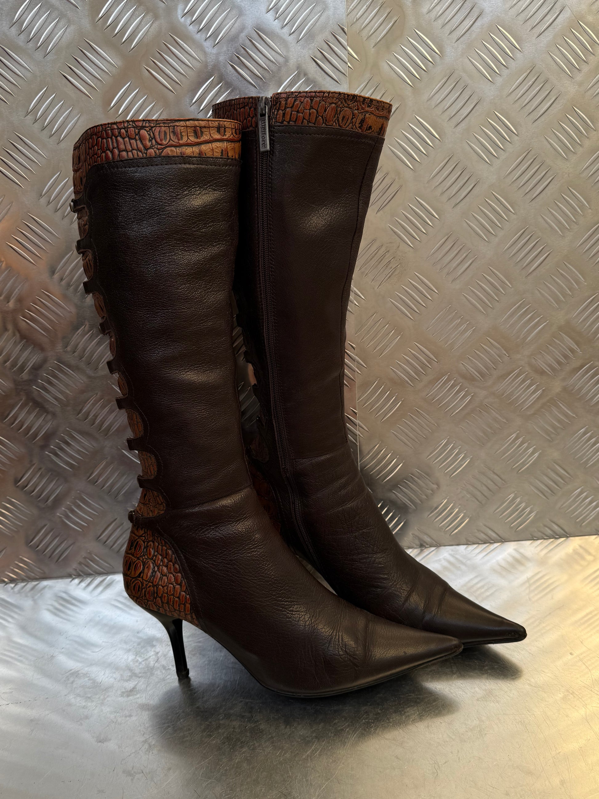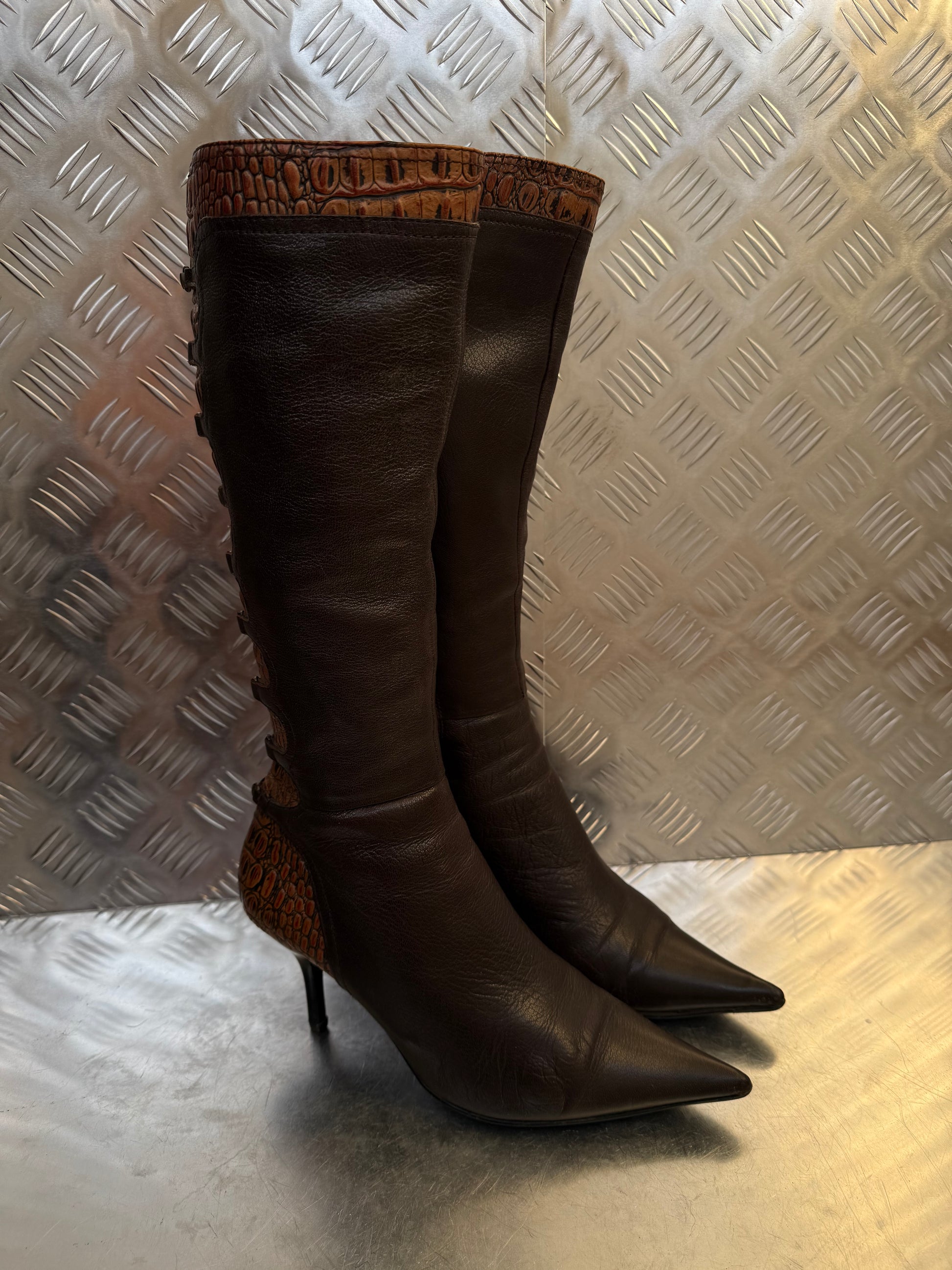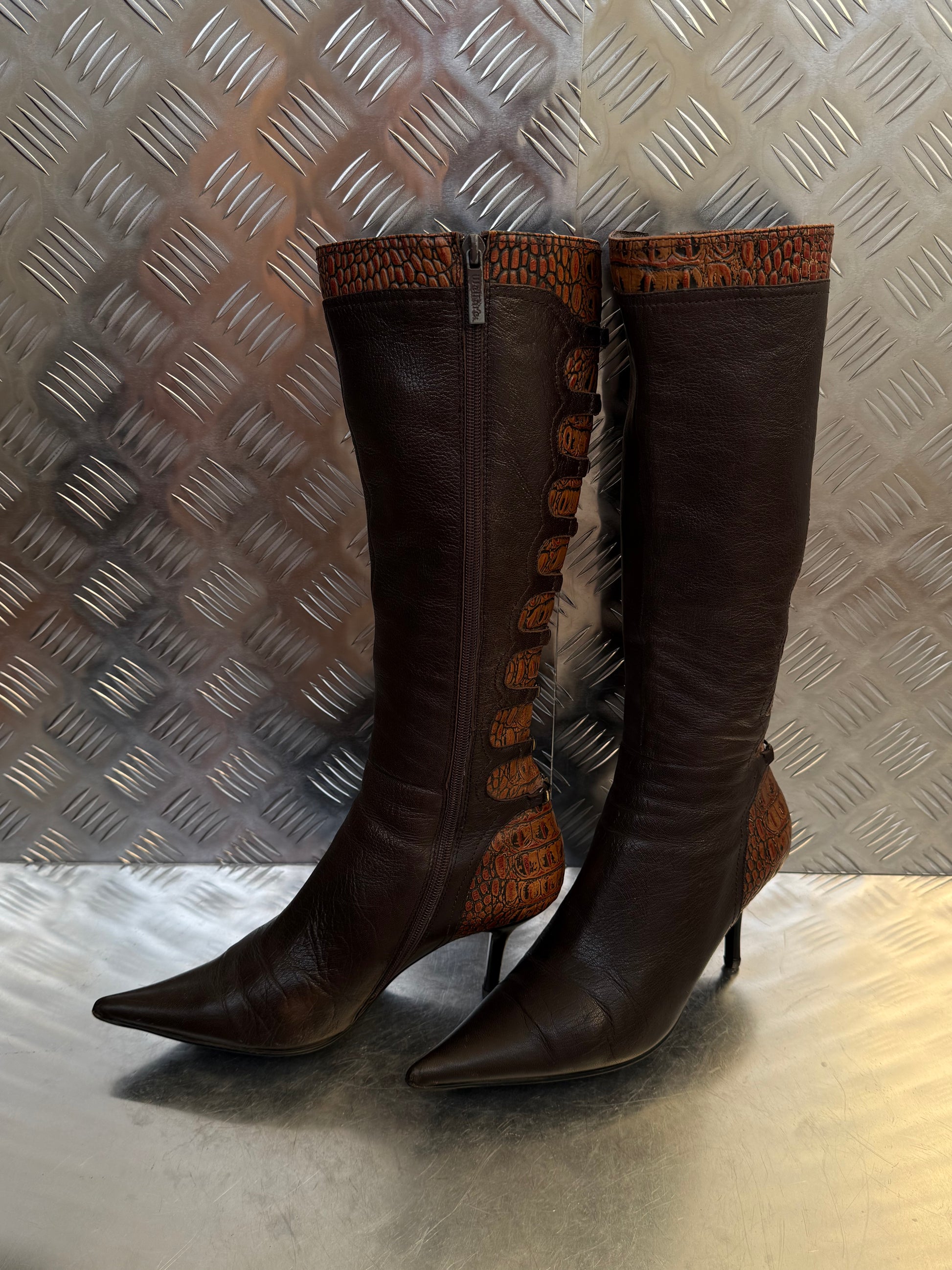 Vintage leather knee-high boots with pointed toe and slim heel. Decorative croc-effect panels and side zip. Condition: satisfactory — scratches on toes and at the heel; please inspect photos.