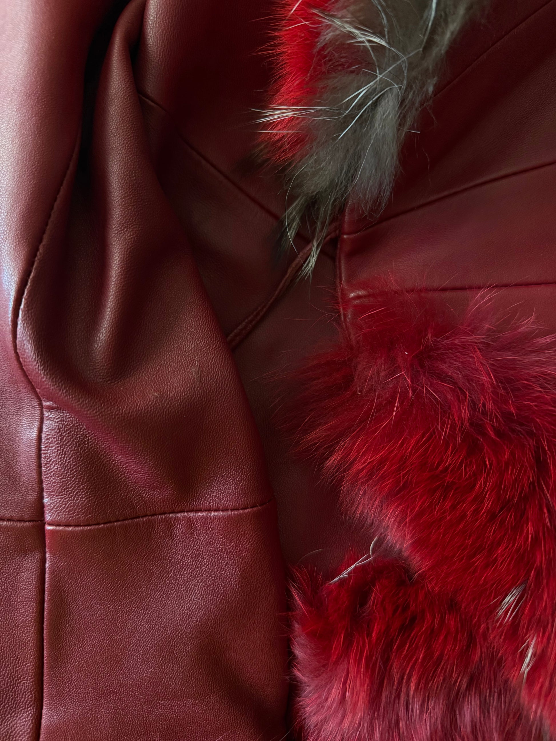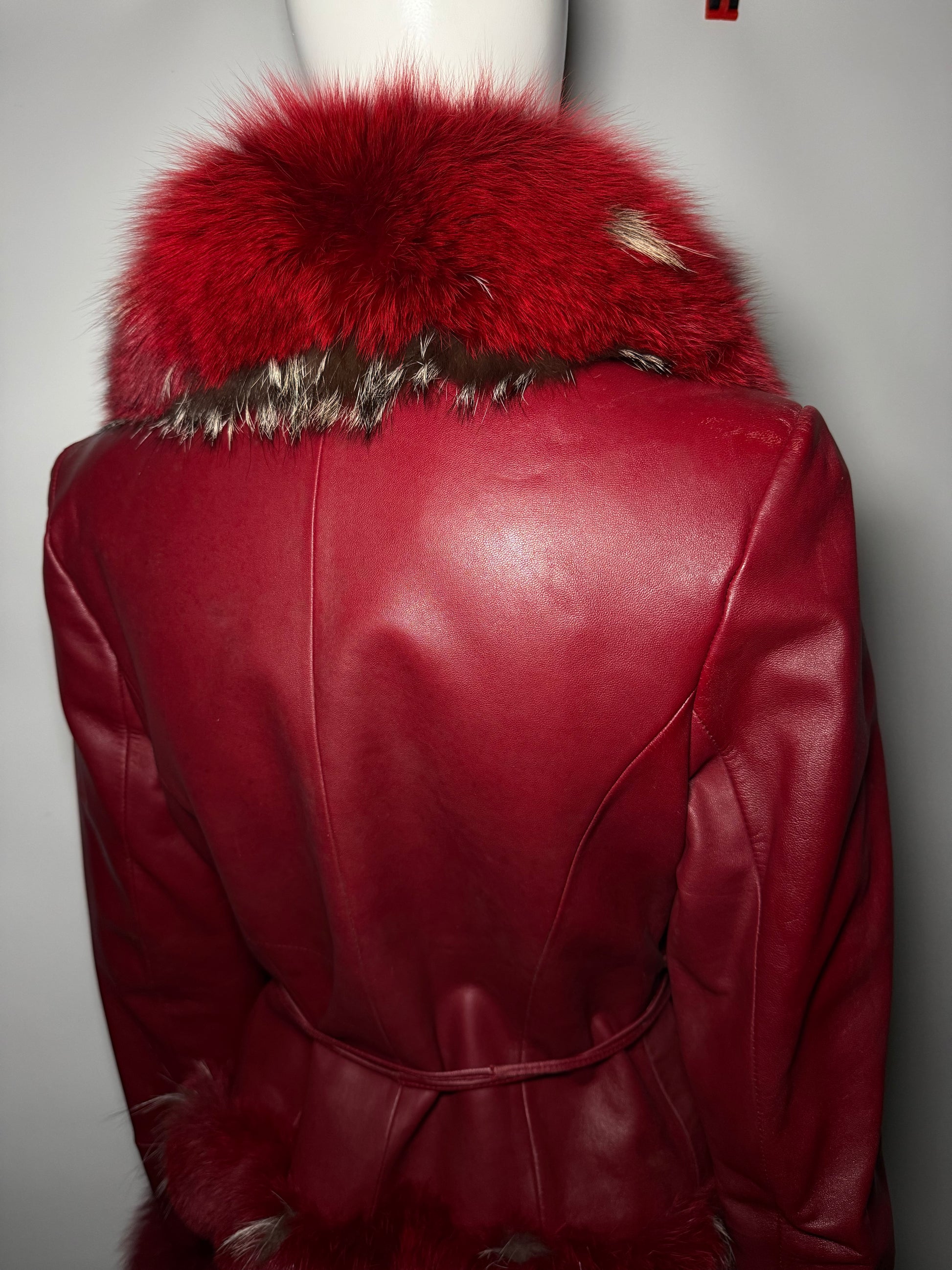 Vintage red genuine leather wrap-style jacket with real fur trim on the collar, cuffs, and hem. Eye-catching deep red tone with a tie waist and feminine silhouette. In good vintage condition, with light scuffs on the sleeves and a small flaw on the shoulder (see last photo).