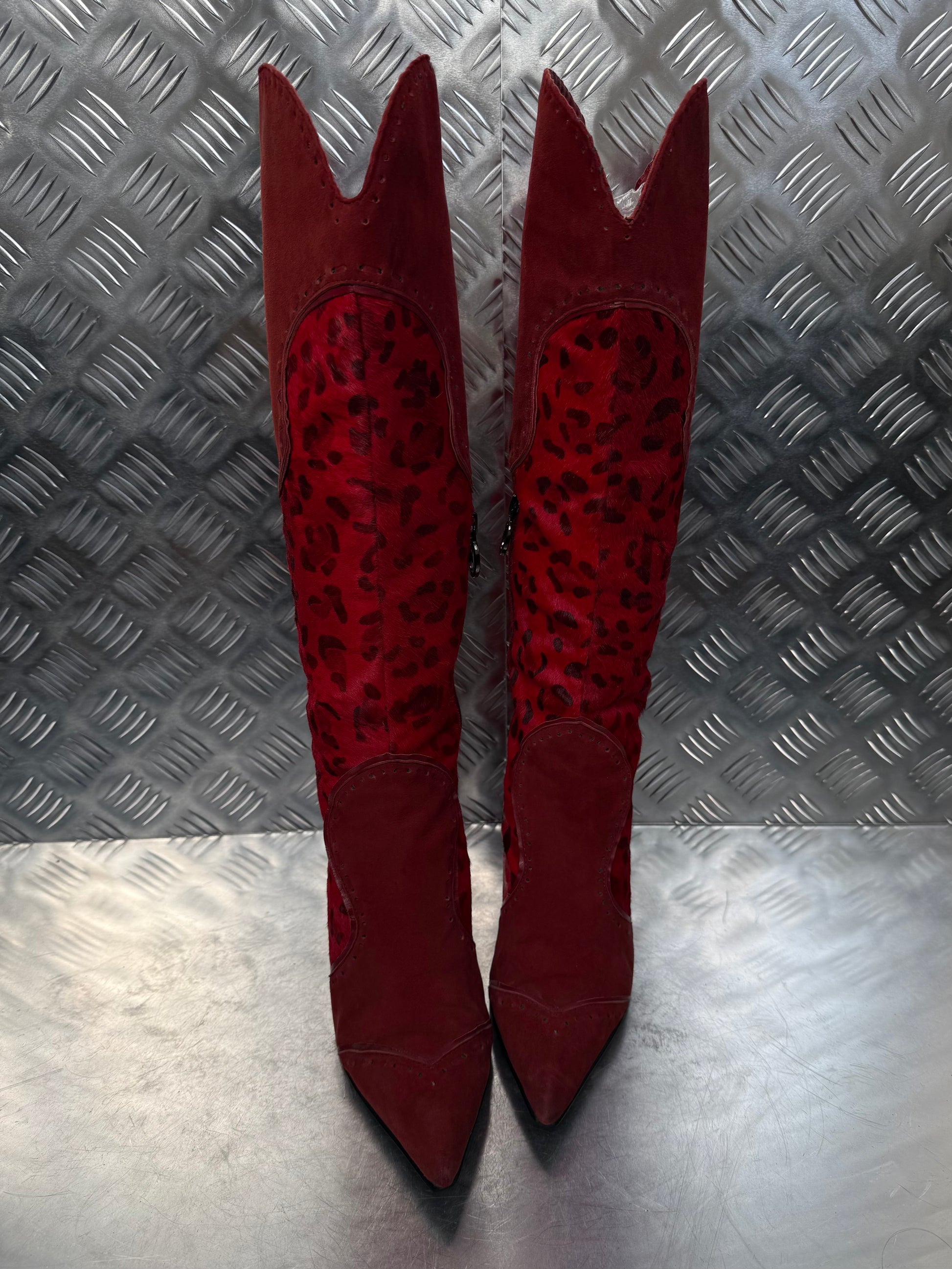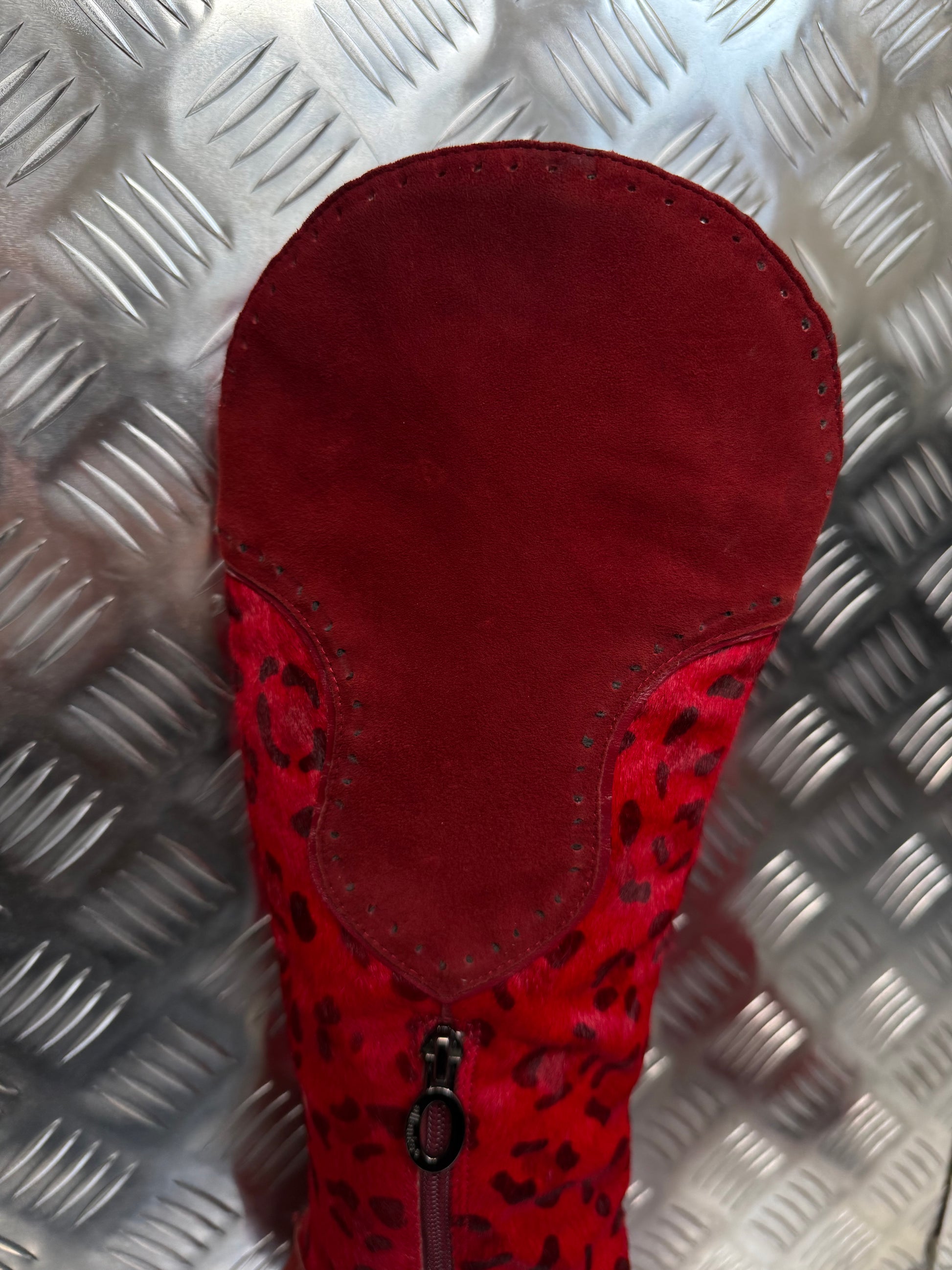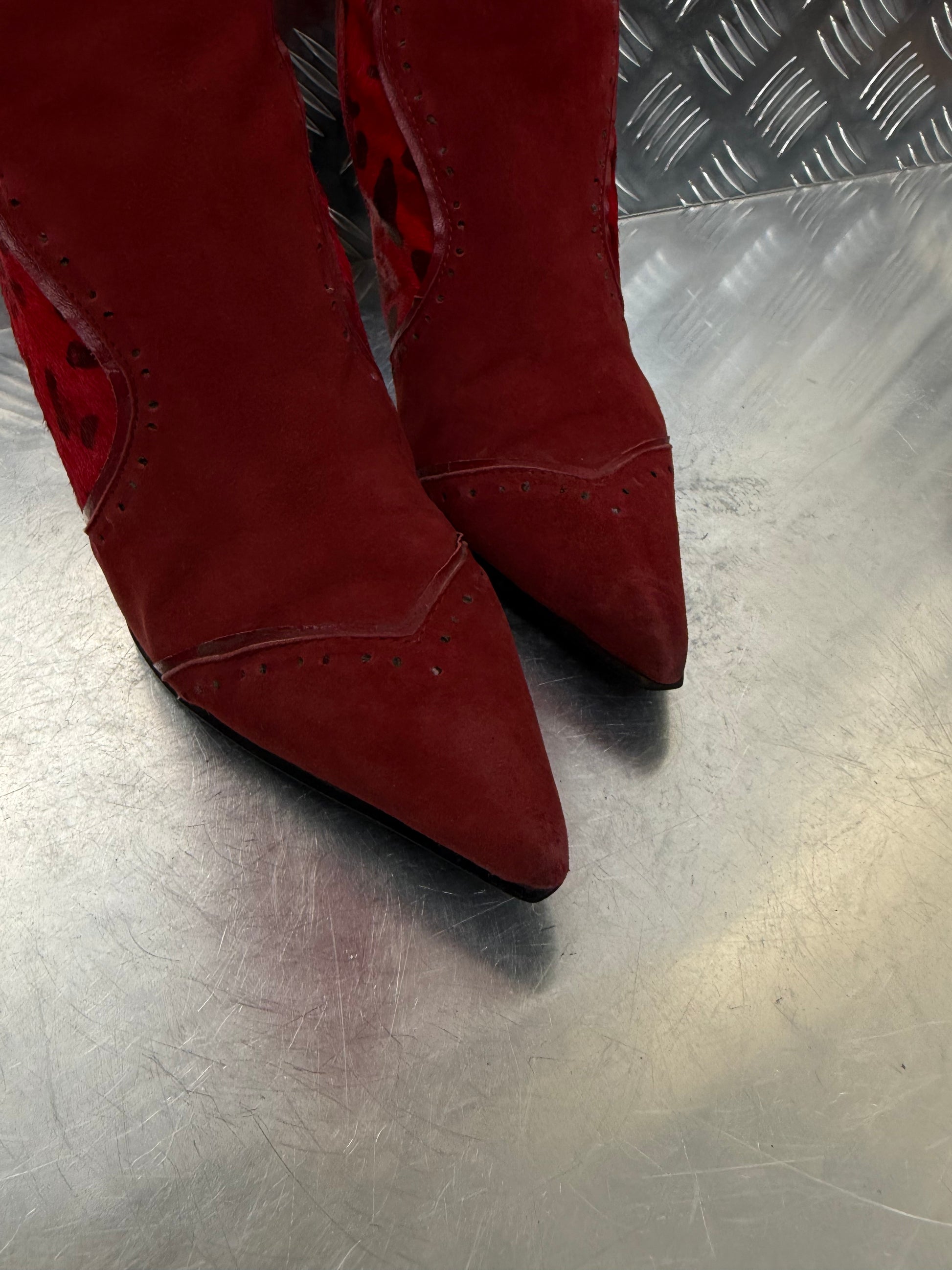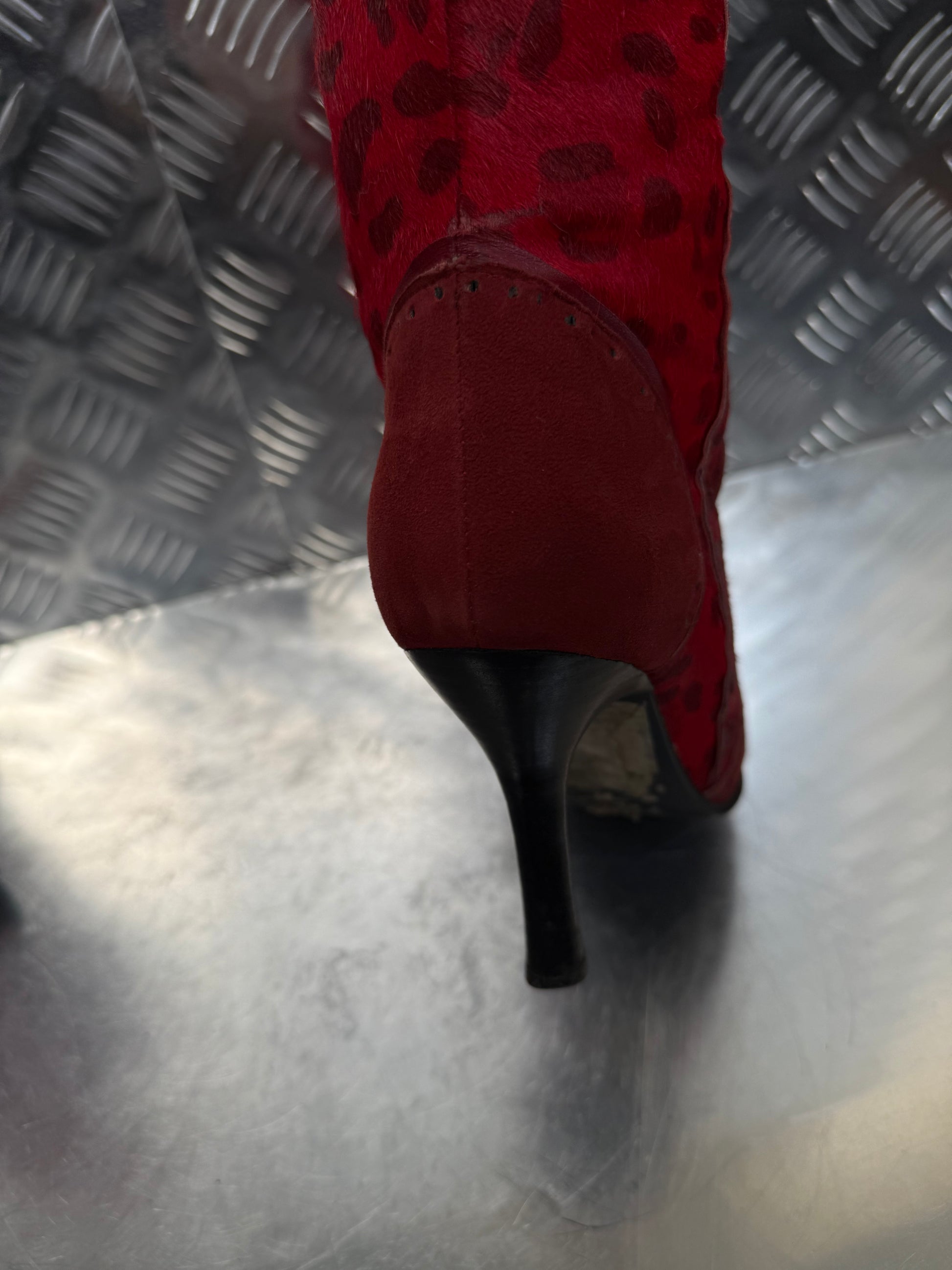 Vintage high-heel boots crafted from red suede and genuine pony fur with a leopard-print pattern. Pointed toe and slim stiletto heel. Side zip closure. Good vintage condition with visible wear on the surface and toe area — see detailed photos.