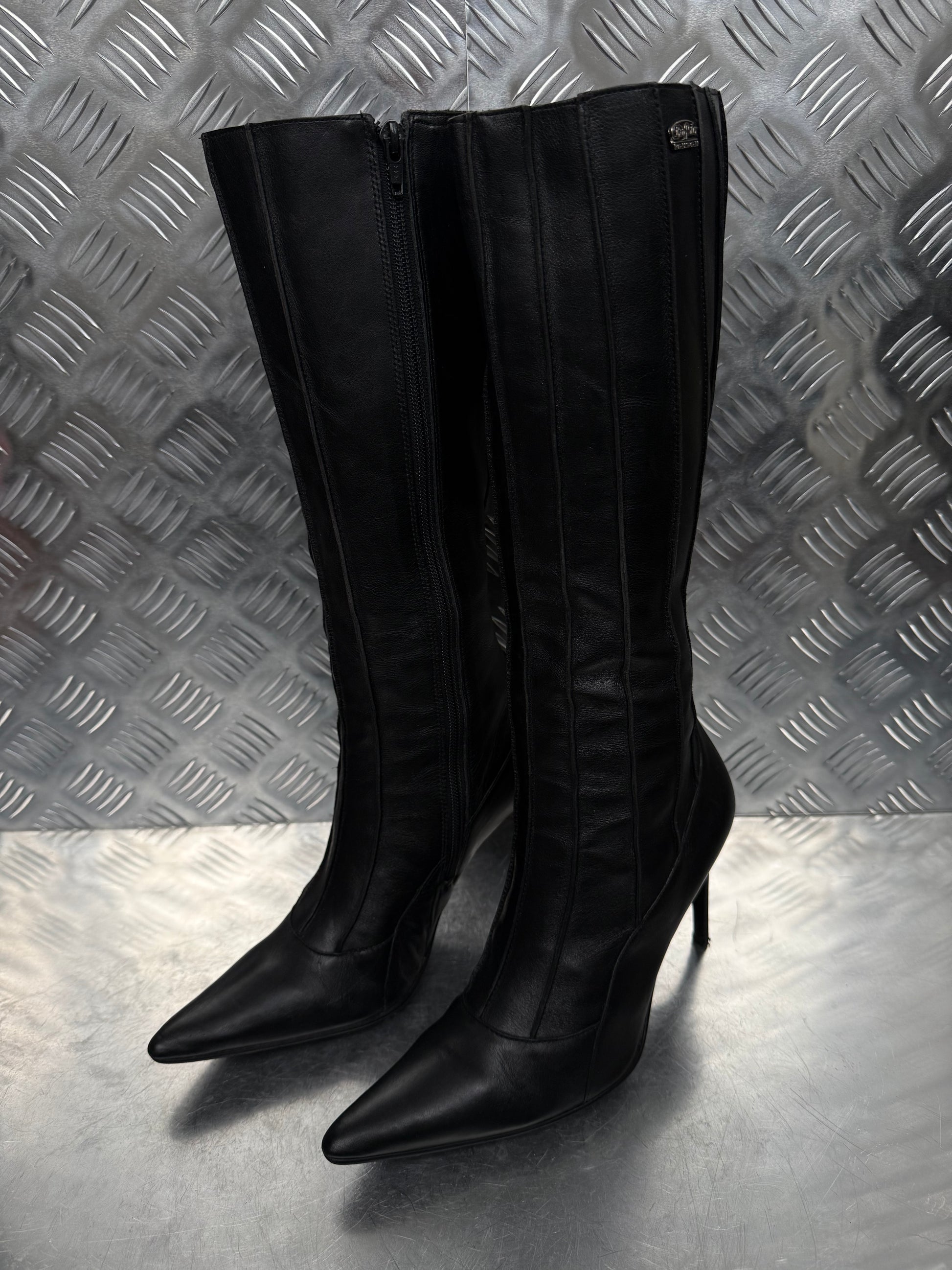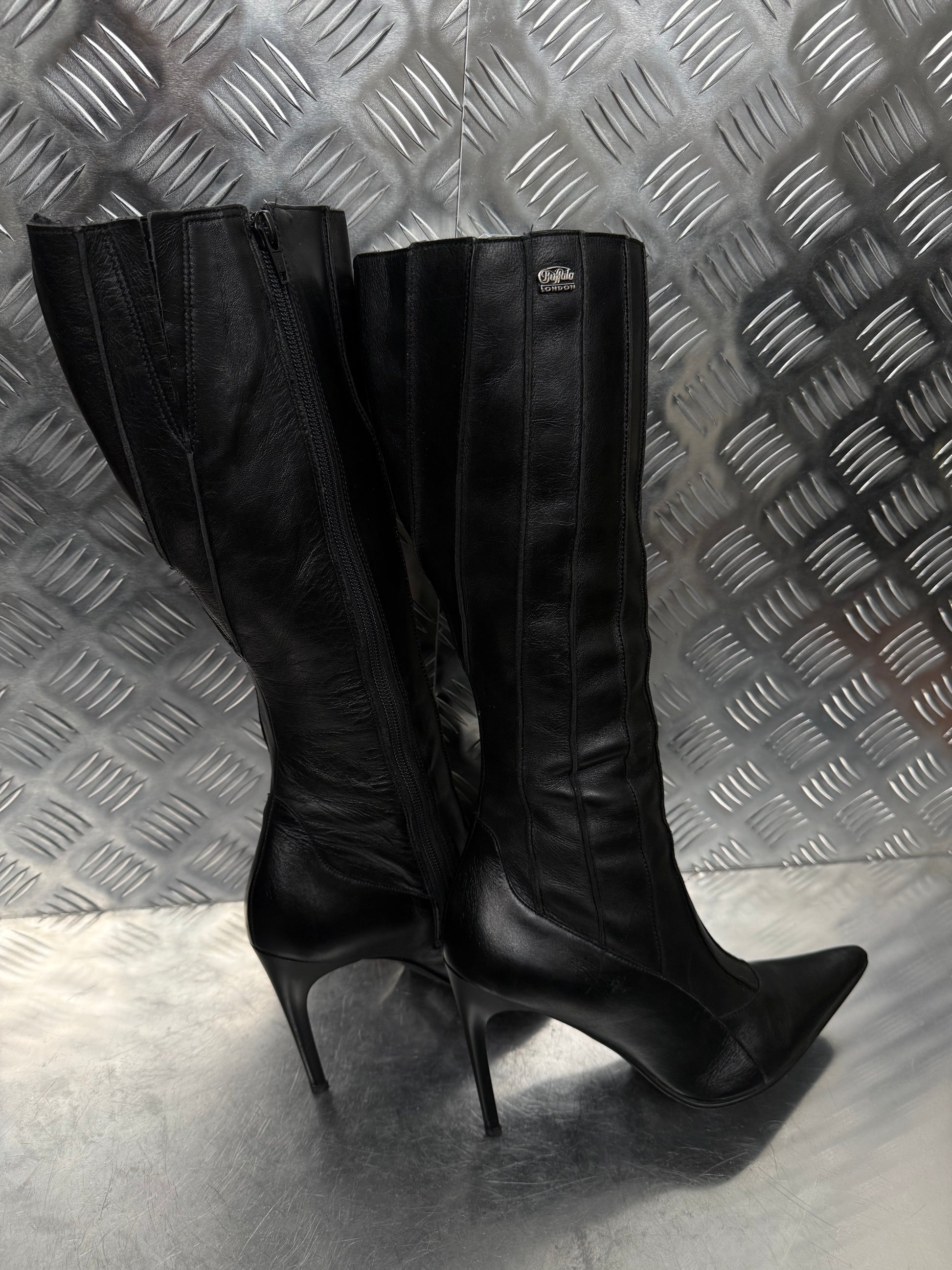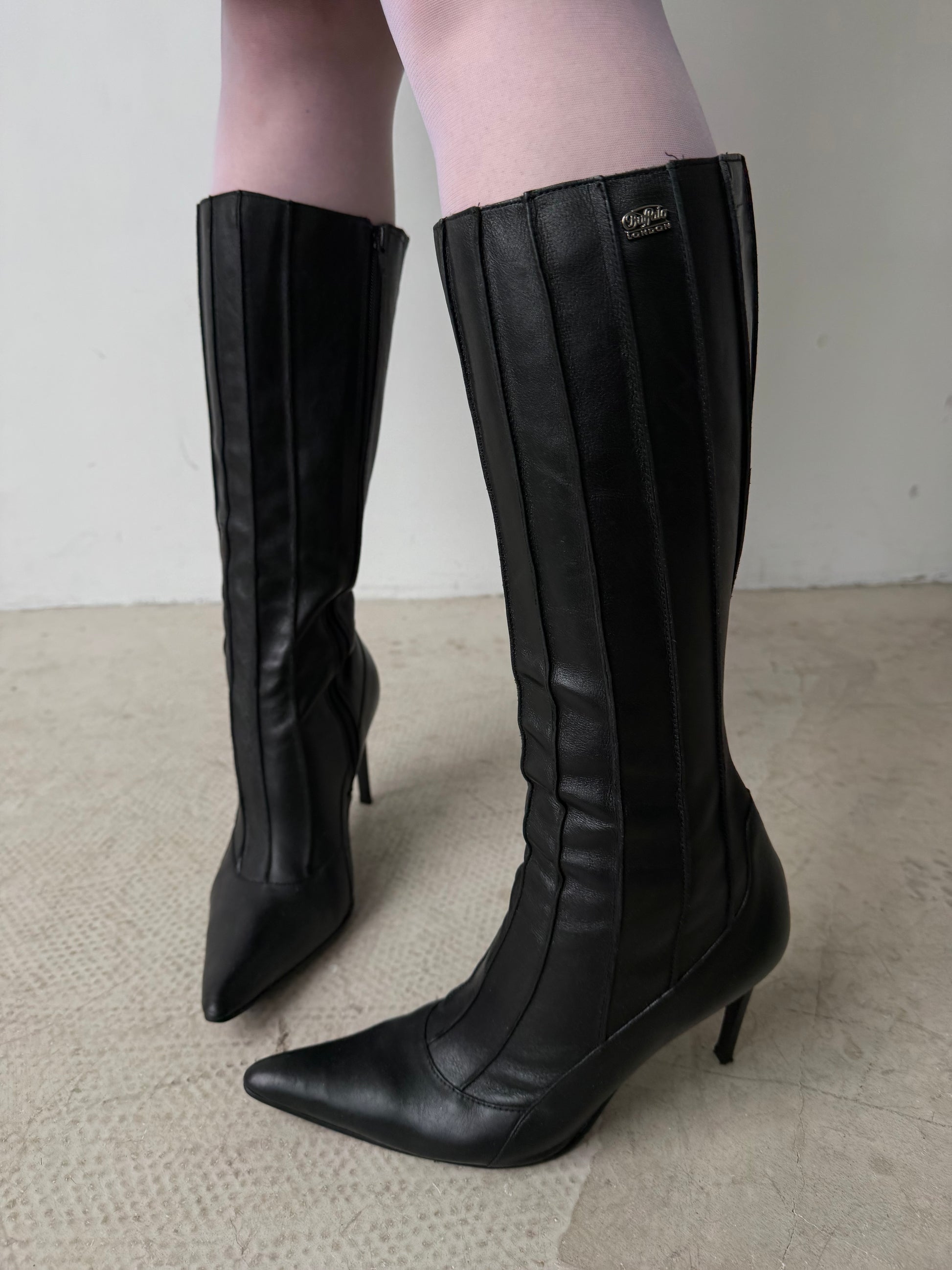 Vintage black leather Buffalo knee-high boots with stiletto heel TWINKLING GLOBAL