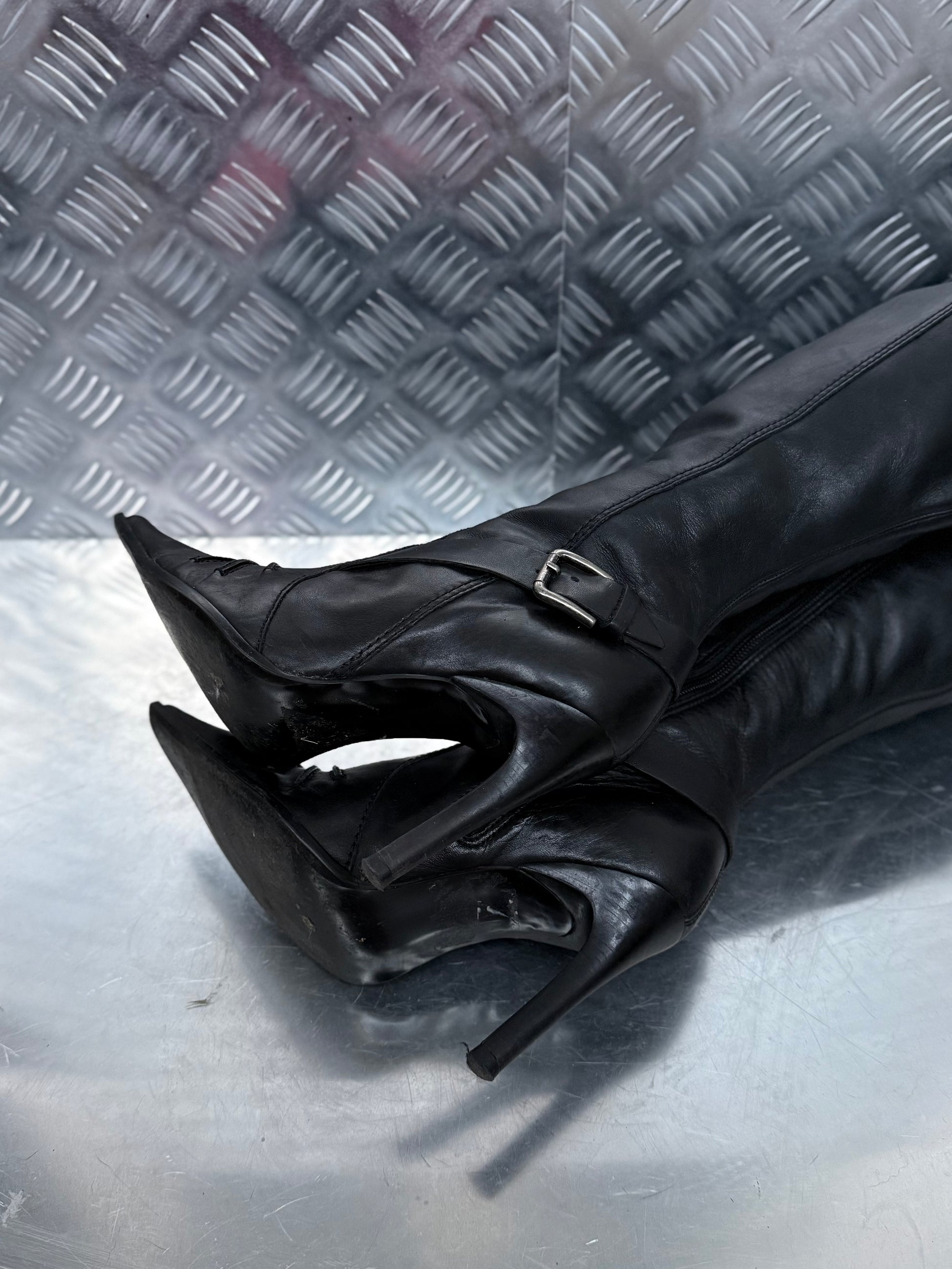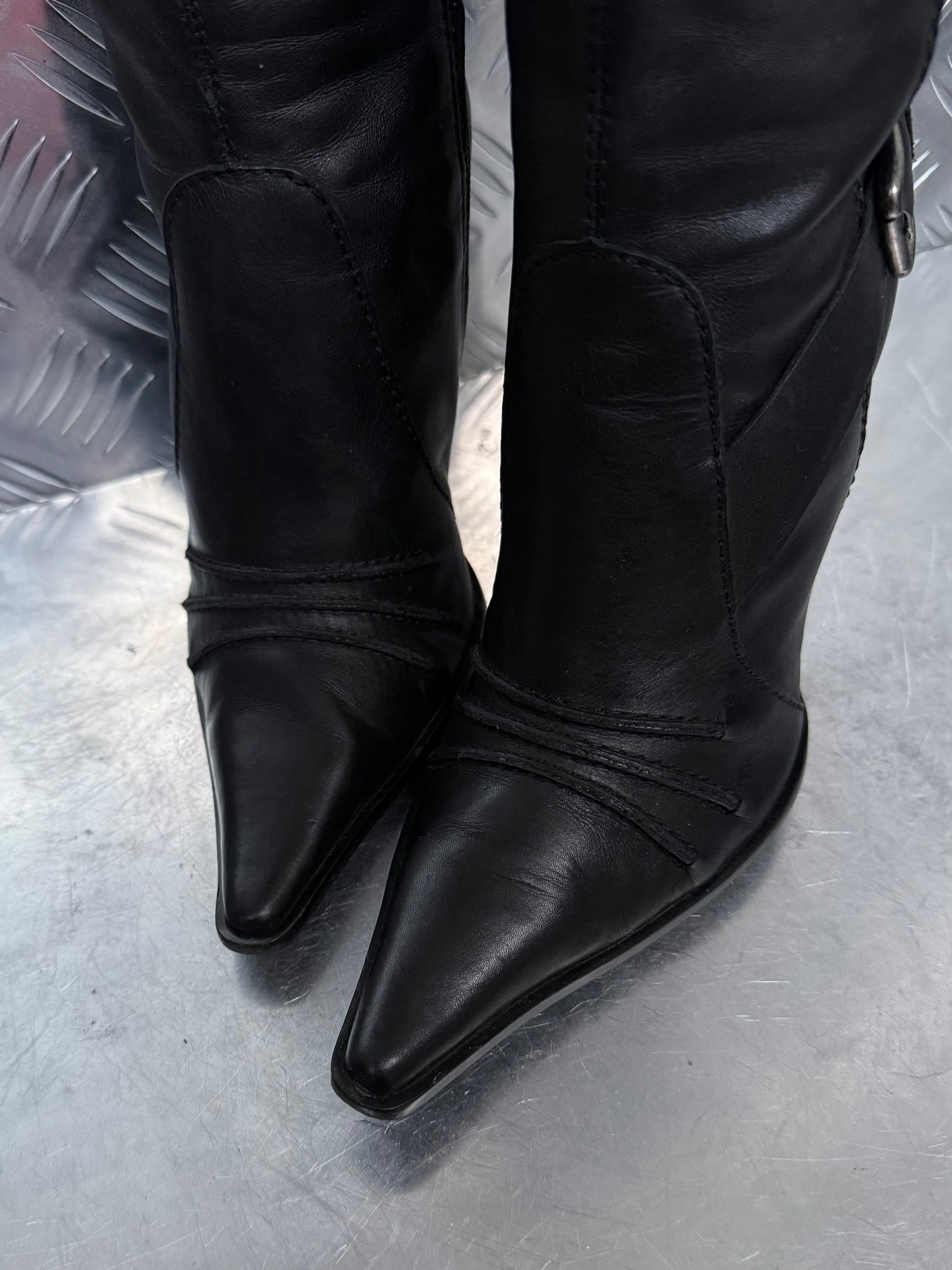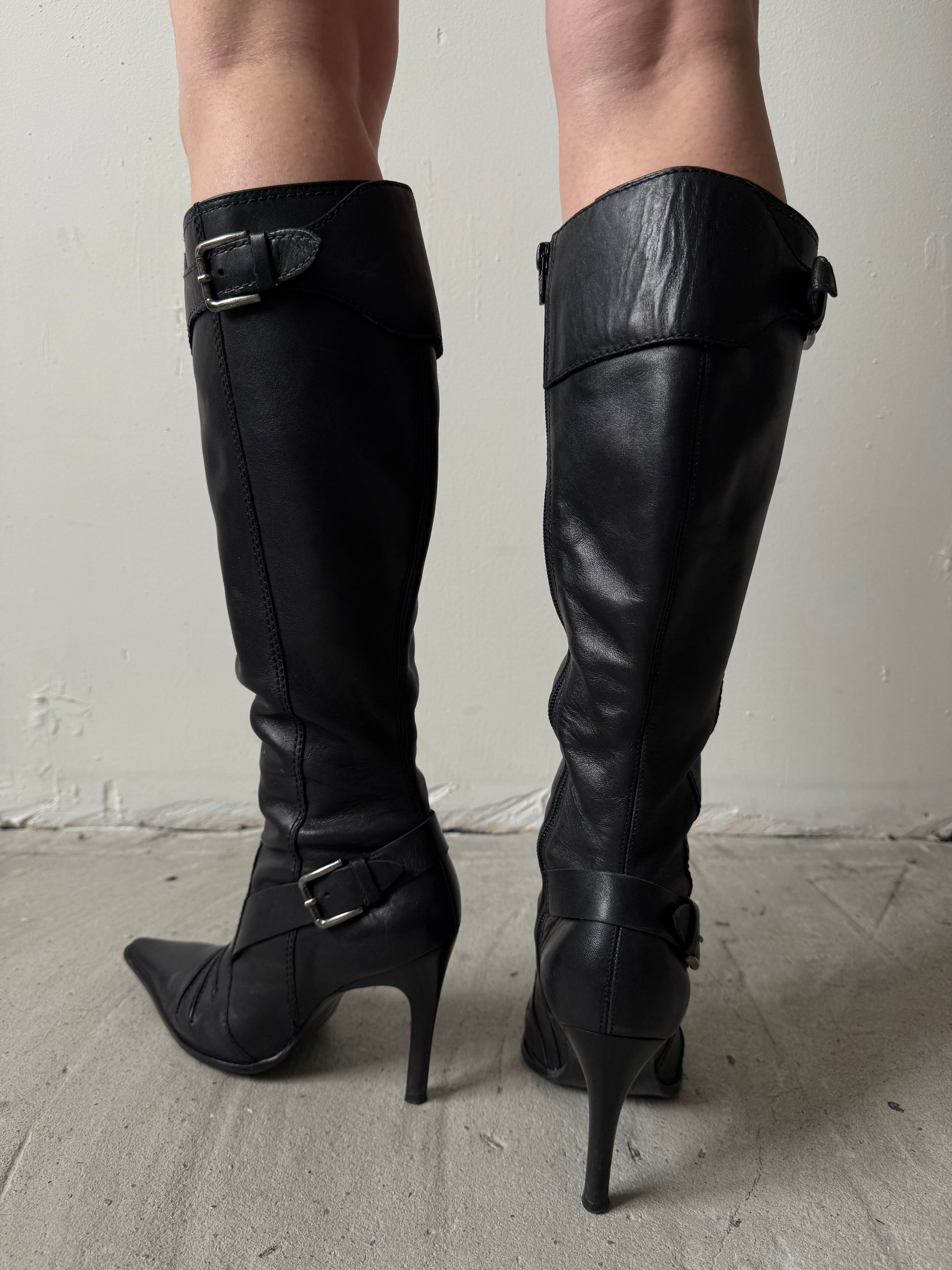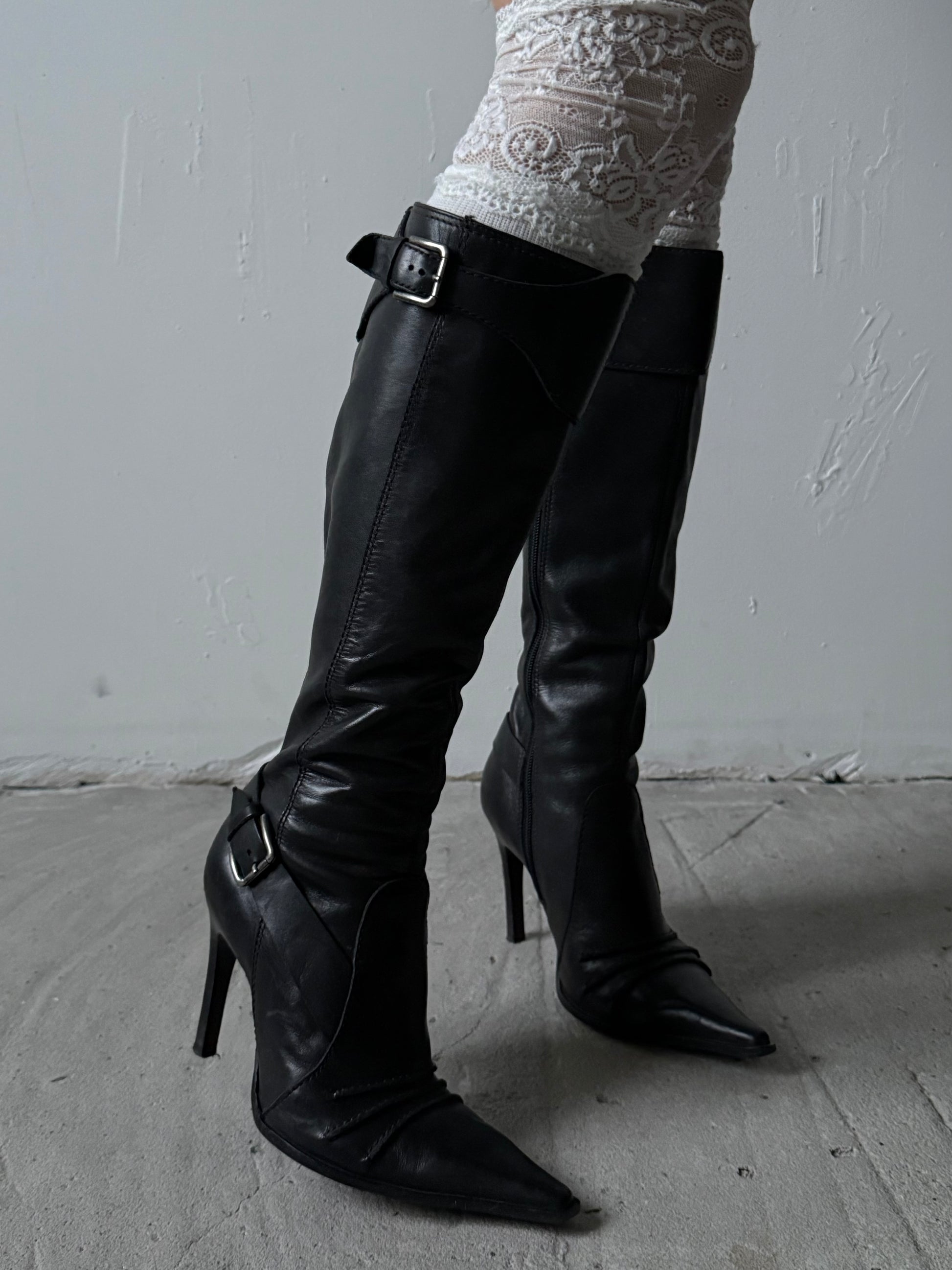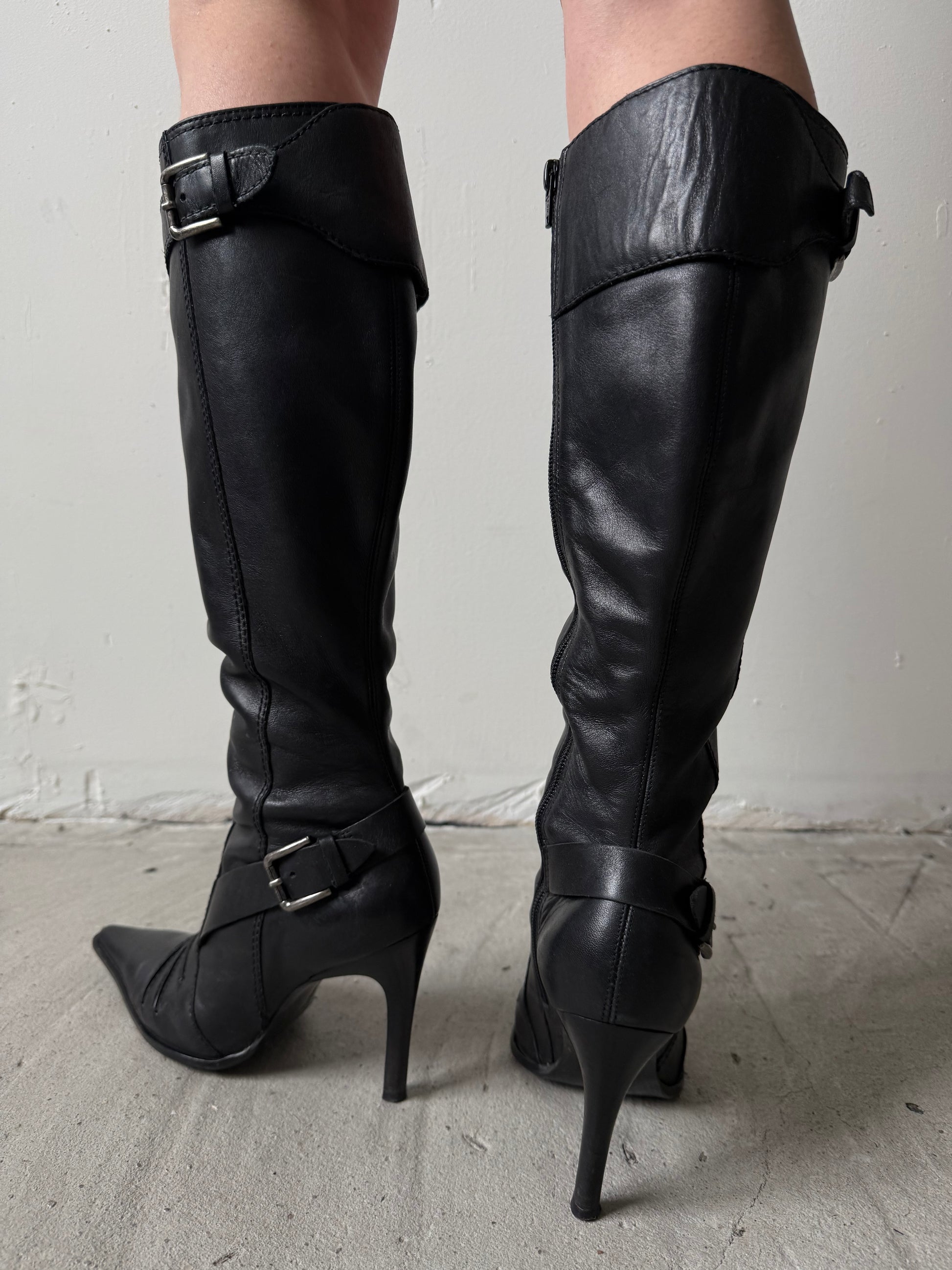 Vintage black leather knee-high boots featuring a pointed toe, slim high heel and buckle detailing at the top and ankle. Clean structured silhouette.