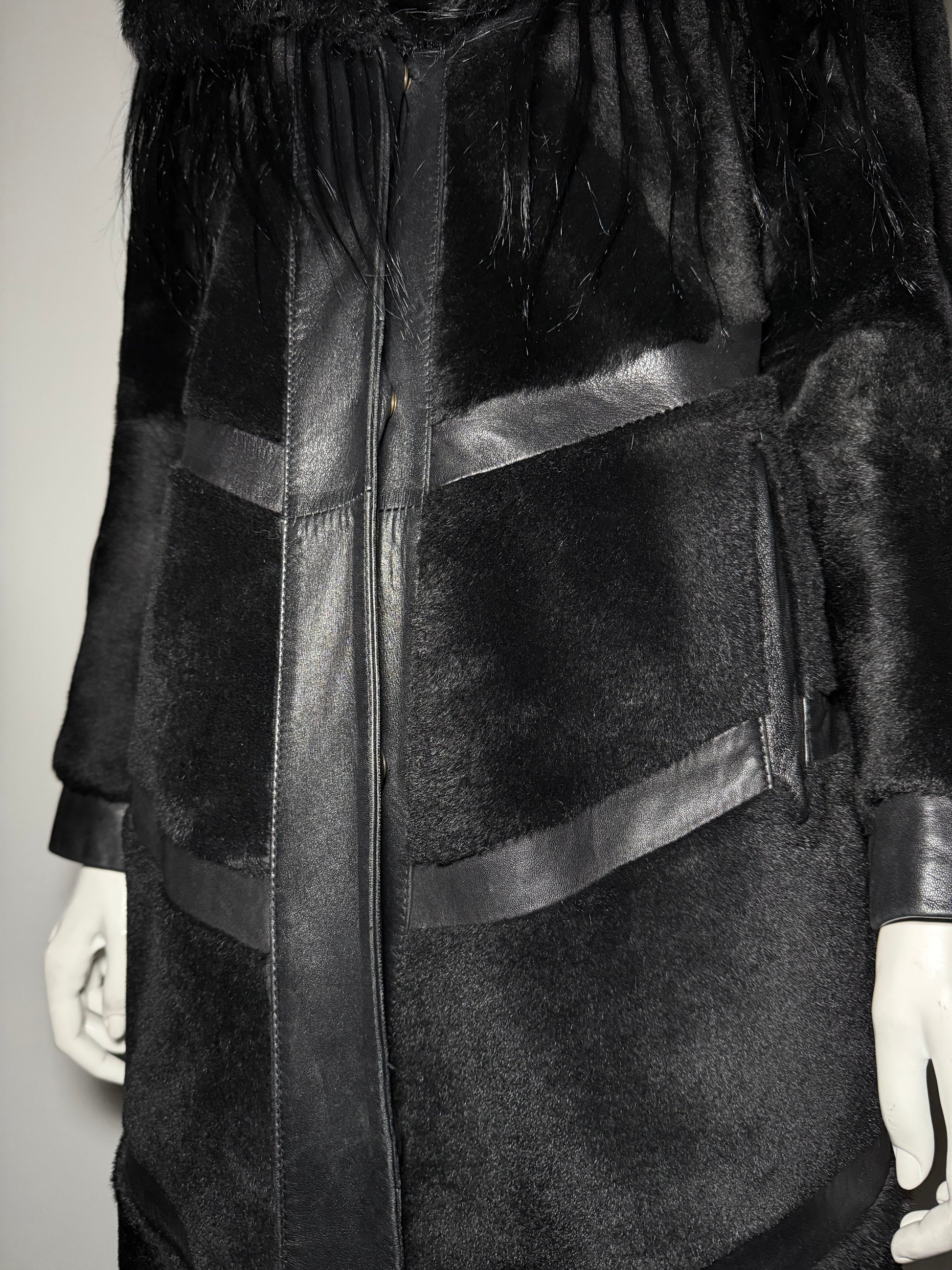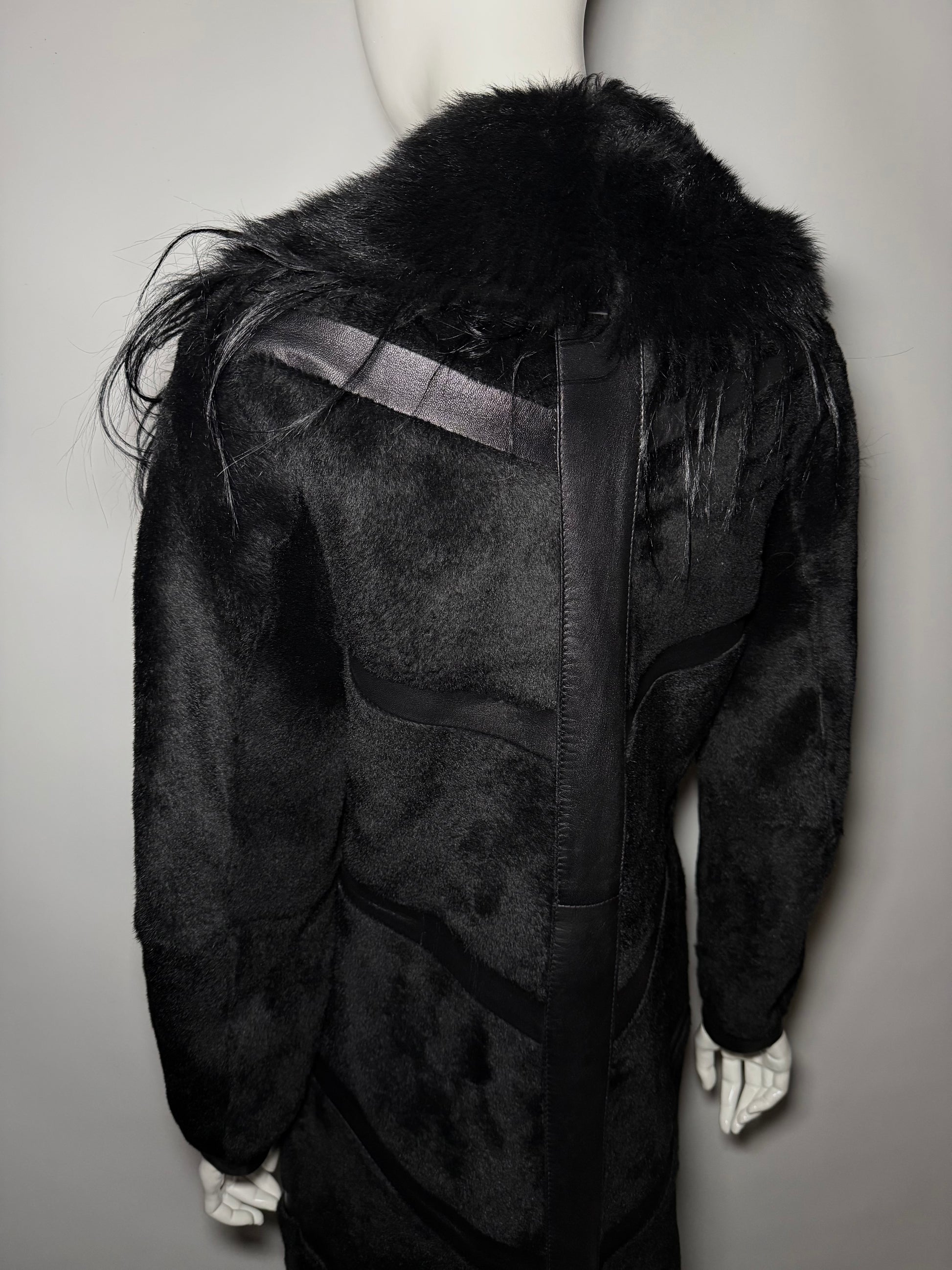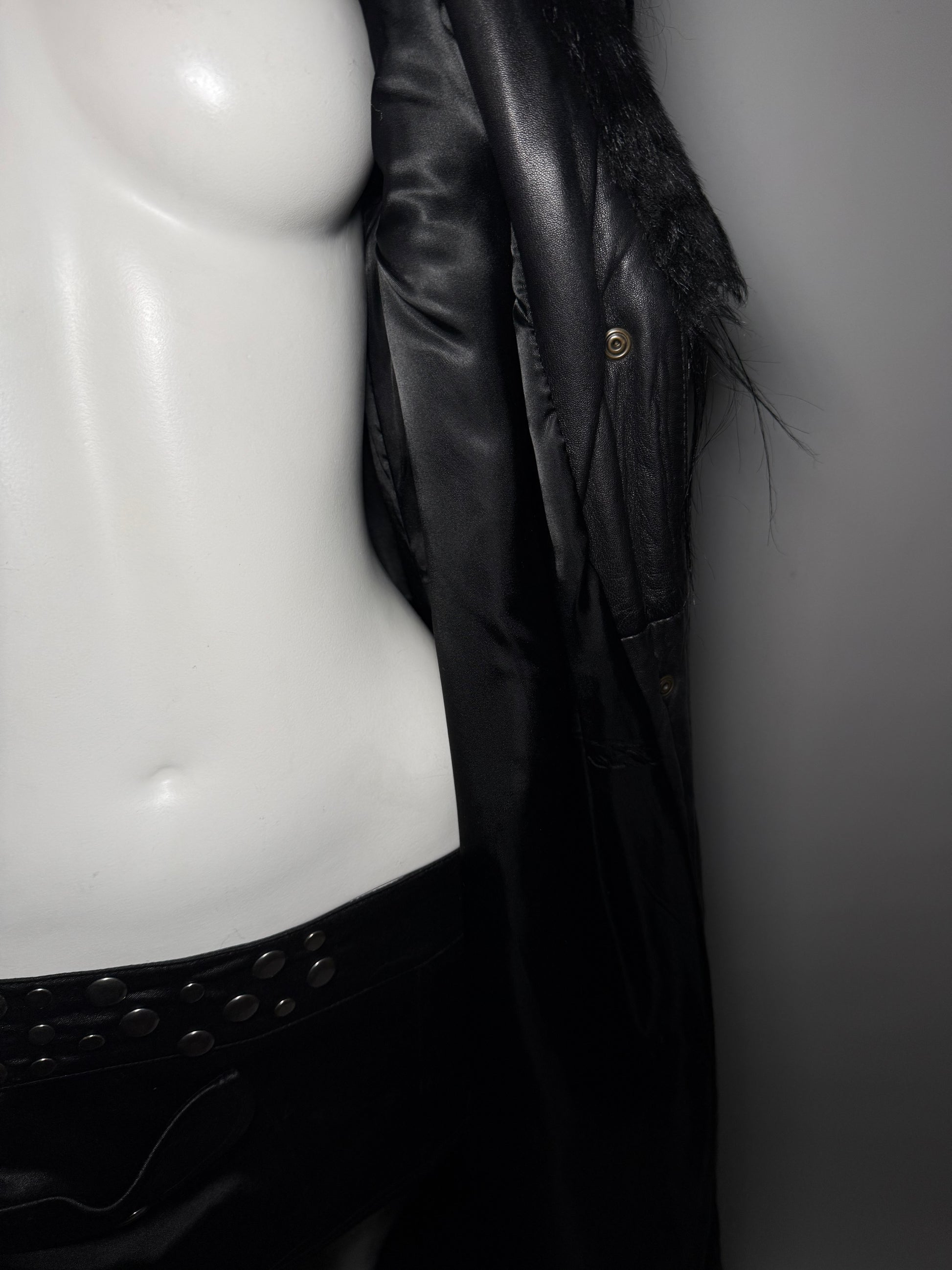 Vintage full-length black leather coat fully lined with real fur throughout. Statement piece with paneled leather construction, dramatic silhouette, and hidden front closure. Warm, heavy, and luxurious. Excellent condition.