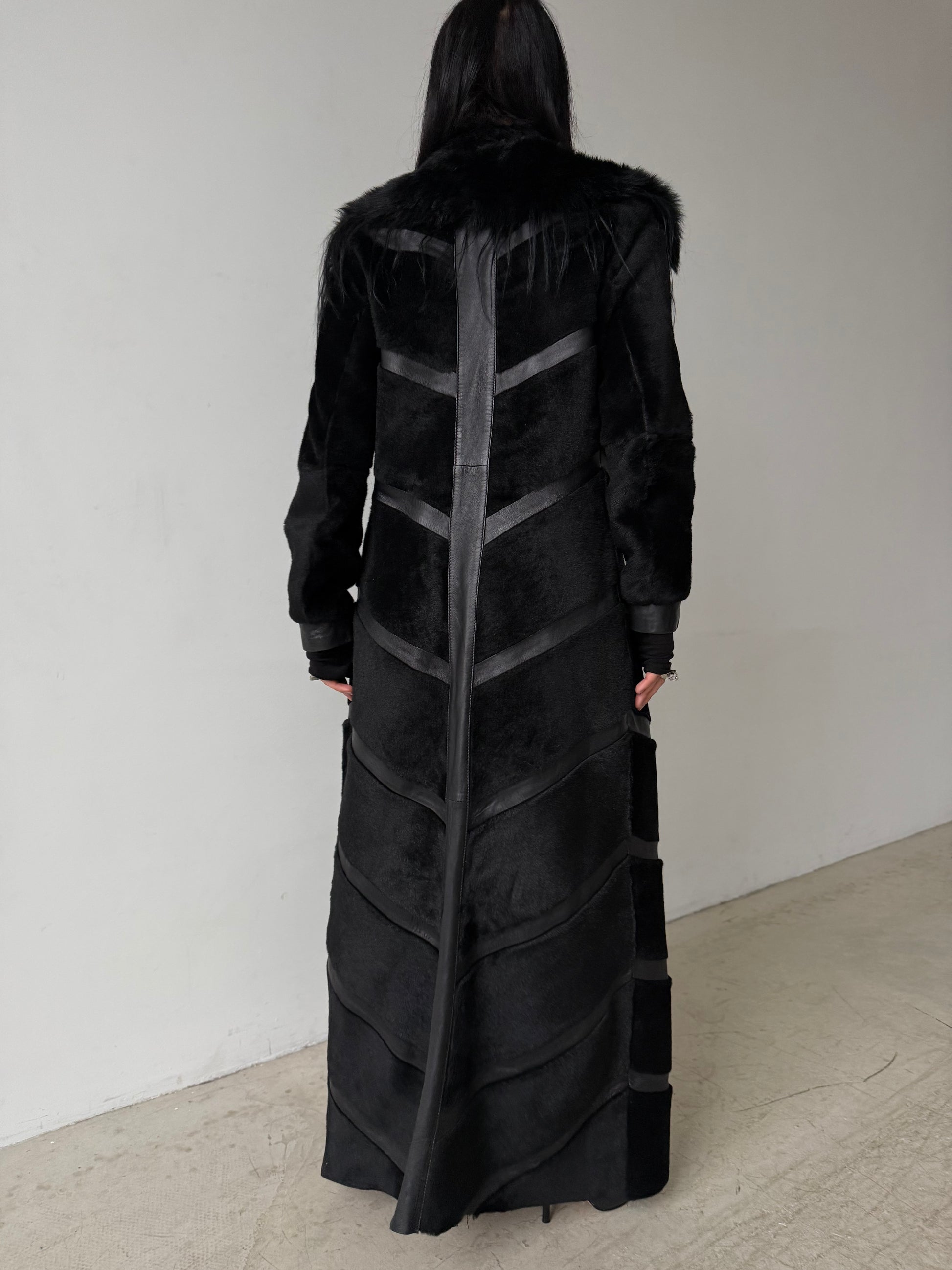 Vintage Black Leather Long Coat with Real Fur TWINKLING GLOBAL