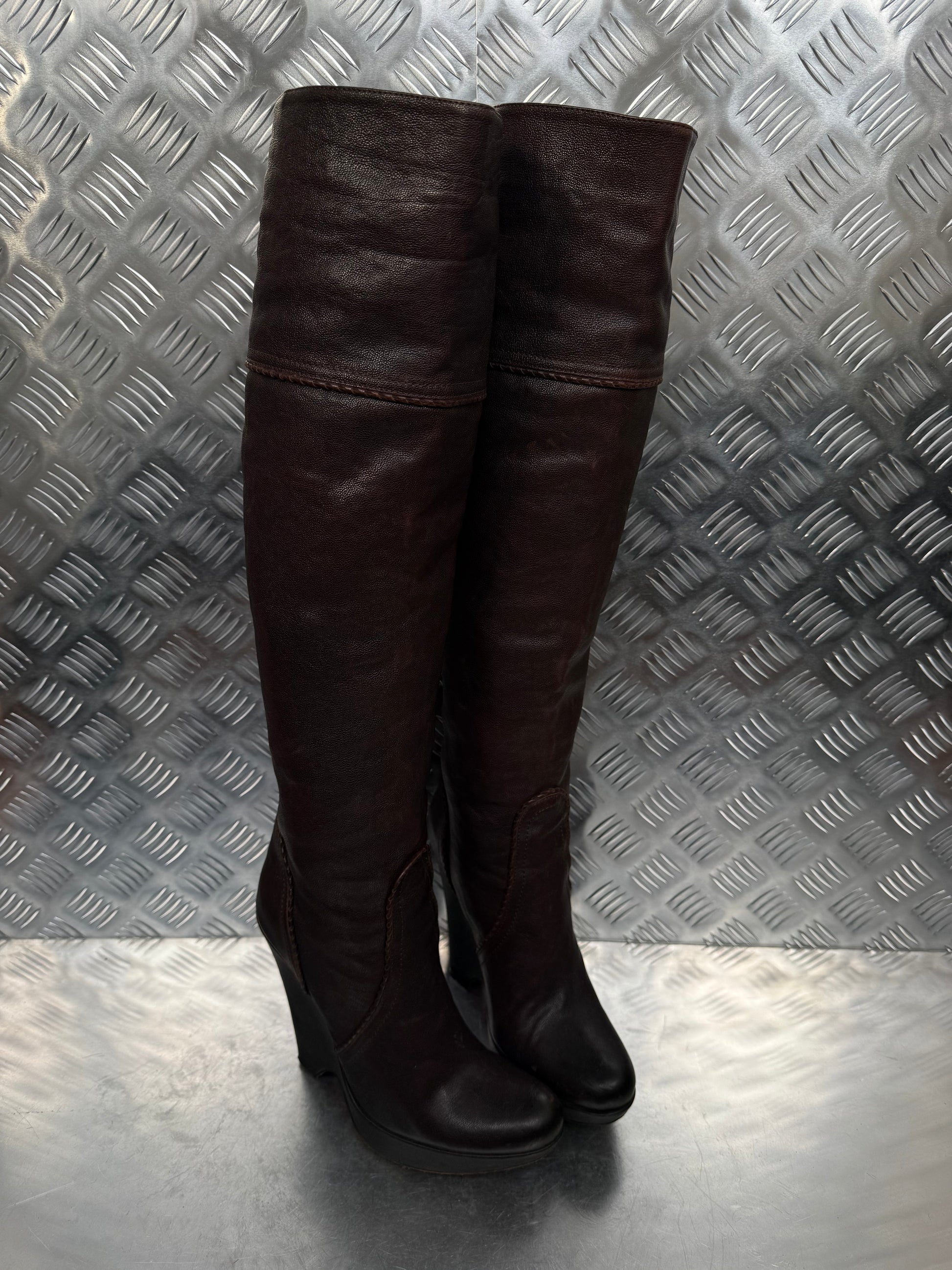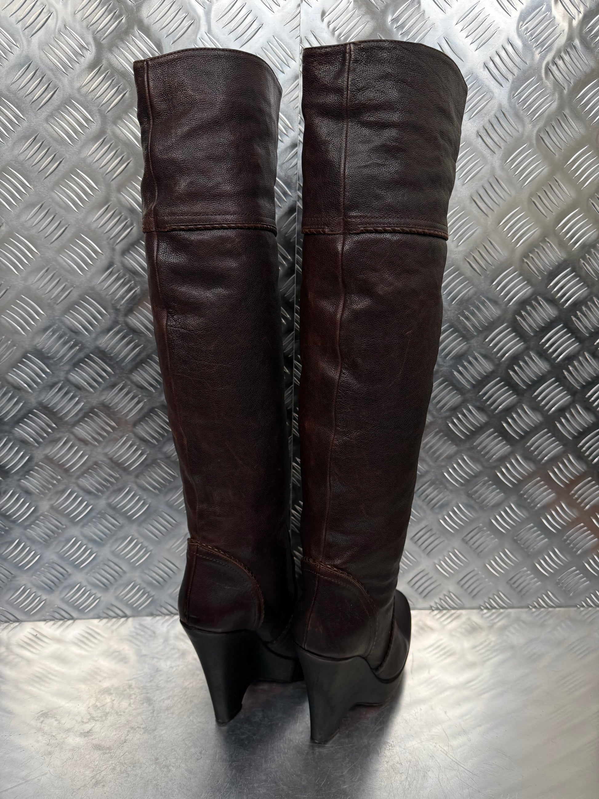 Vintage brown leather platform wedge over-the-knee boots SHY TWINKLING GLOBAL
