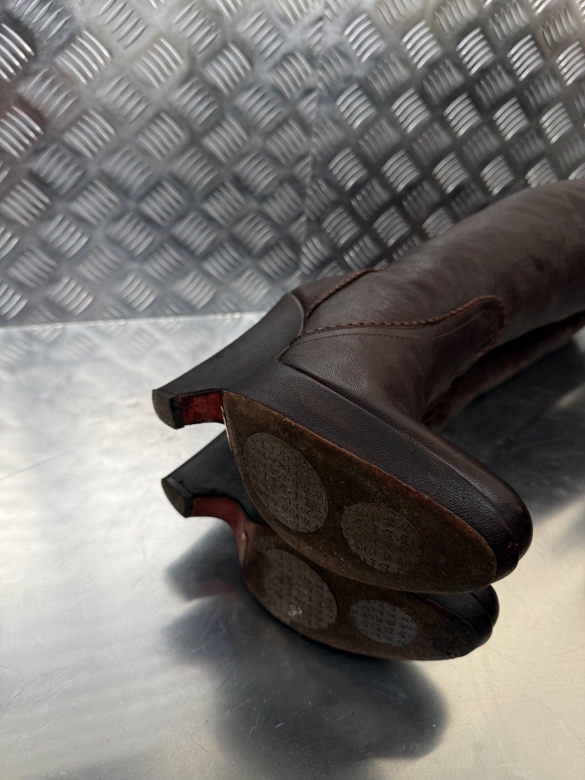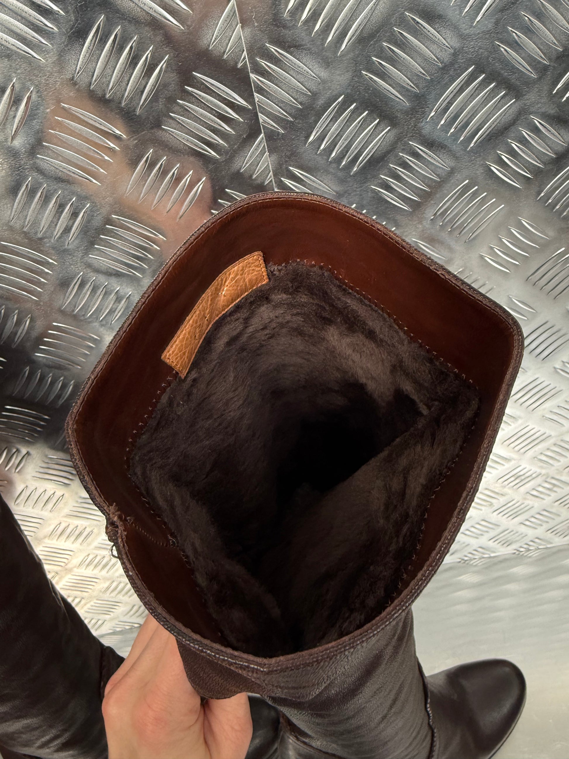 Vintage over-the-knee brown leather boots with a wedge platform heel. Insulated with warm faux fur inside. Gently worn condition — minor scratches and scuffs on leather.