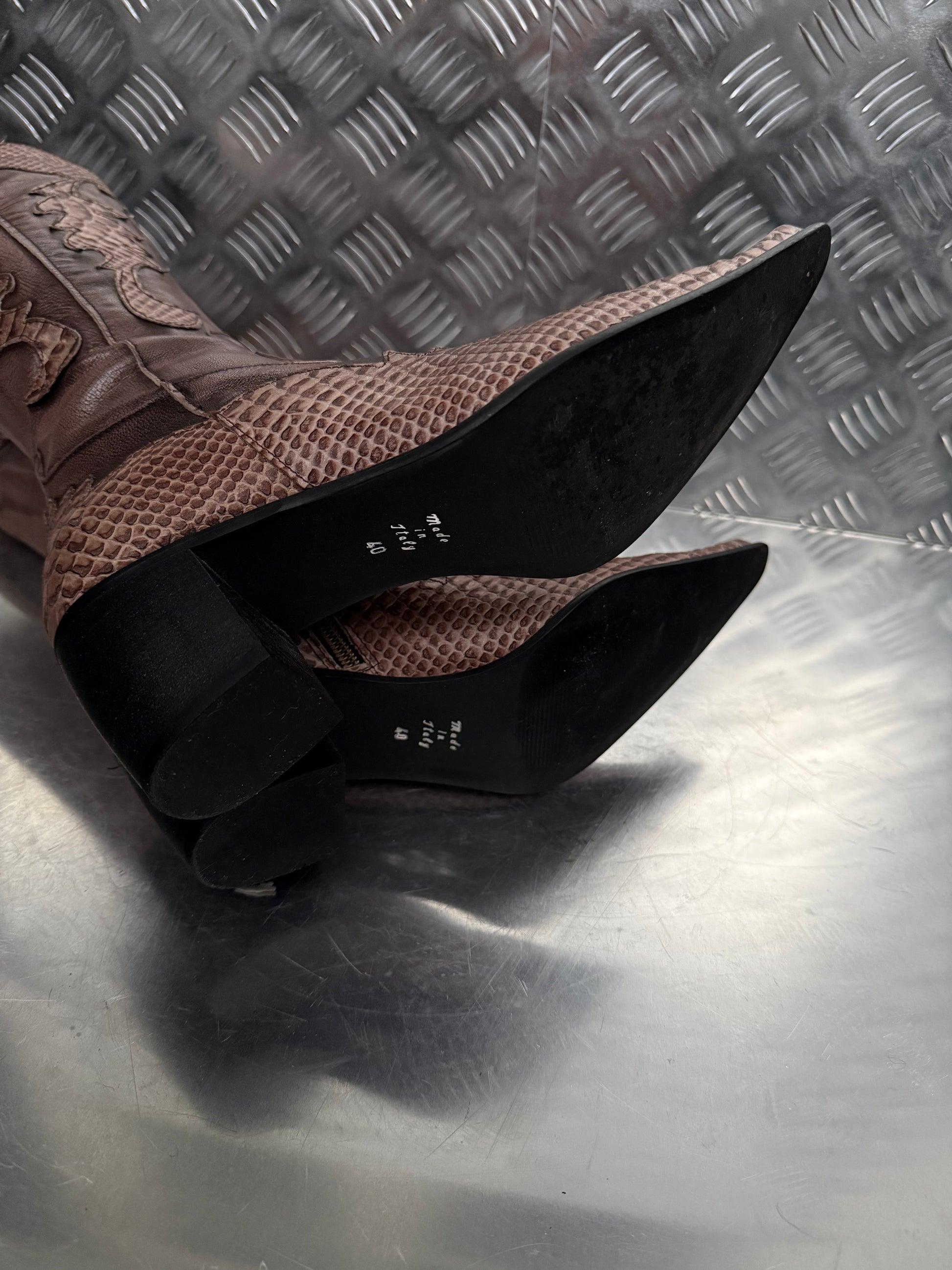 Rare vintage high-top Italian cowboy boots made from genuine leather with intricate snake-embossed textures and decorative western patterns. Deep brown color, structured toe, and chunky mid-heel. Made in Italy. Condition close to perfect — minimal signs of wear.