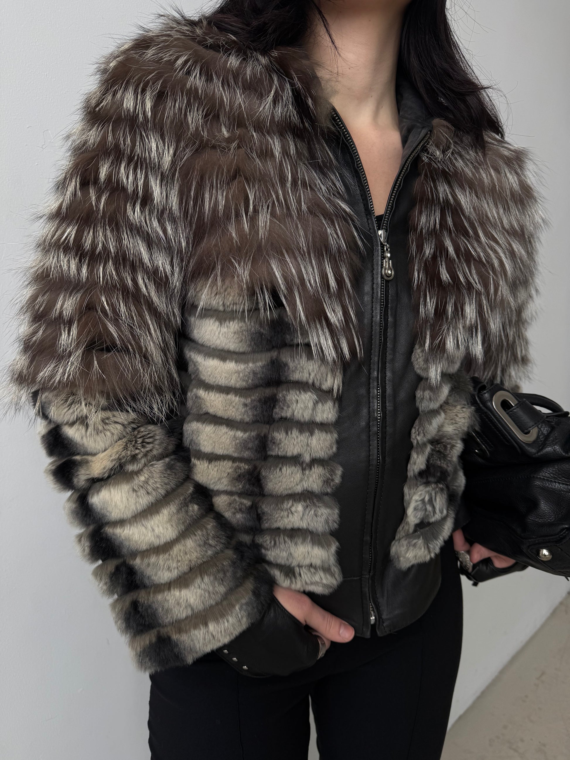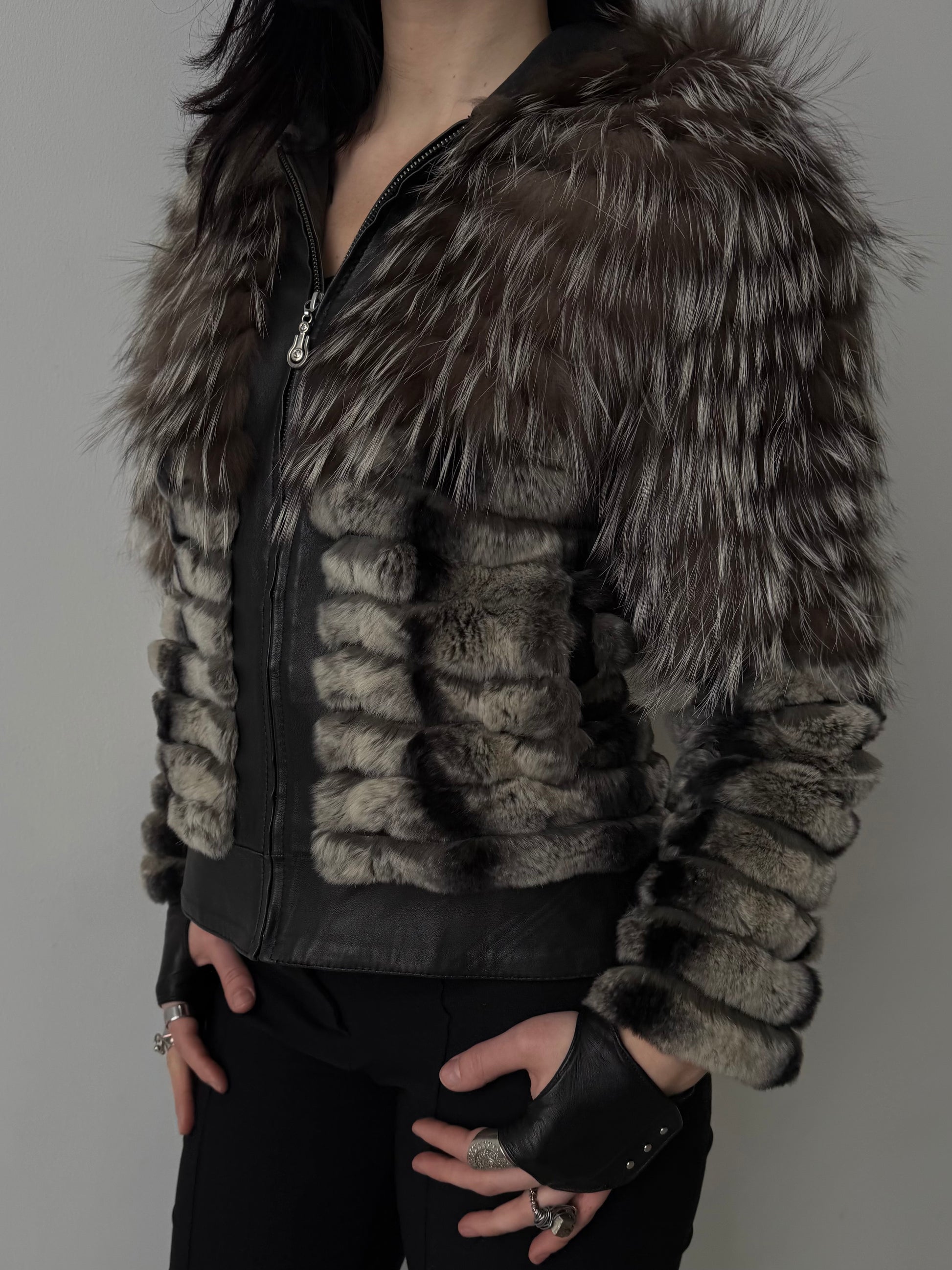 Vintage genuine leather jacket with natural fur and hood TWINKLING GLOBAL