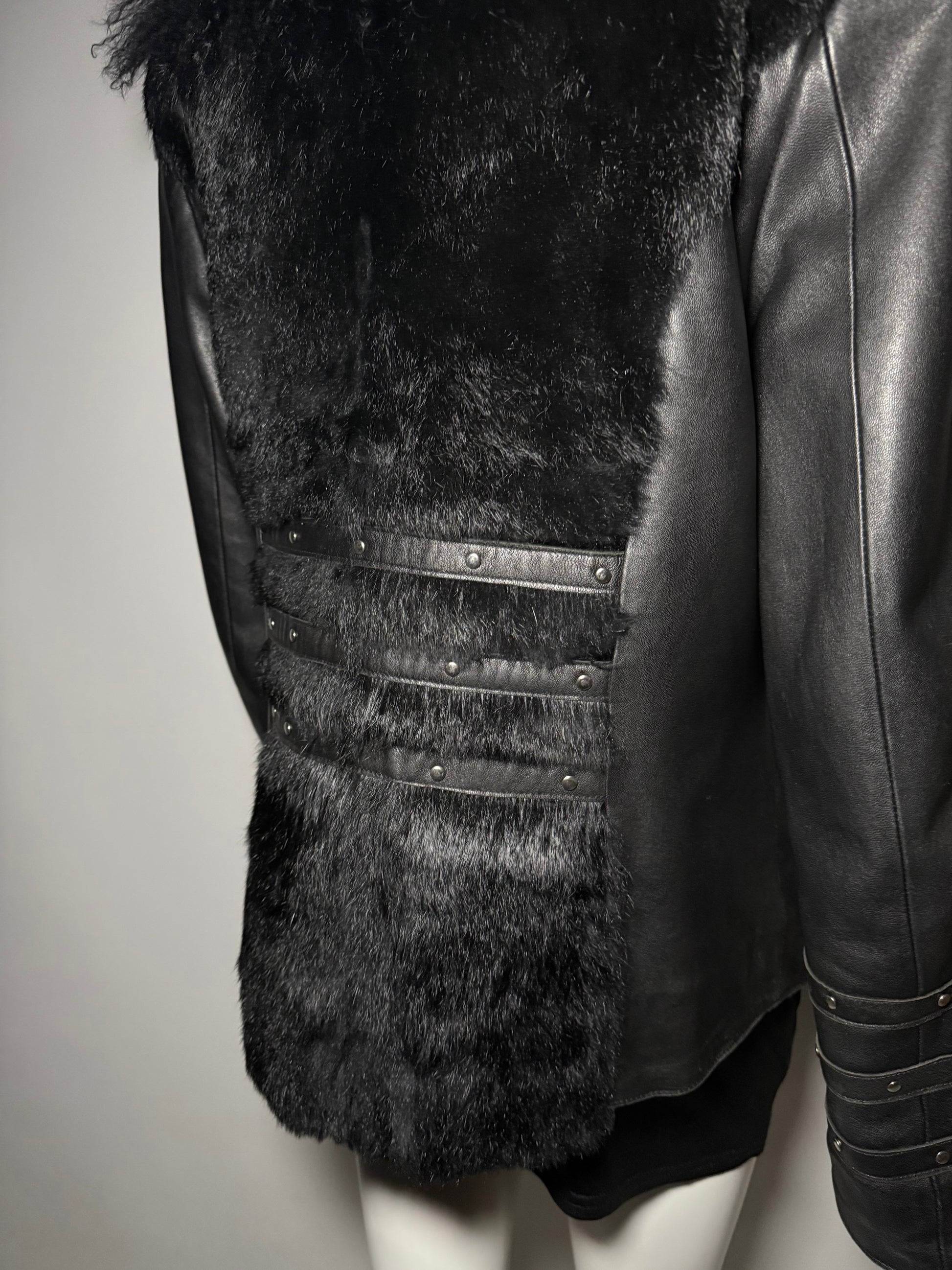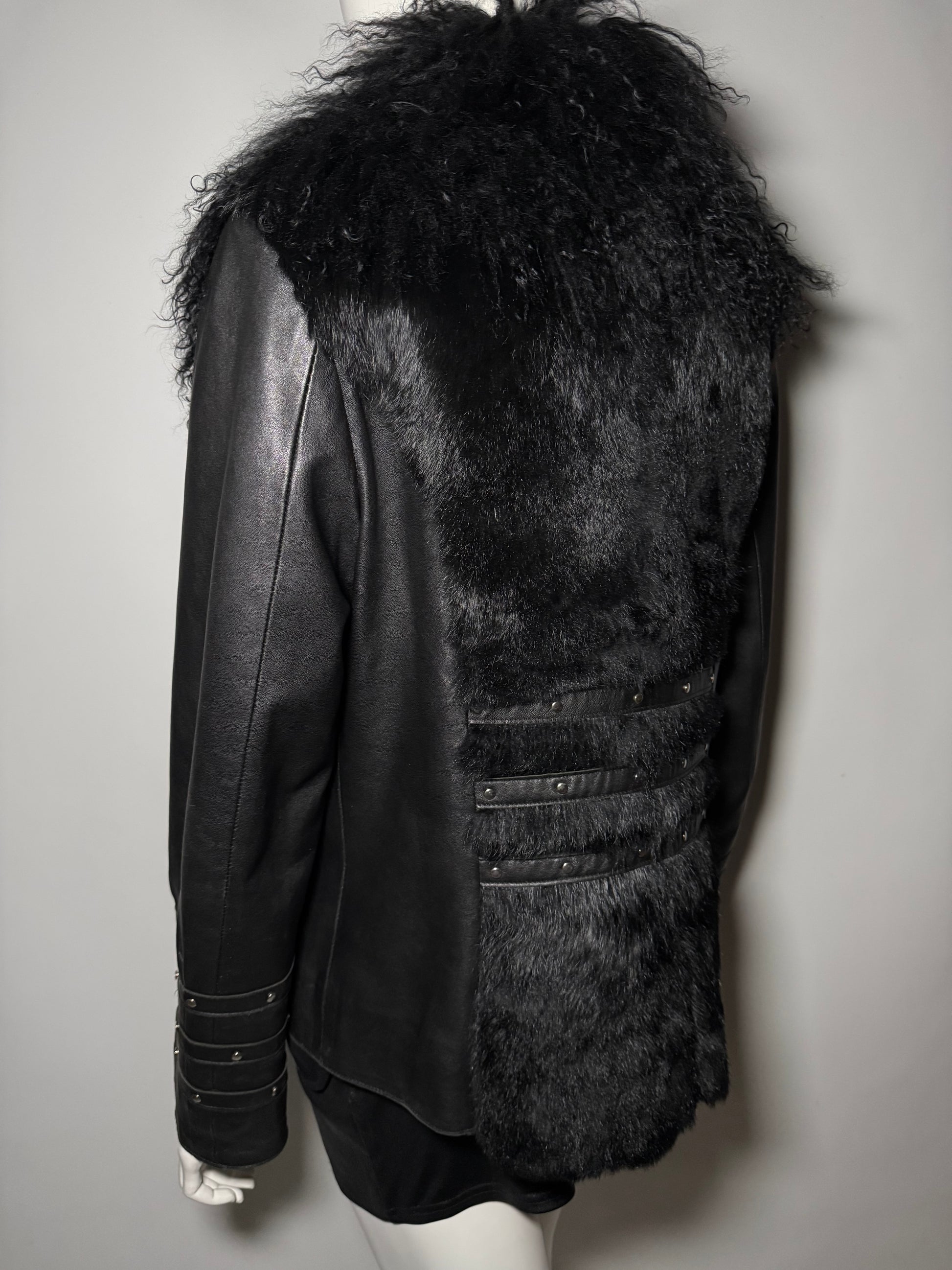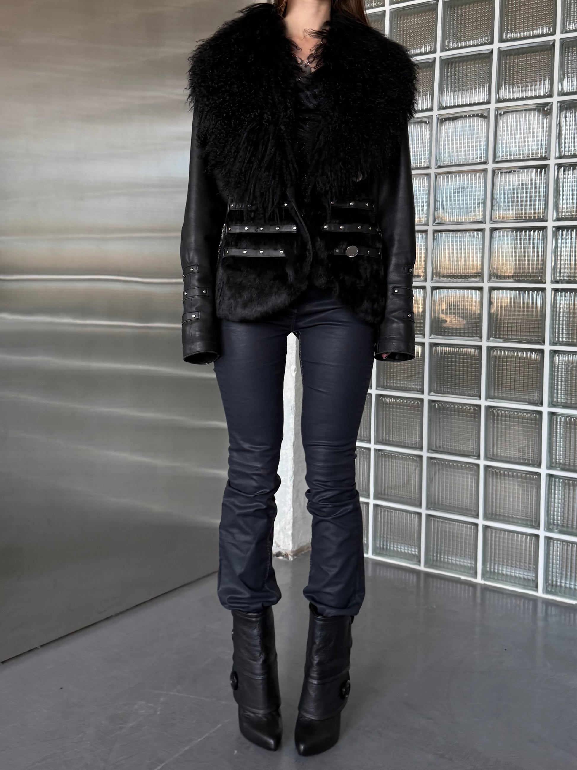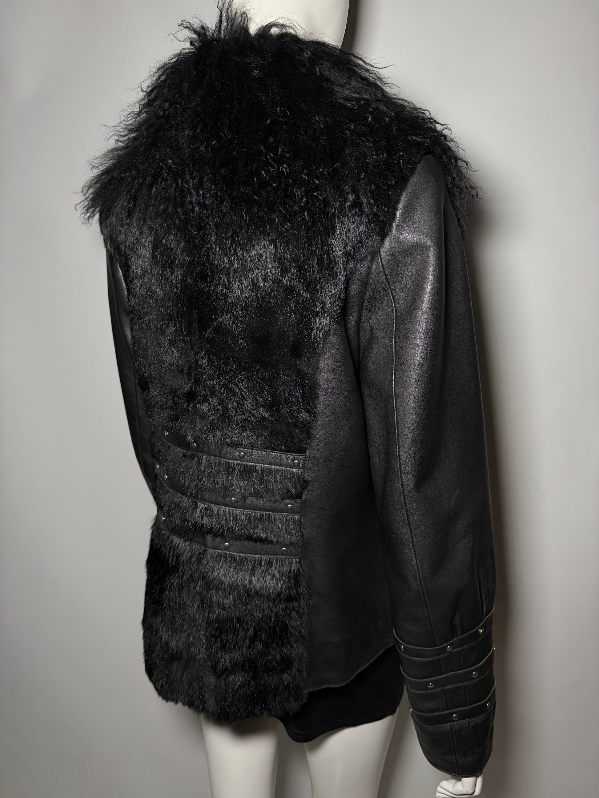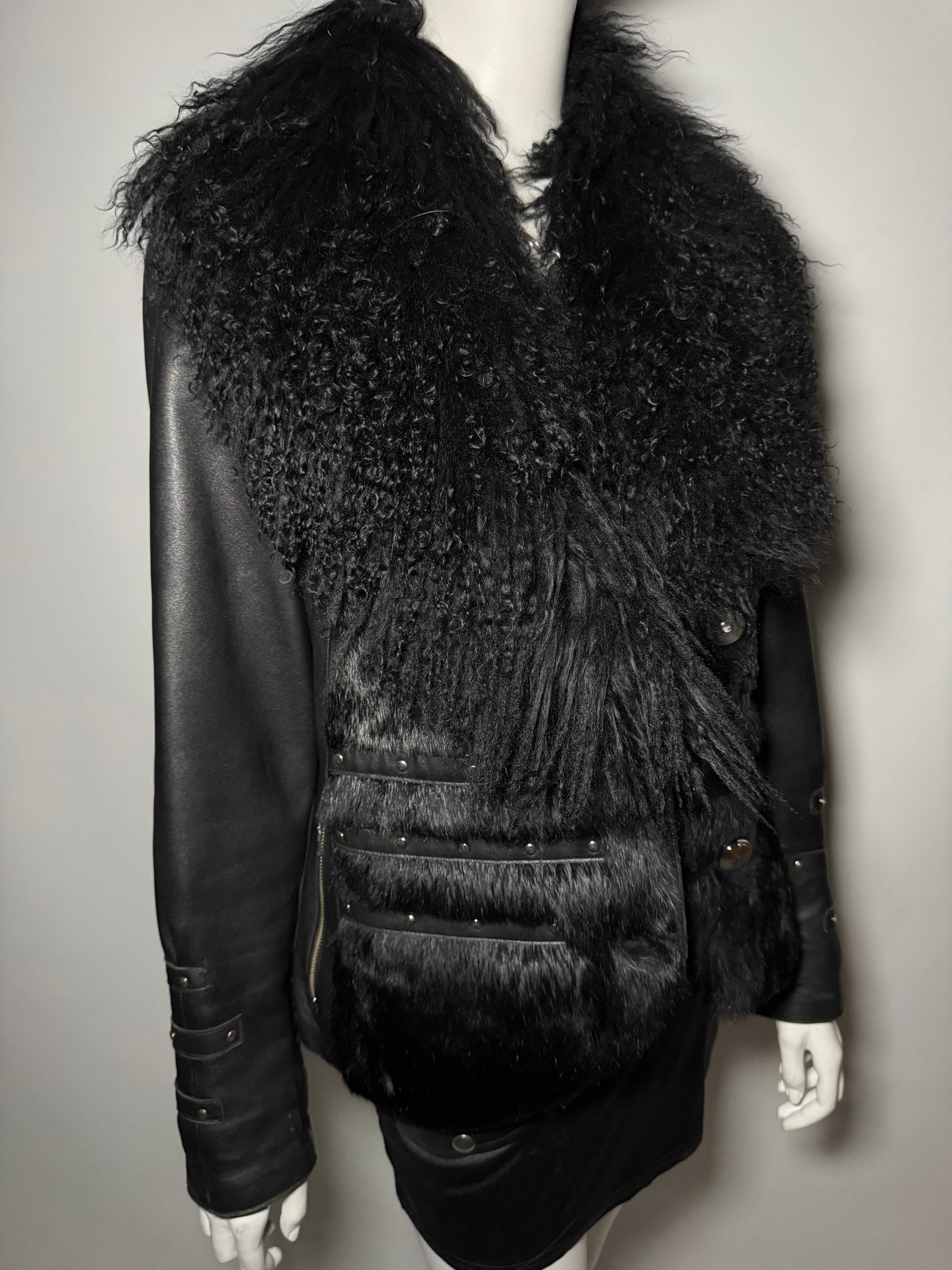 Vintage leather jacket with a luxurious lama fur collar and additional fur panel details. Rich texture, structured silhouette, bold dramatic look. Great condition — light signs of wear on fur near one button, barely noticeable when worn closed. Fits S–M as an oversized silhouette and M as a regular fit. Carefully review the photos