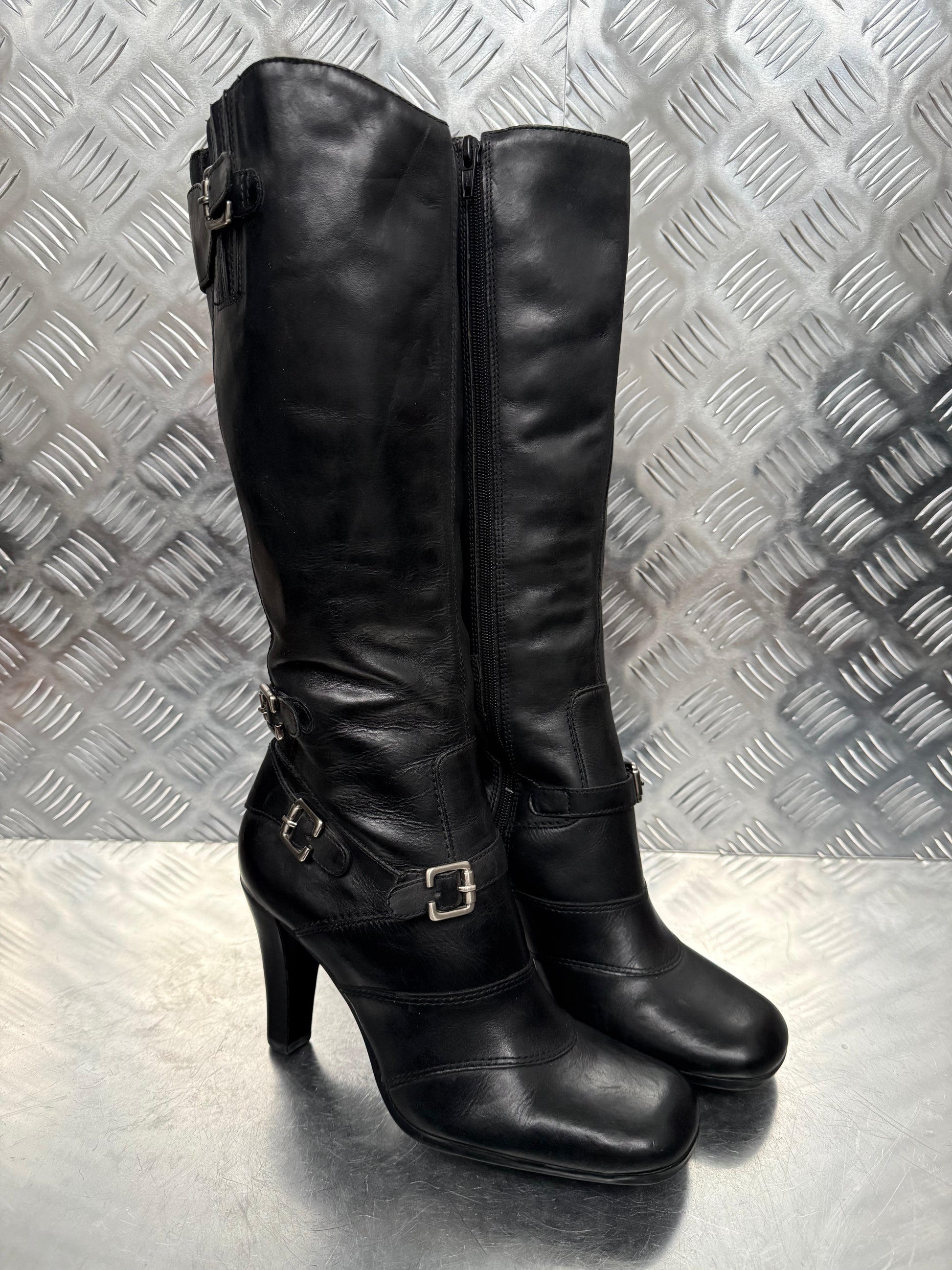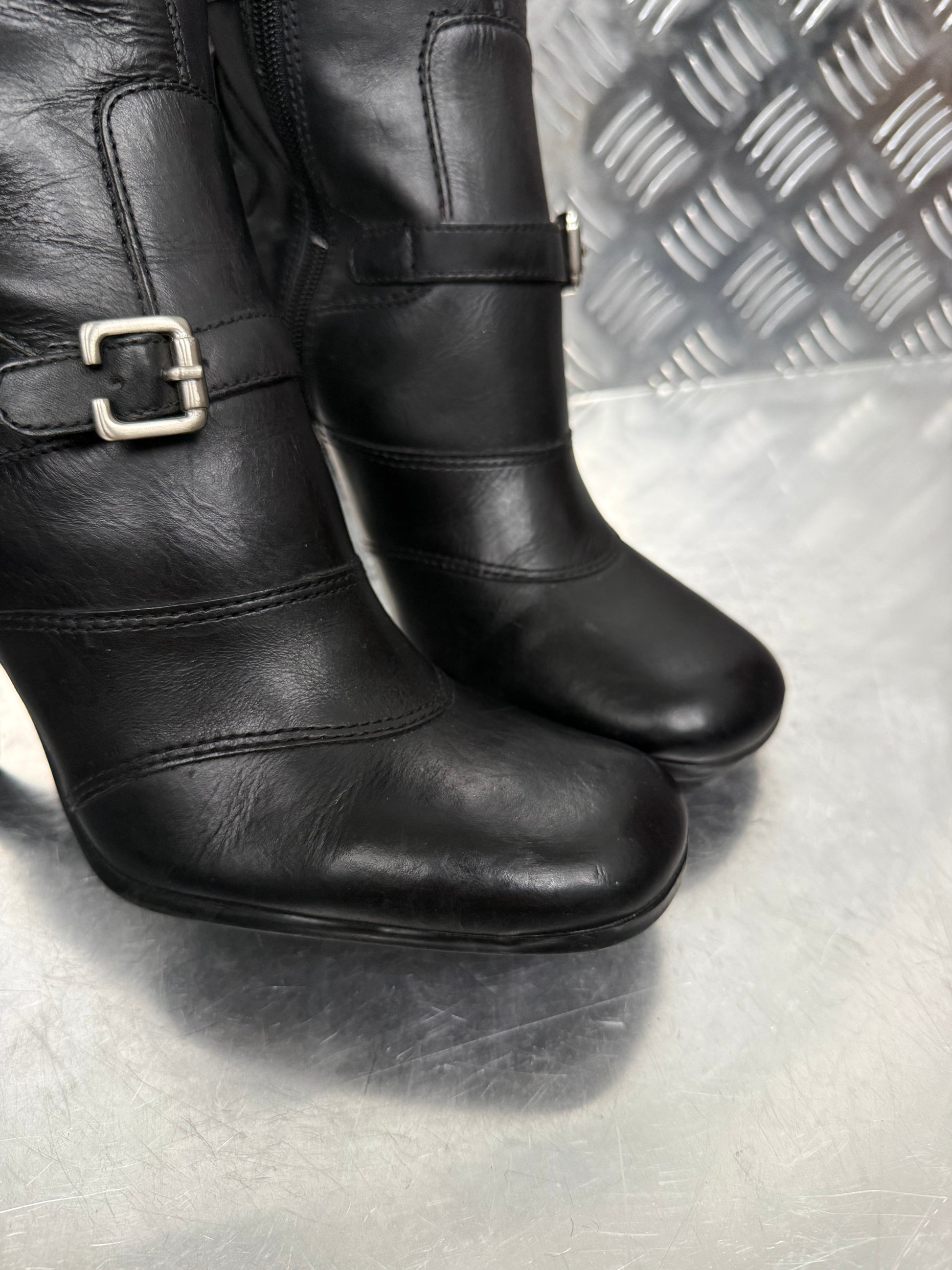 Vintage Bronx black leather boots with a sleek silhouette and buckle details.