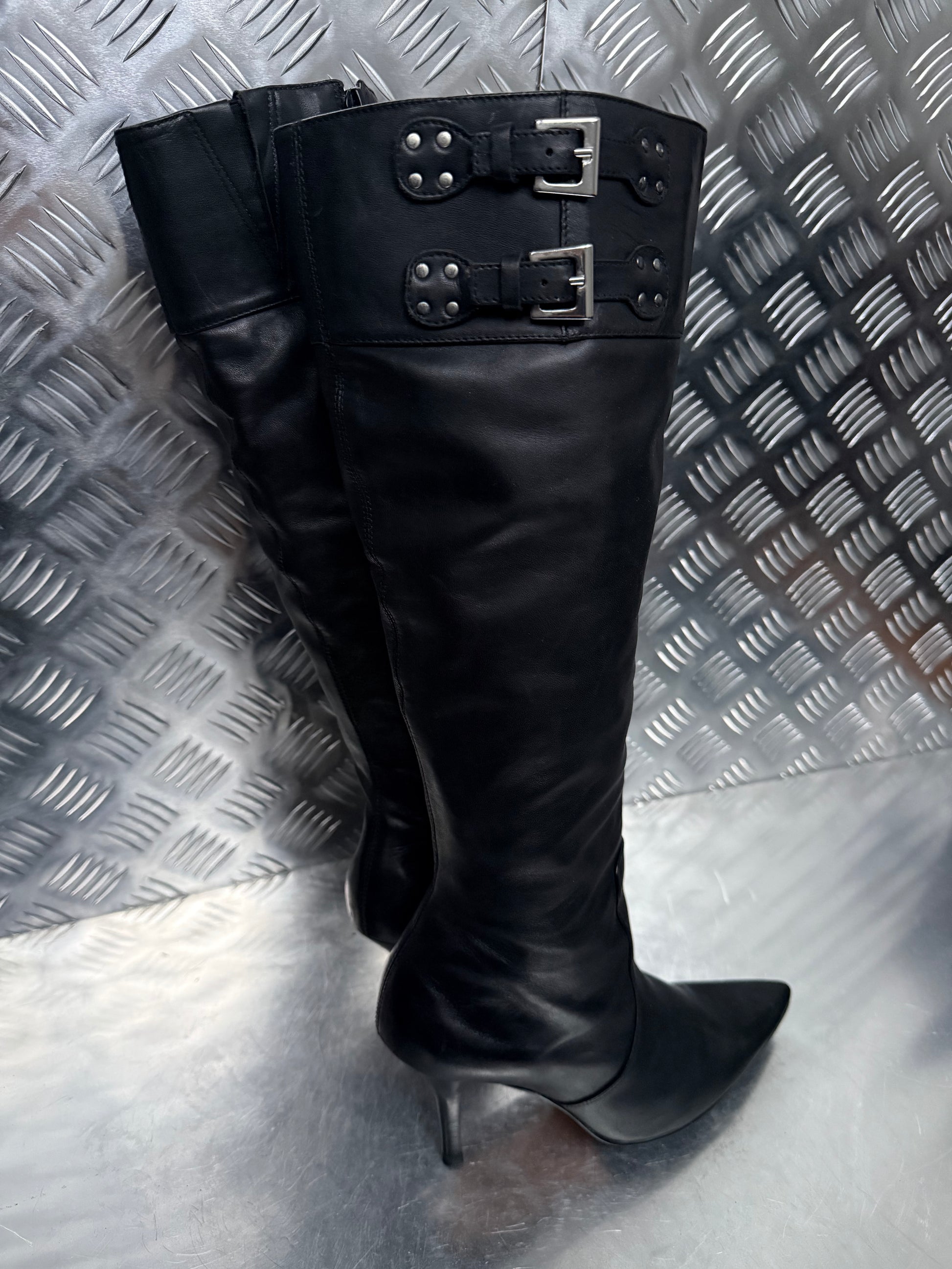 Vintage leather knee-high boots by BUFFALO with pointed toe and slim stiletto heel. Decorated with signature double buckle straps at the top. Timeless silhouette and soft leather construction. Excellent condition.
