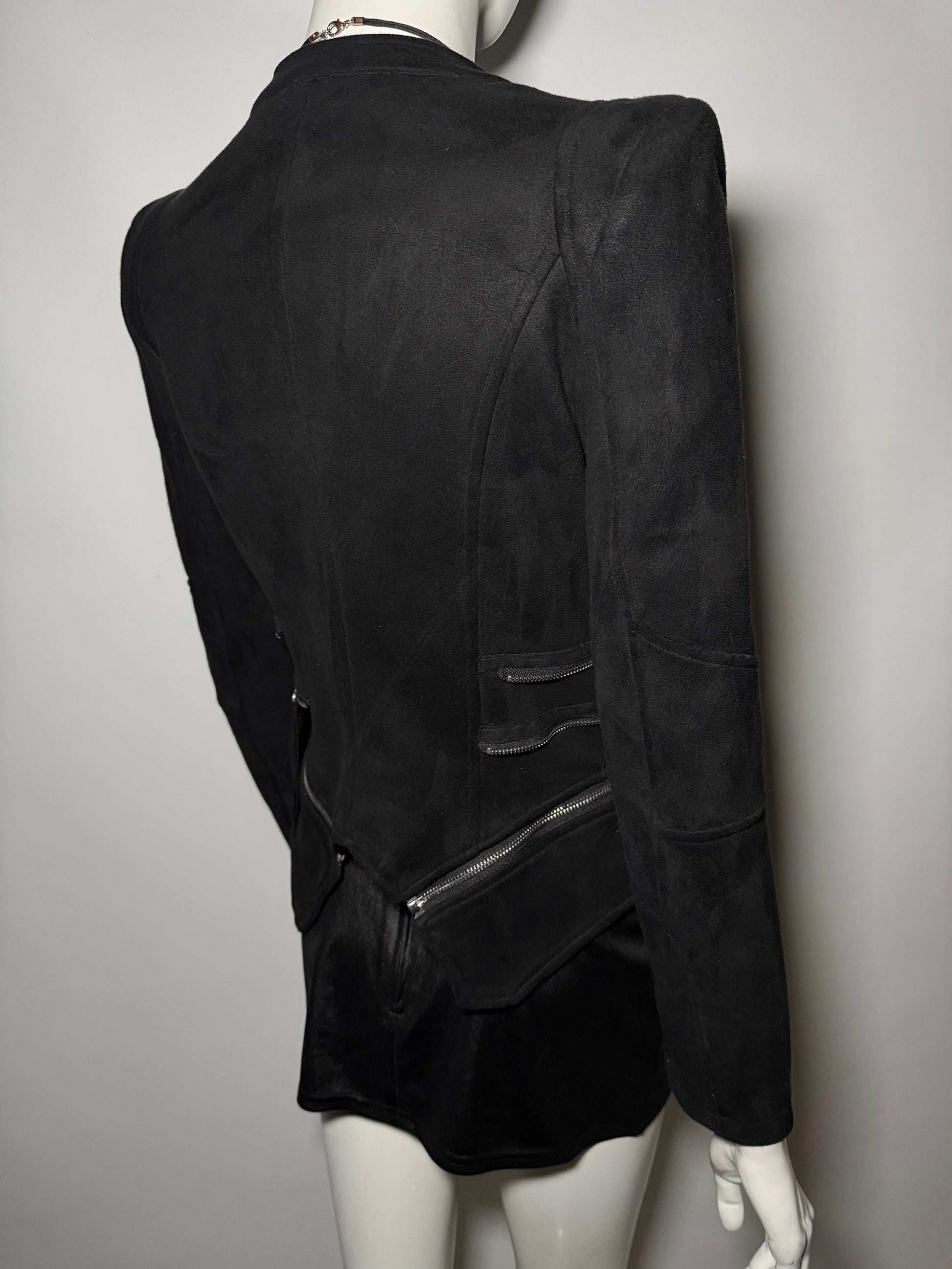 Vintage fitted jacket in a soft faux-suede-like material. Structured silhouette with metal zippers and a flattering shape. Excellent condition — sleek, edgy, and form-fitting.