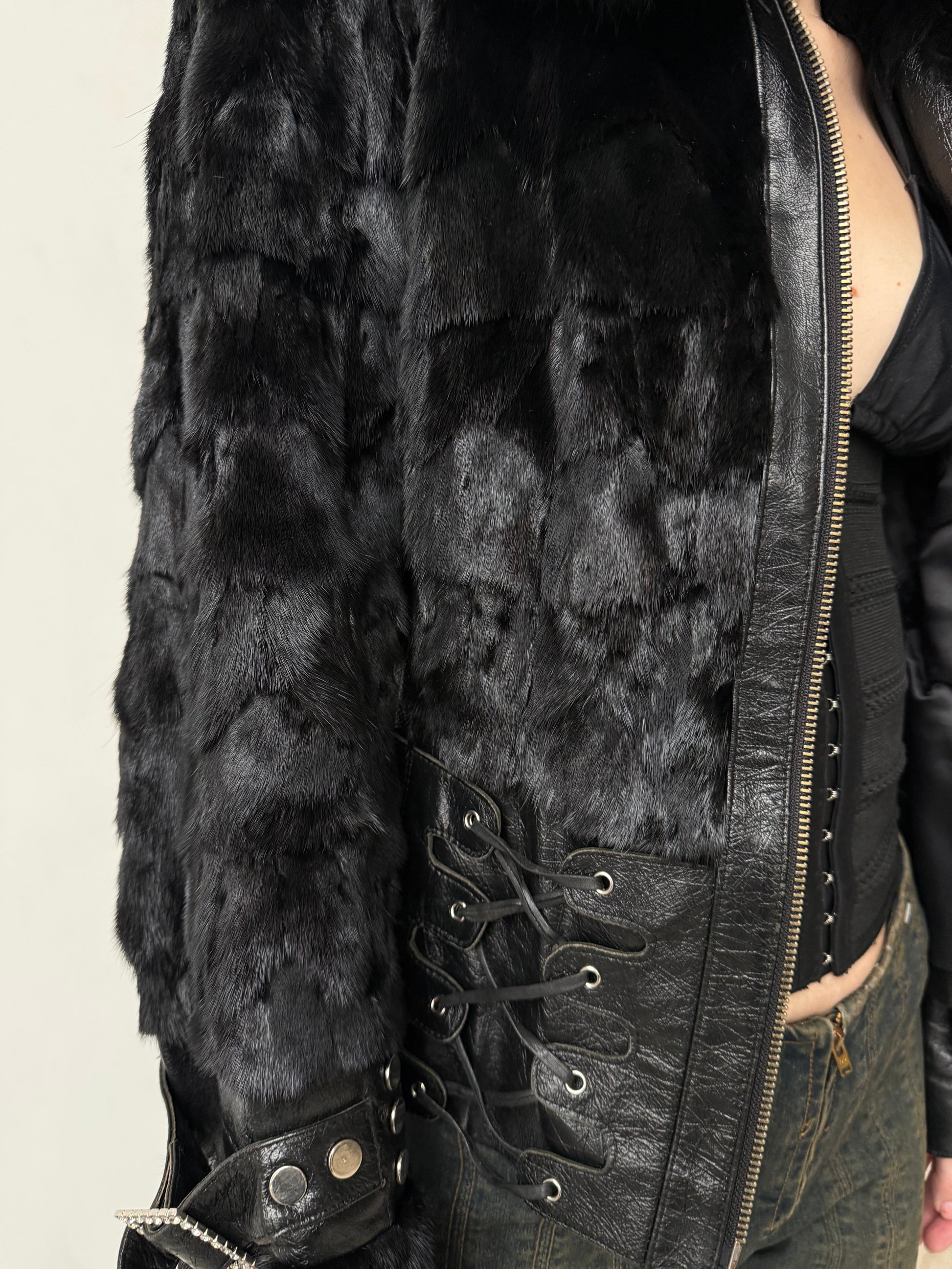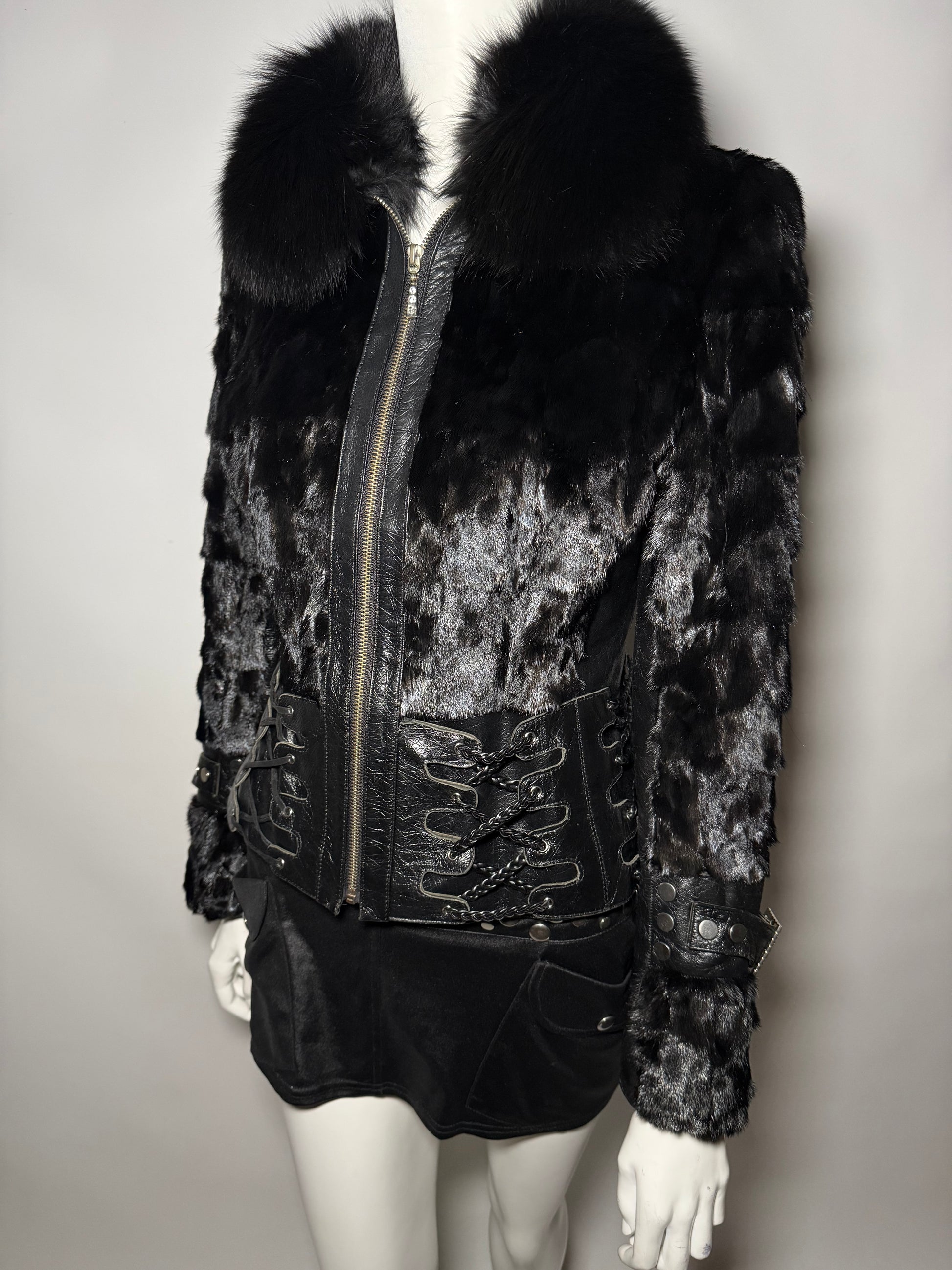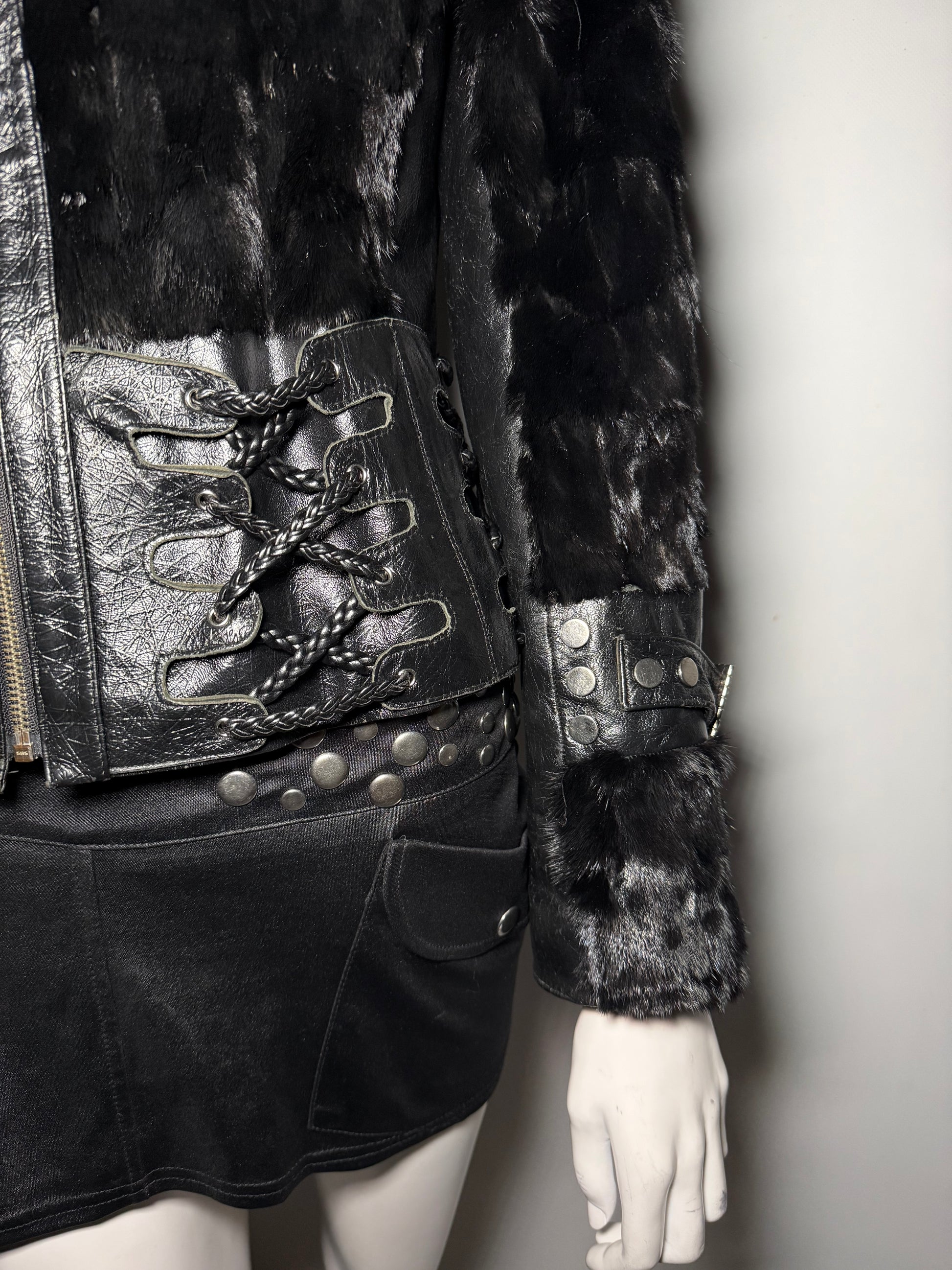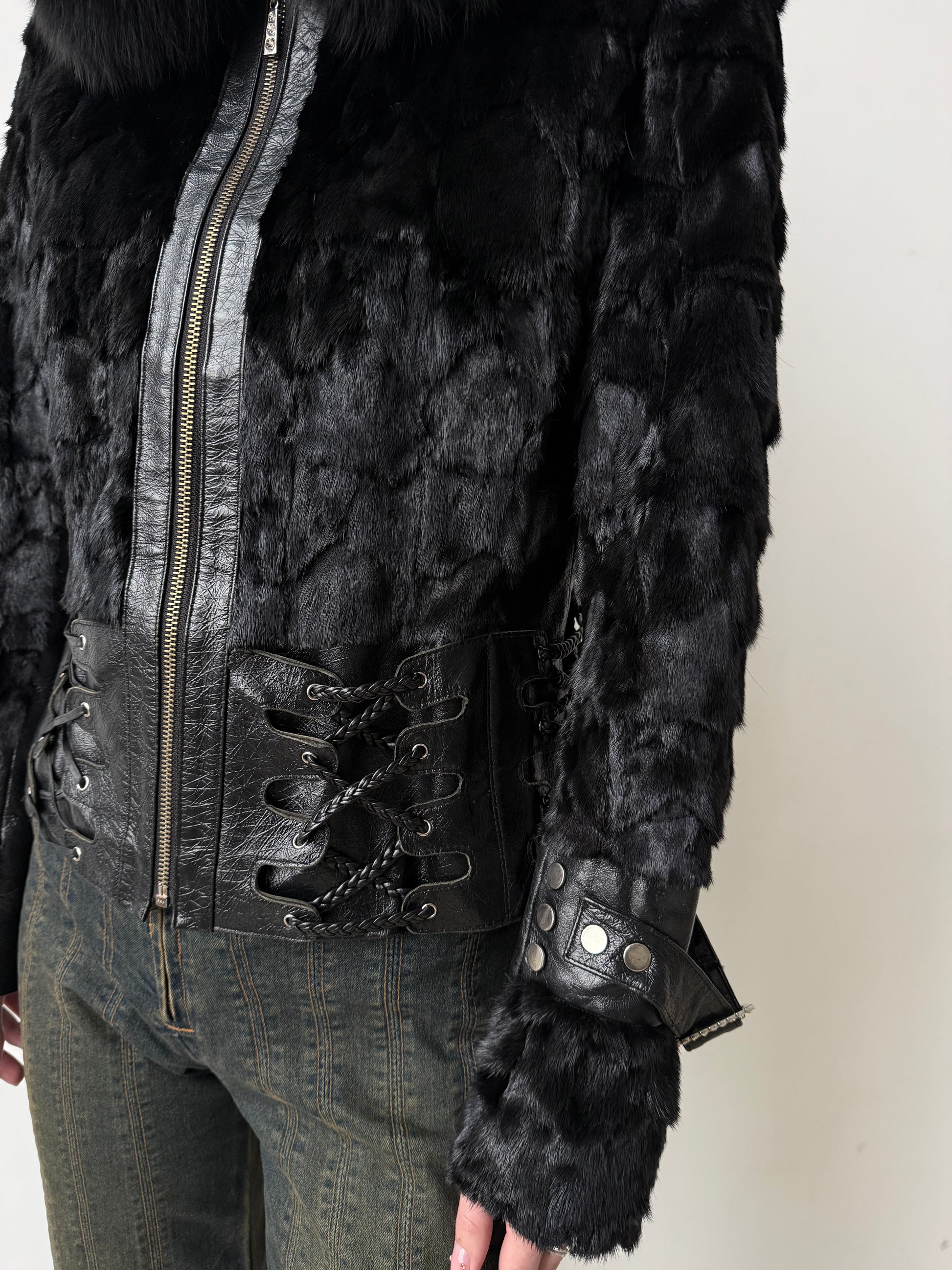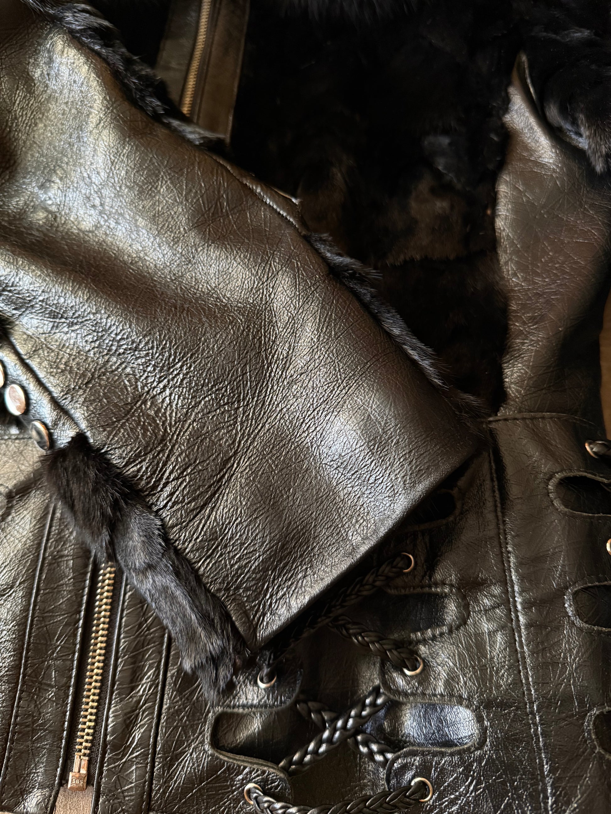 Vintage fitted leather jacket with real fur body and collar. Decorative lace-up detailing on the sides and sleeves. Zip closure. Very good vintage condition — minor scuffs on the leather, slight wear on the fur sleeves, and a small flaw on the edge of one cuff (shown in the last photos).