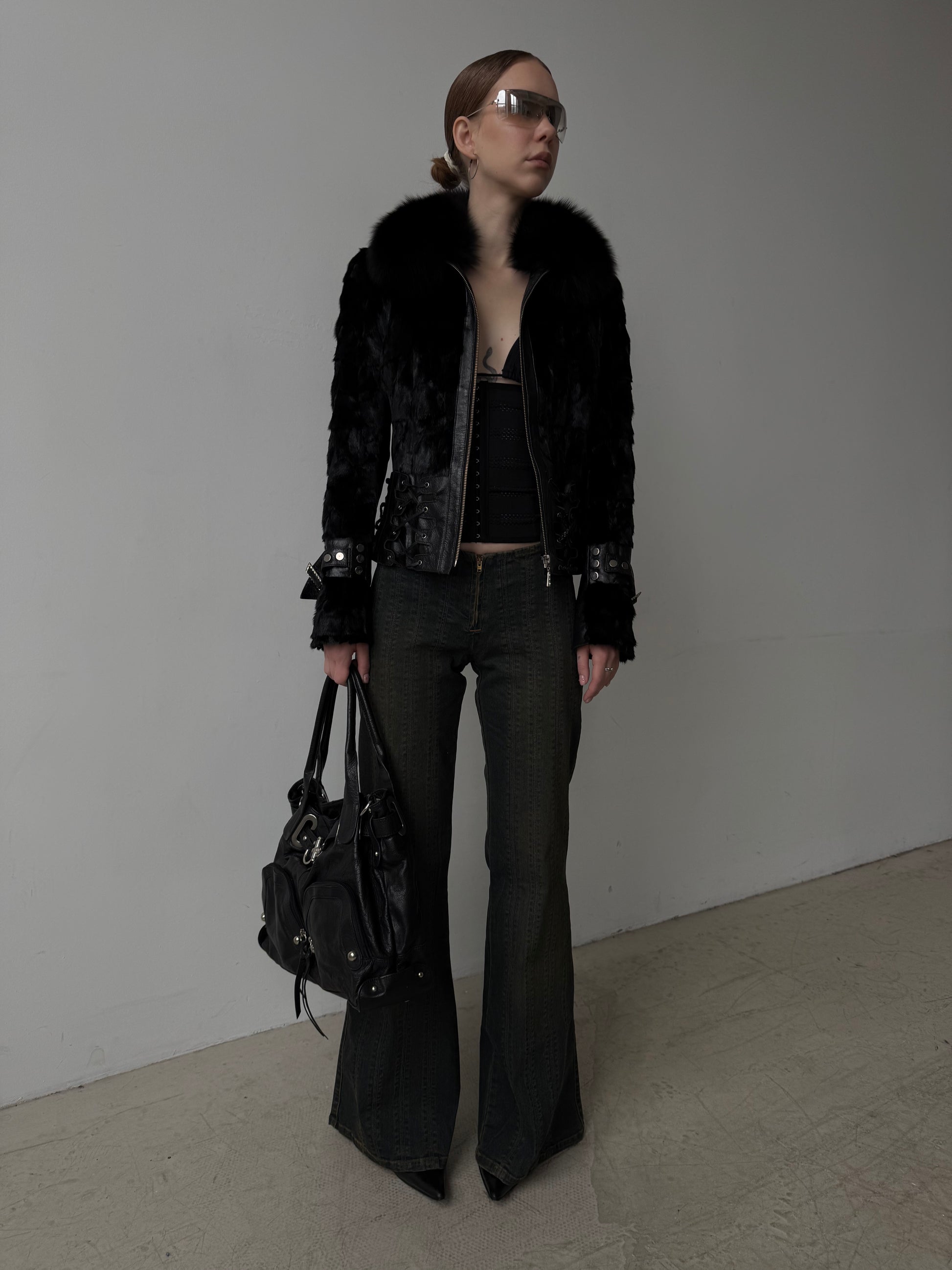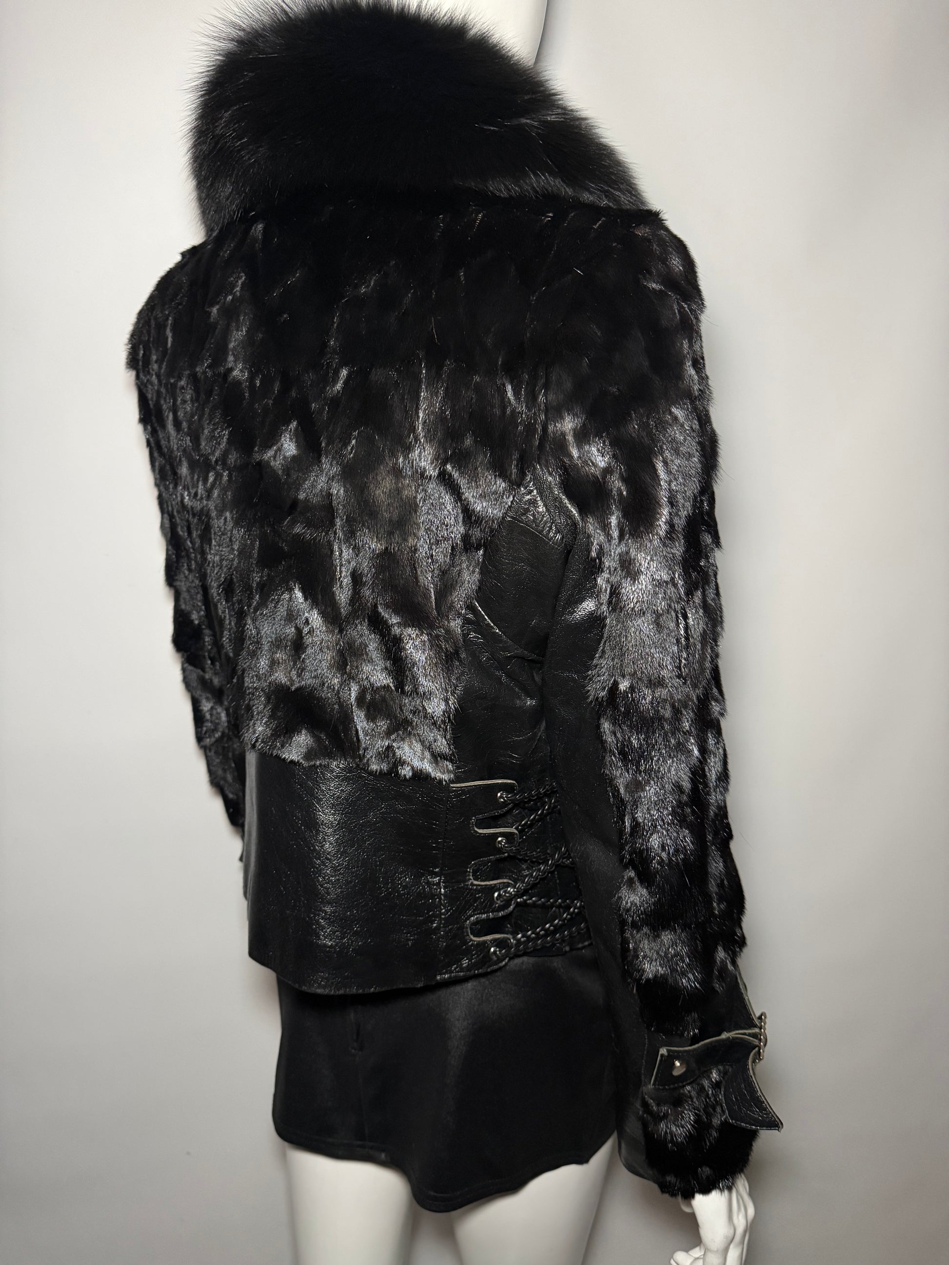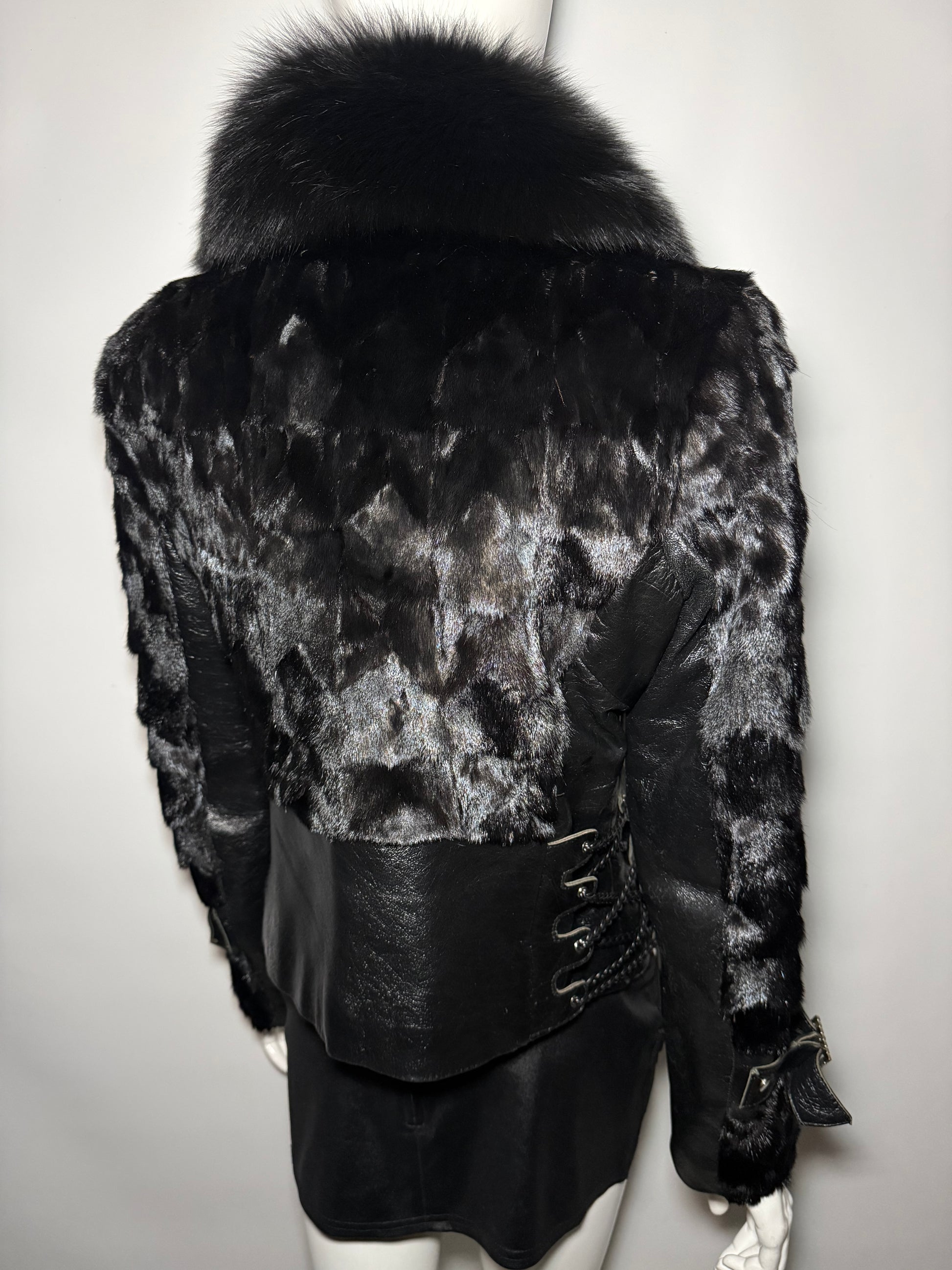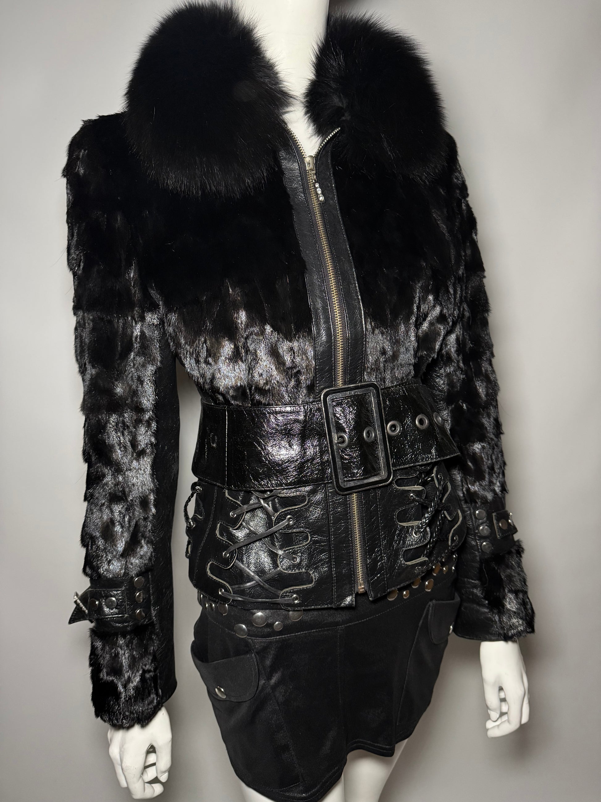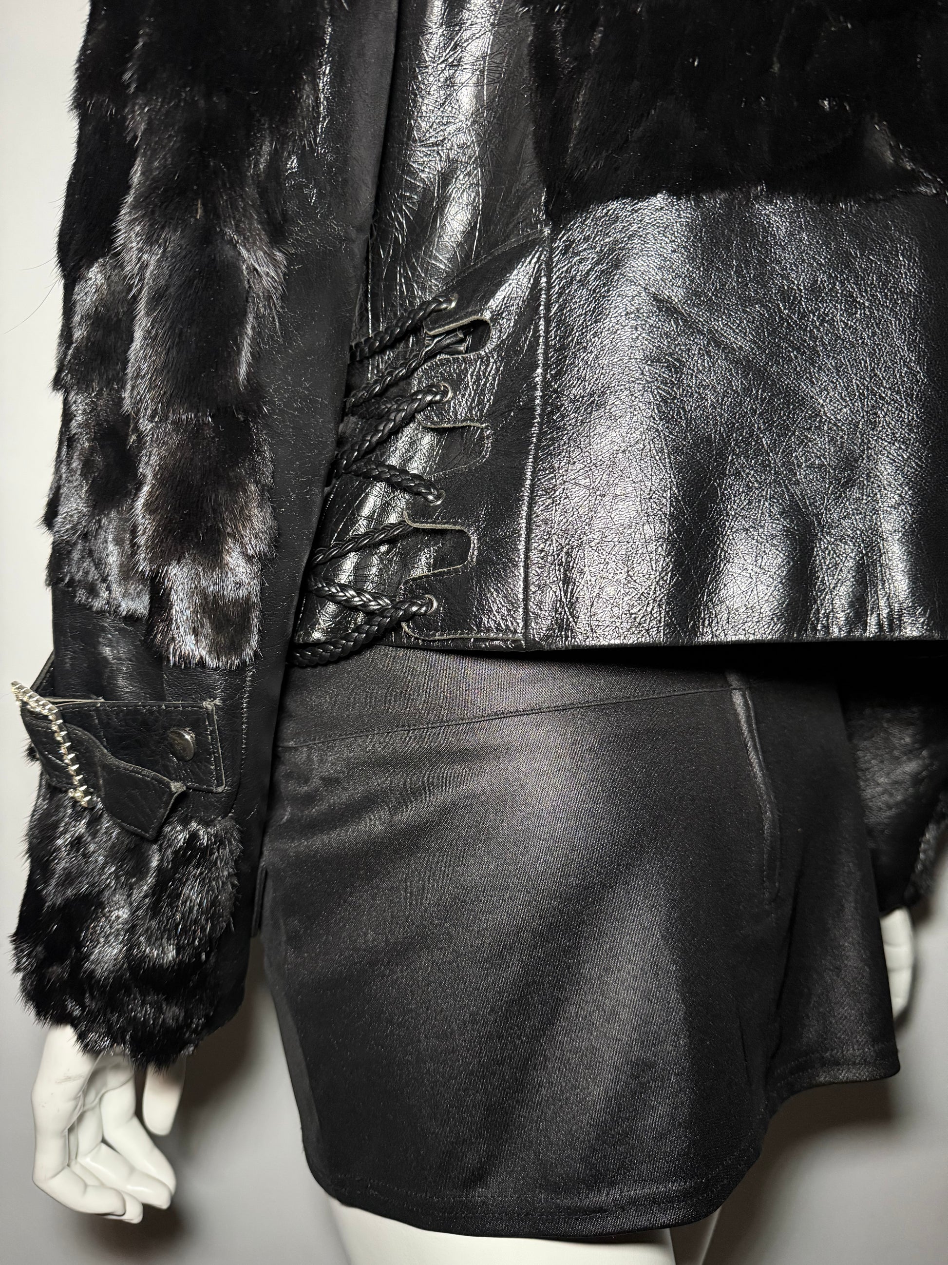 Vintage fitted leather jacket with real fur body and collar. Decorative lace-up detailing on the sides and sleeves. Zip closure. Very good vintage condition — minor scuffs on the leather, slight wear on the fur sleeves, and a small flaw on the edge of one cuff (shown in the last photos).