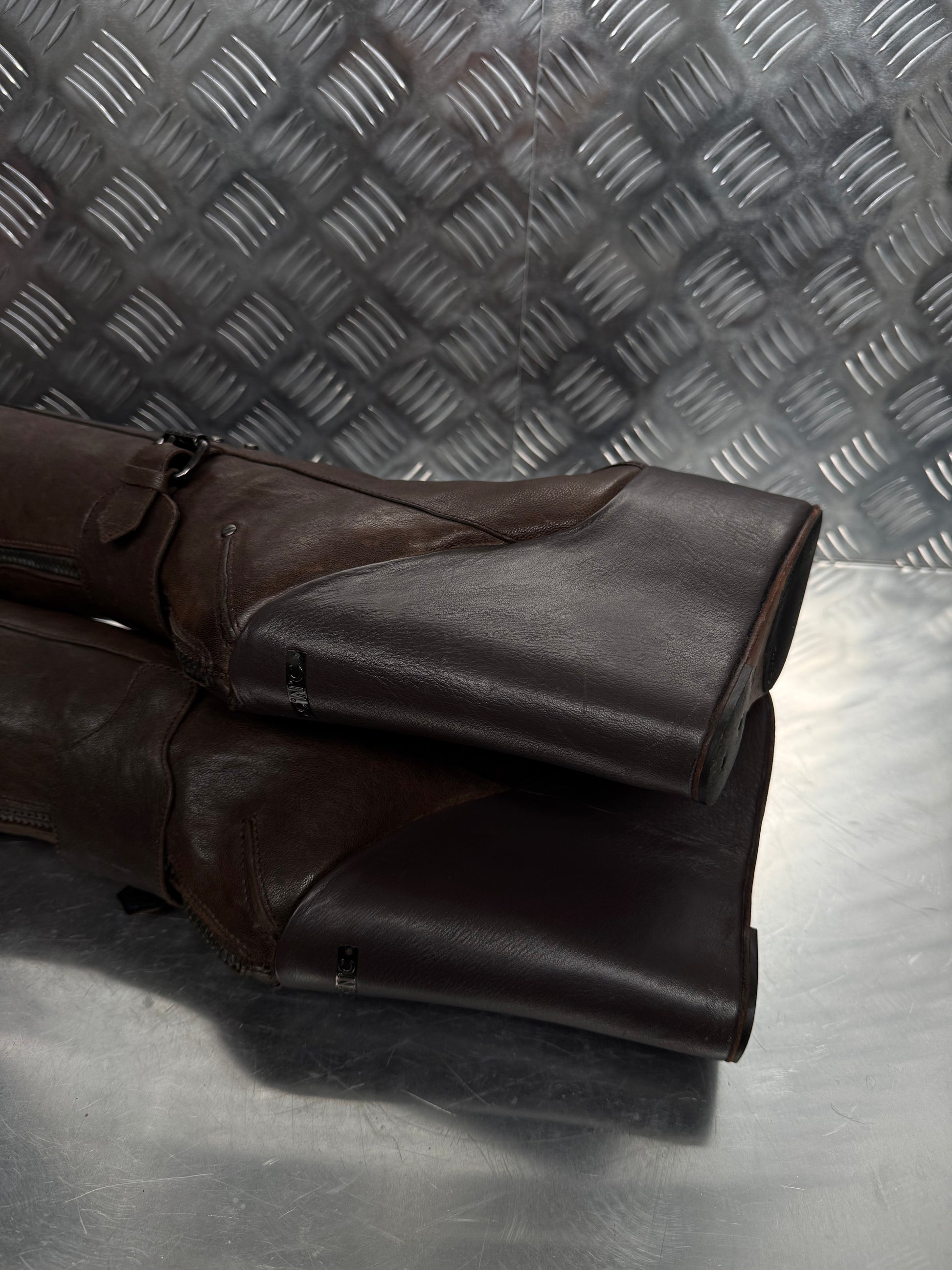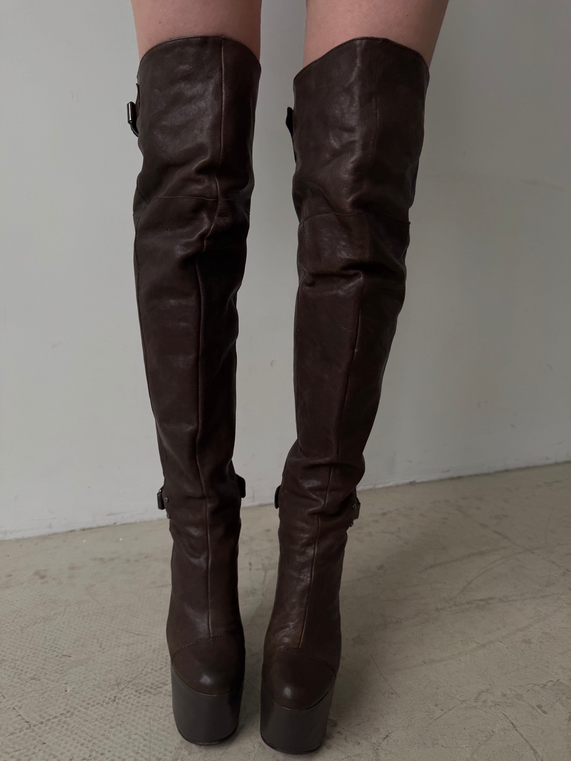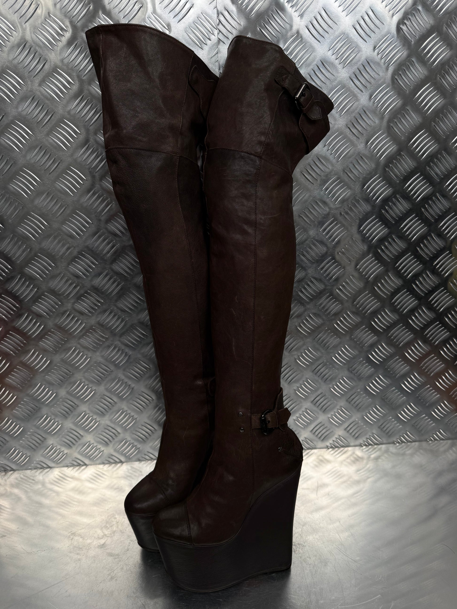Stunning vintage leather over-the-knee boots by CNC. Deep brown color, made in Italy. Crafted from soft genuine leather with a bold wedge sole and decorative buckles. Good vintage condition