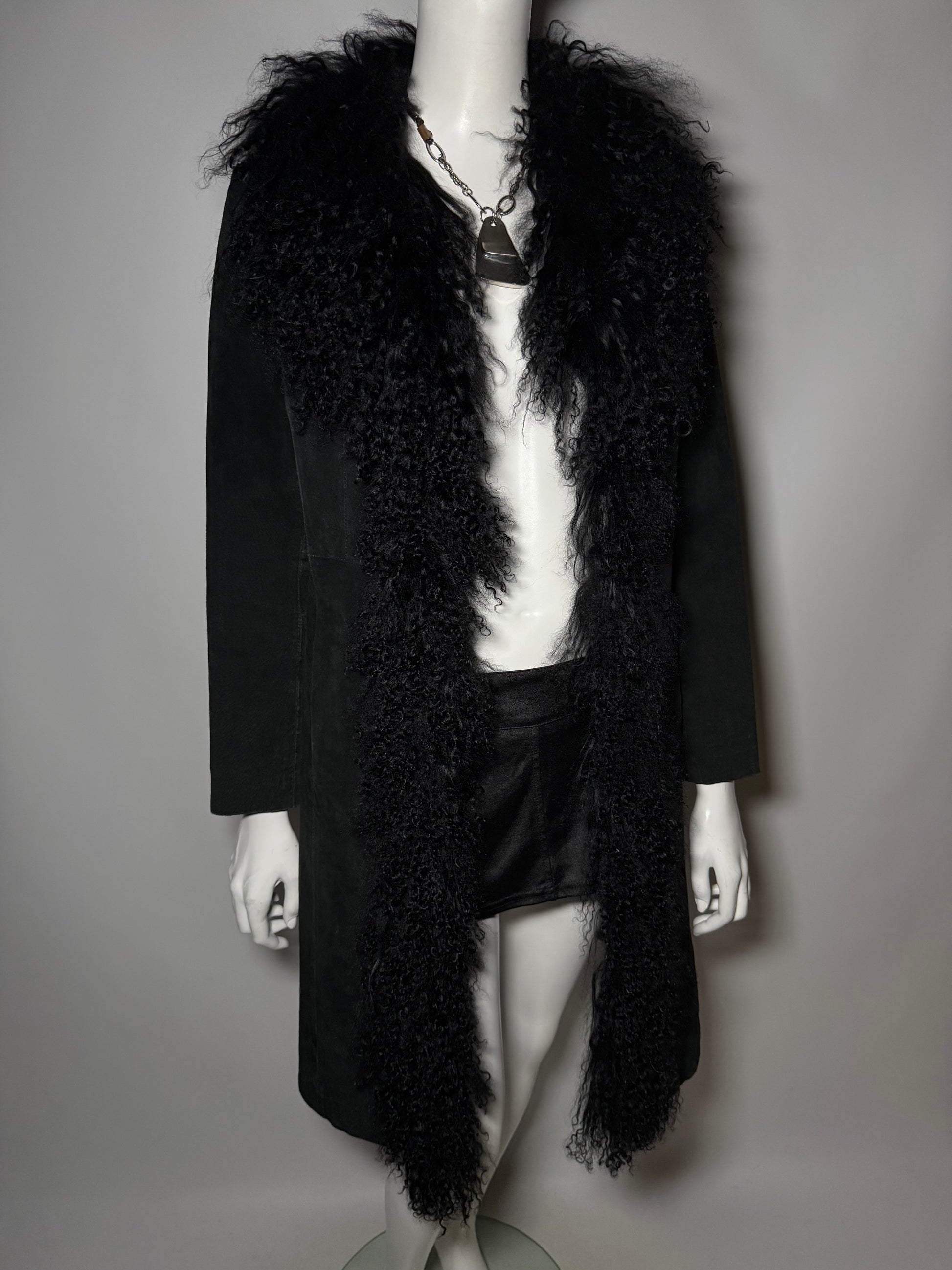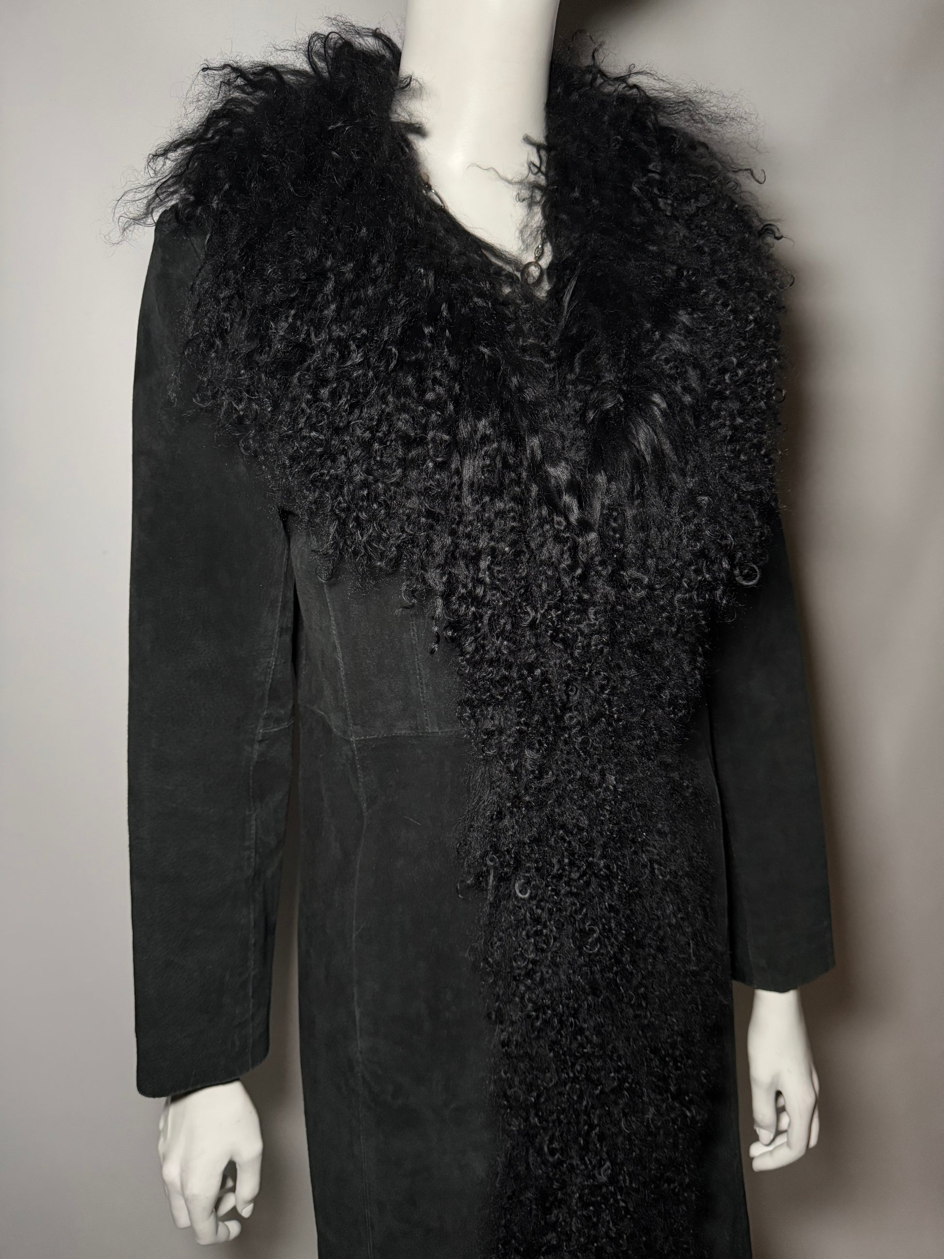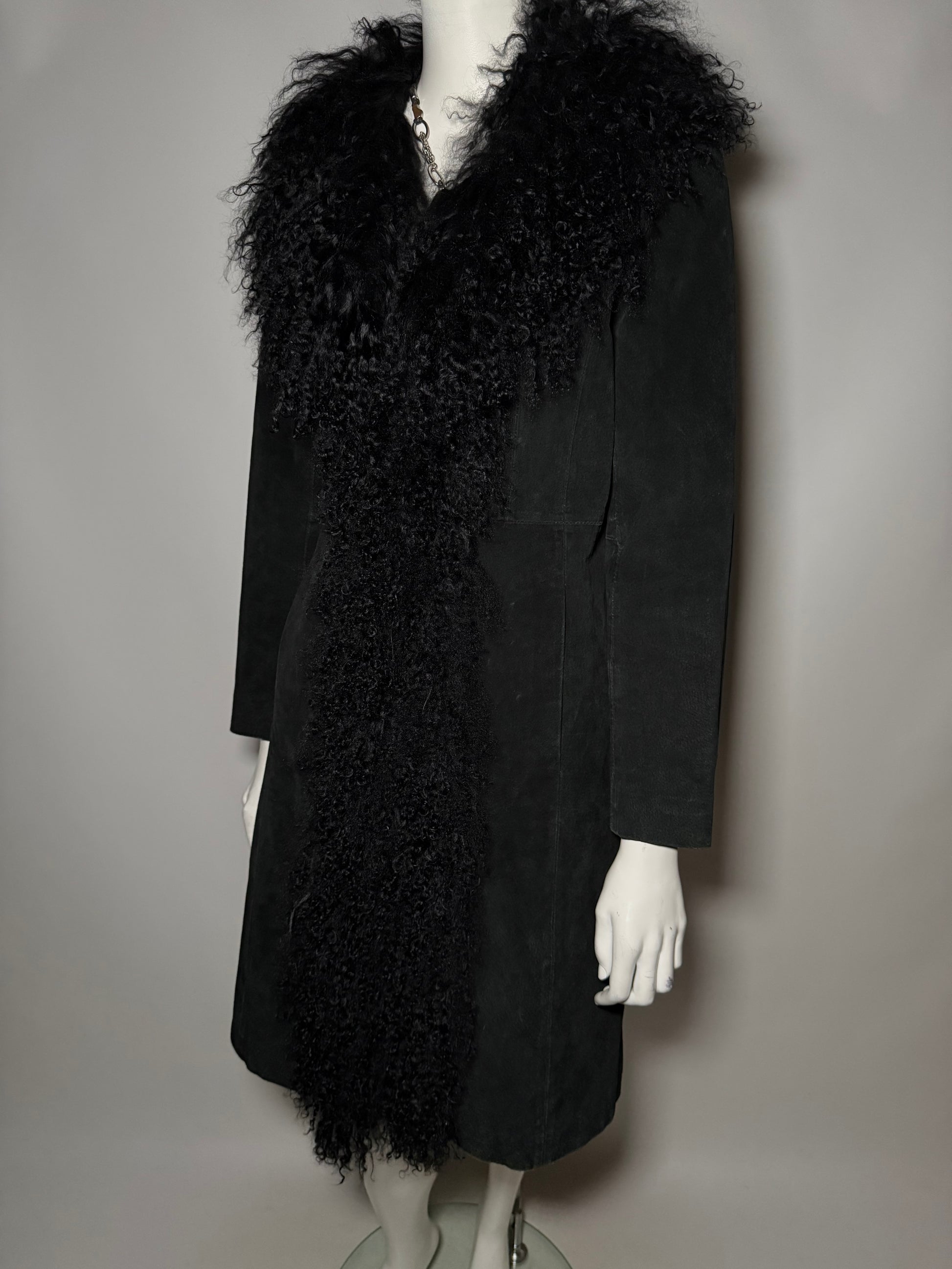 Vintage suede Penny Lane/Afghan coat with genuine llama-fur trim. Rich black tone, soft hand, and a classic longline silhouette. Good vintage condition; light wear on the suede — please review photos. Genuine leather suede