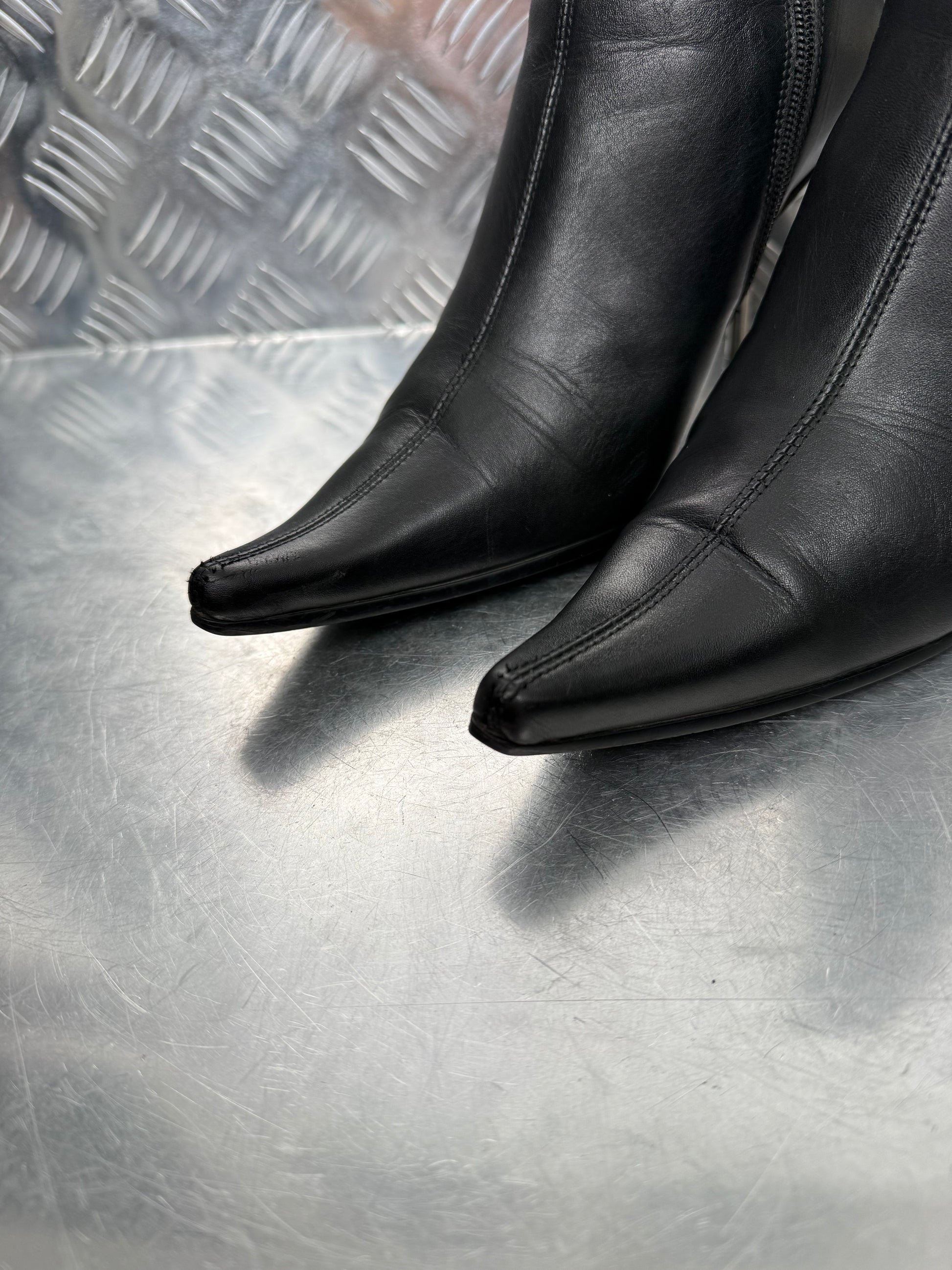 These vintage Italian ankle boots are crafted from genuine black leather and feature a sleek pointed toe with a metallic stiletto heel. Side zip closure and a clean, sharp silhouette make them a timeless statement pair. Good vintage condition with minor scuffs on the toe area and heel. Please zoom in and review all photos carefully before placing your order.