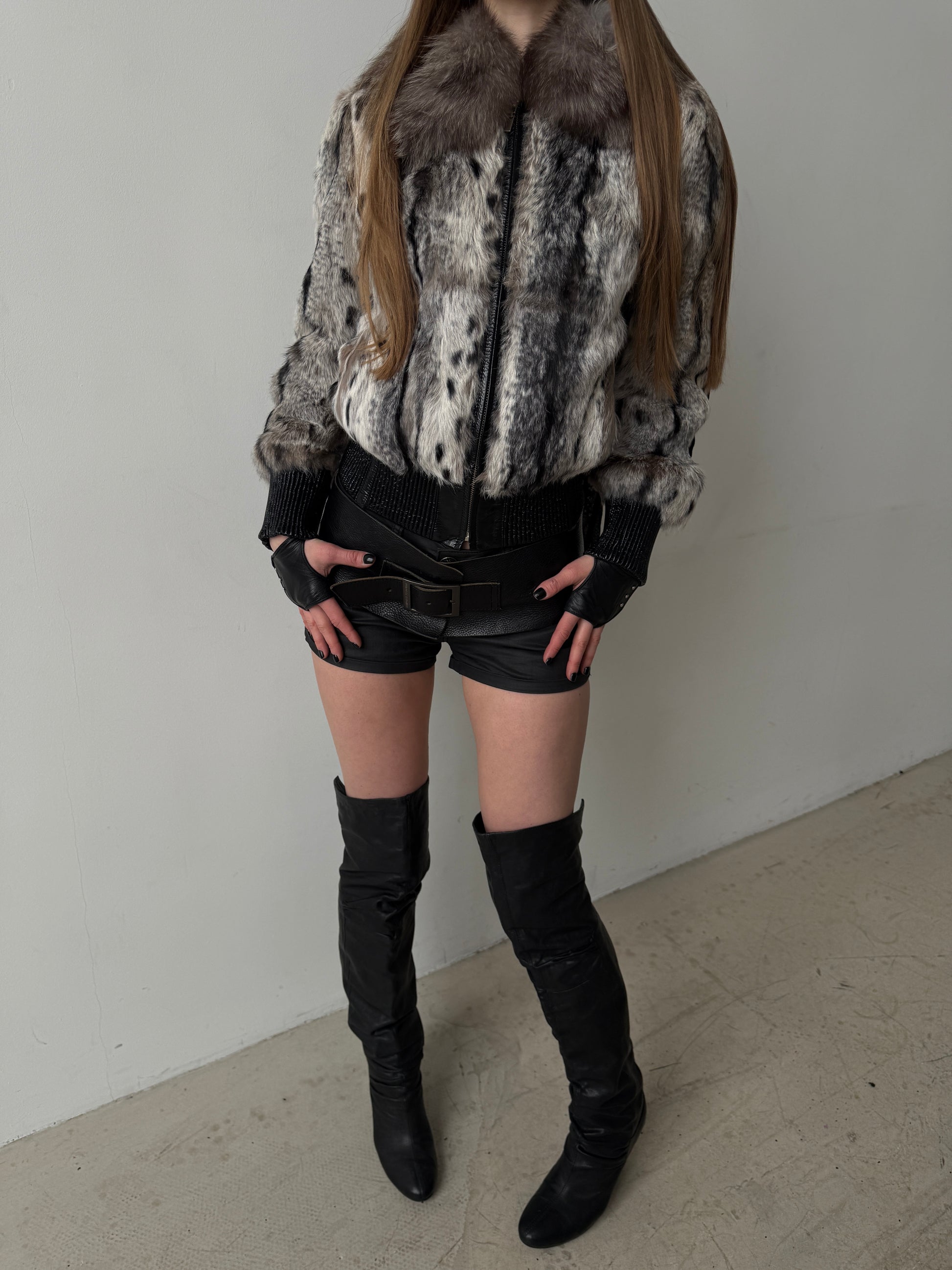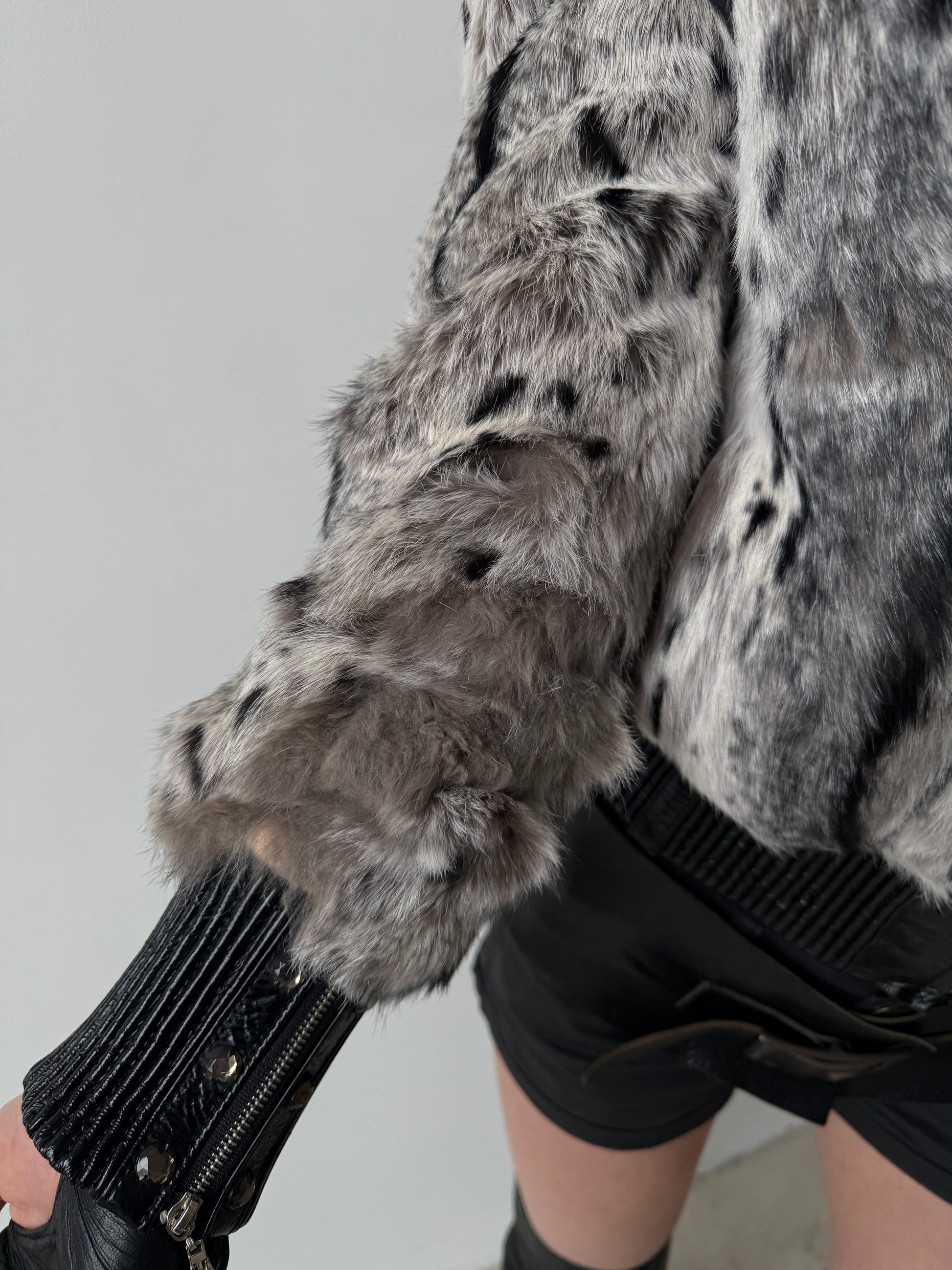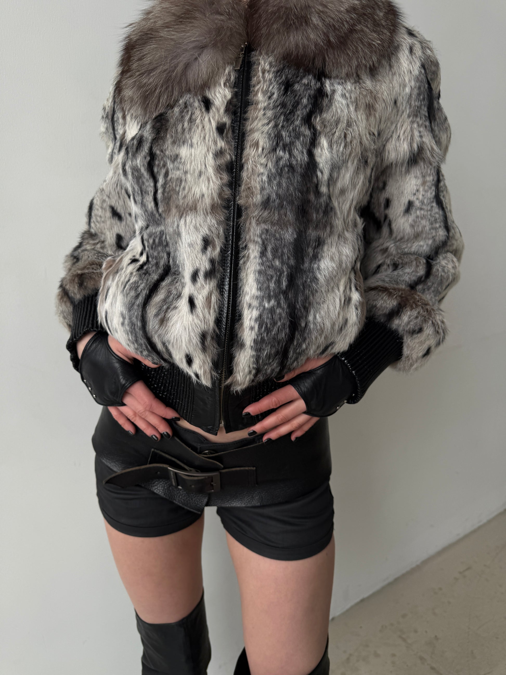 Vintage leather jacket crafted from genuine leather with natural rabbit fur. Features a structured silhouette and front zip closure. A distinctive vintage piece with expressive texture and a strong character.
