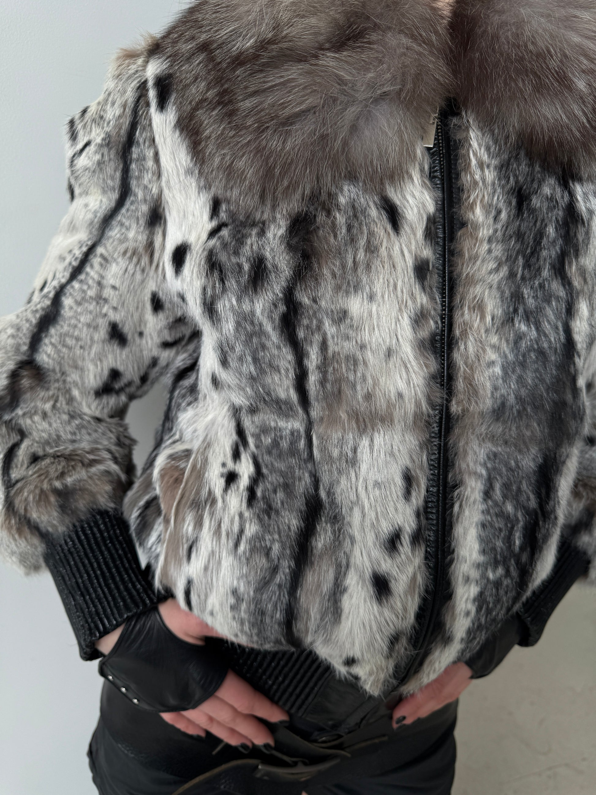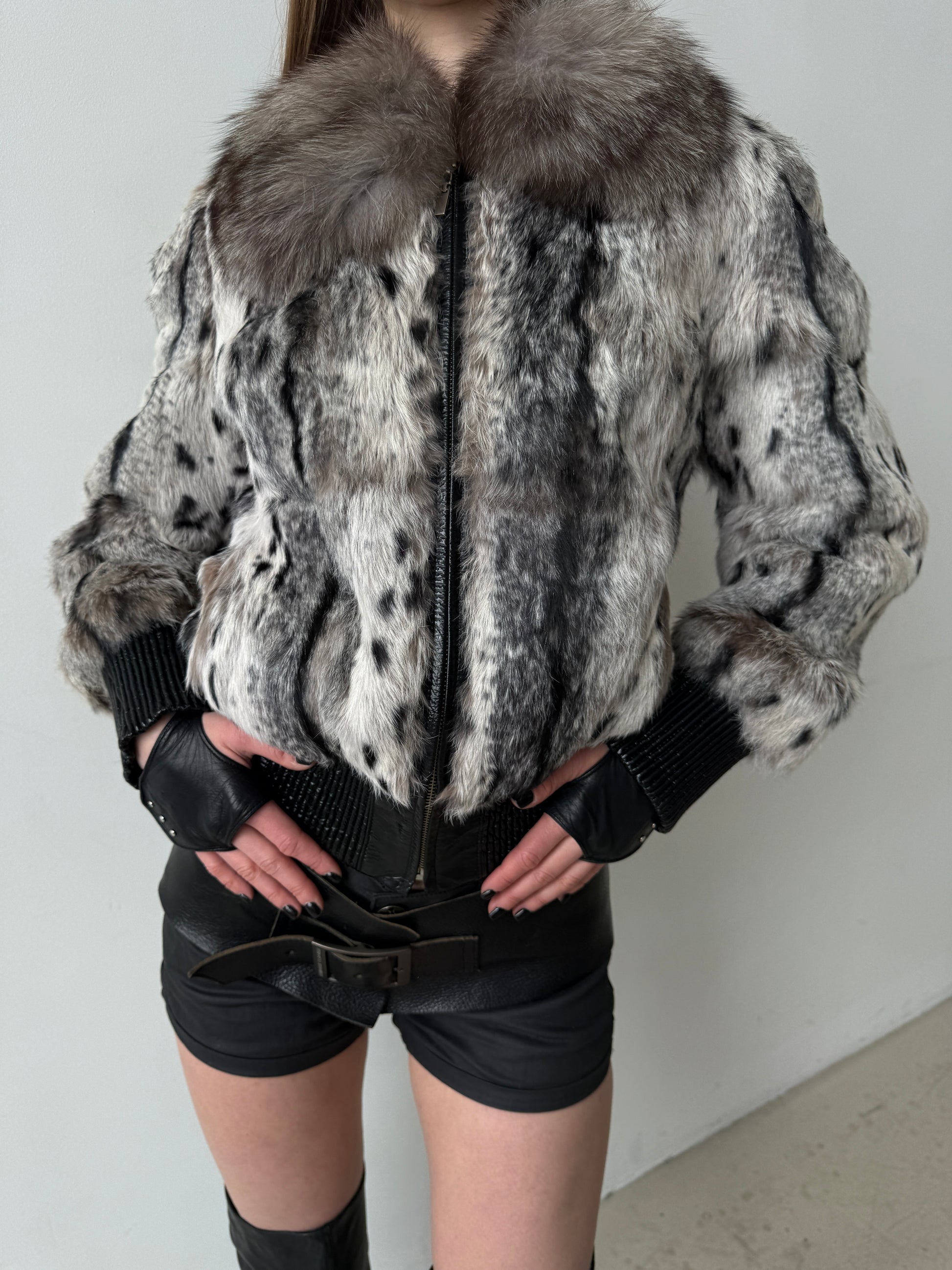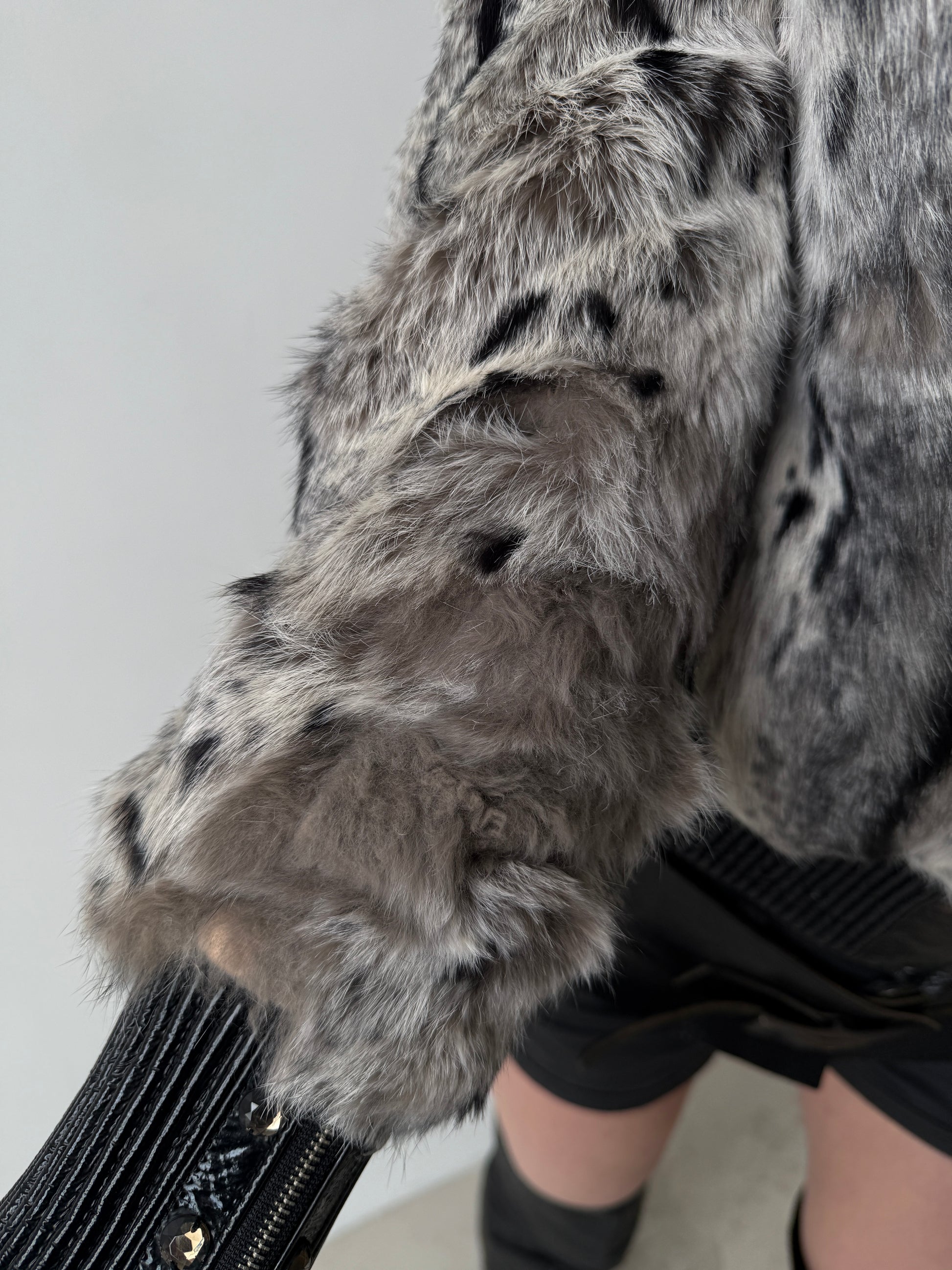 Vintage leather jacket crafted from genuine leather with natural rabbit fur. Features a structured silhouette and front zip closure. A distinctive vintage piece with expressive texture and a strong character.