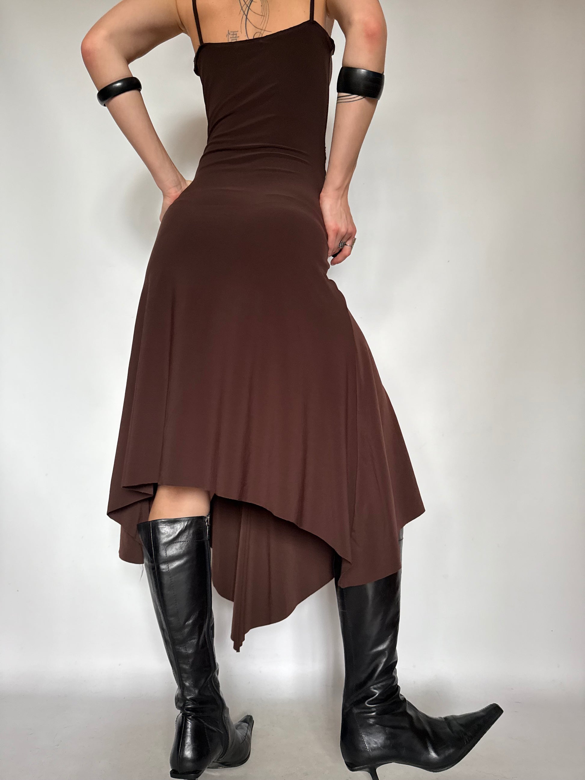 A refined vintage brown dress with ruched detailing through the front and delicate lace trim on the neckline. Designed with an asymmetrical hemline that adds movement and elegance. Perfect for evening styling, date nights, or statement looks.