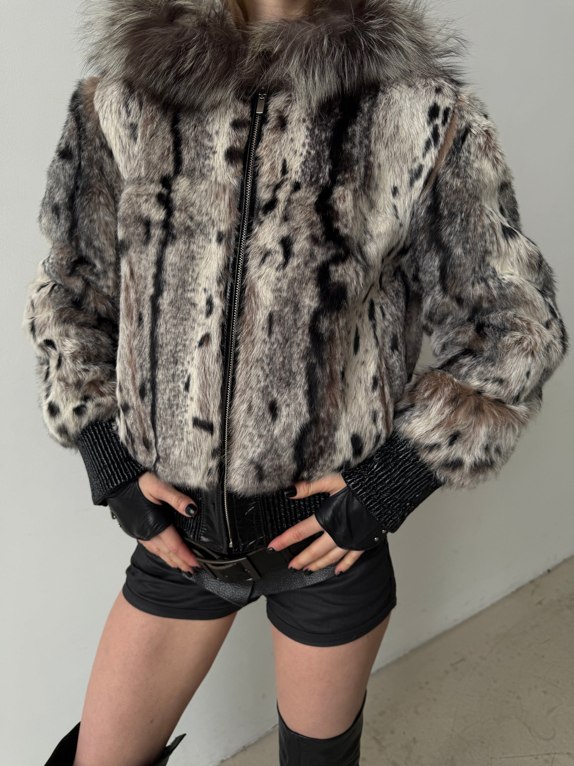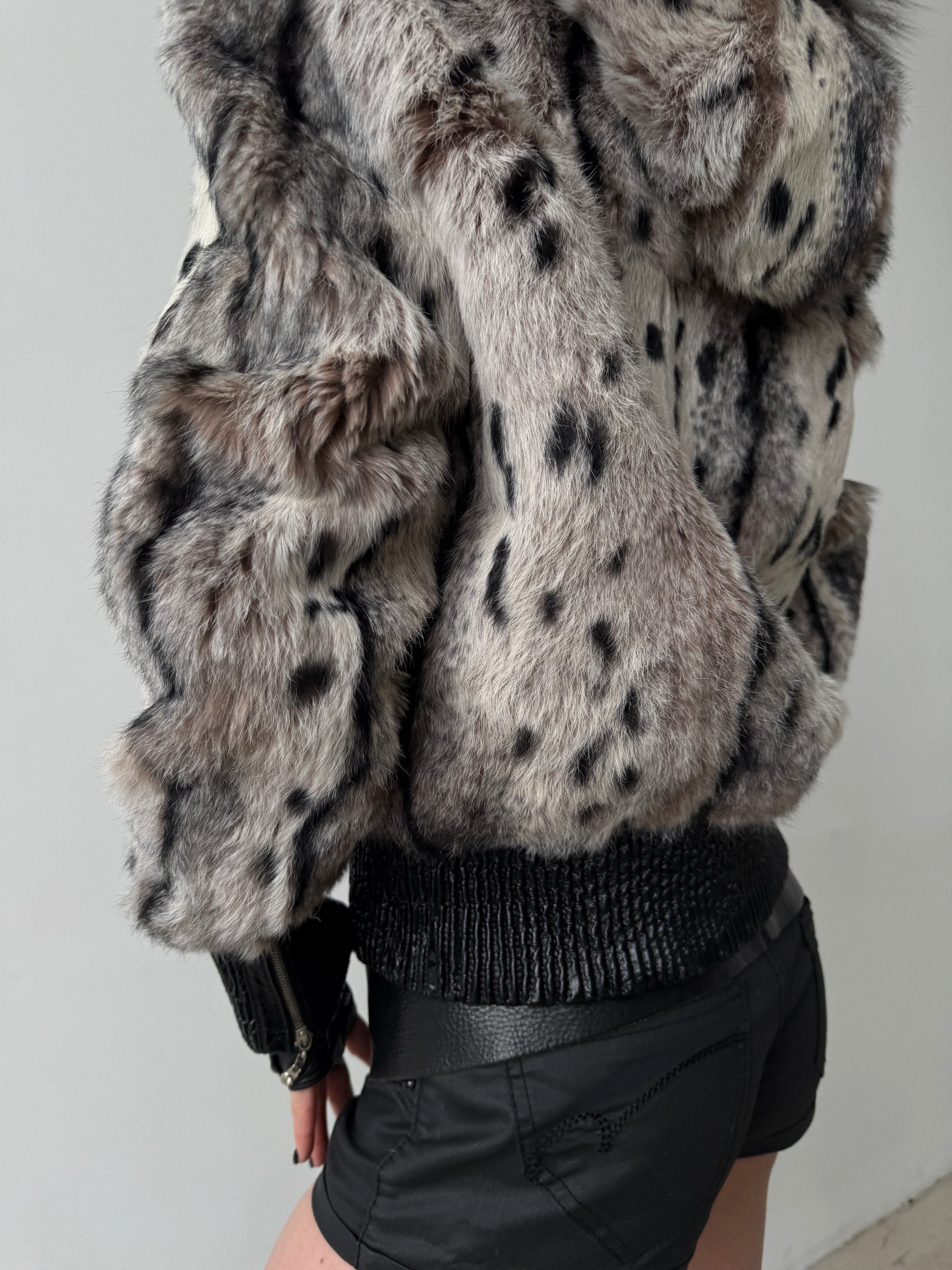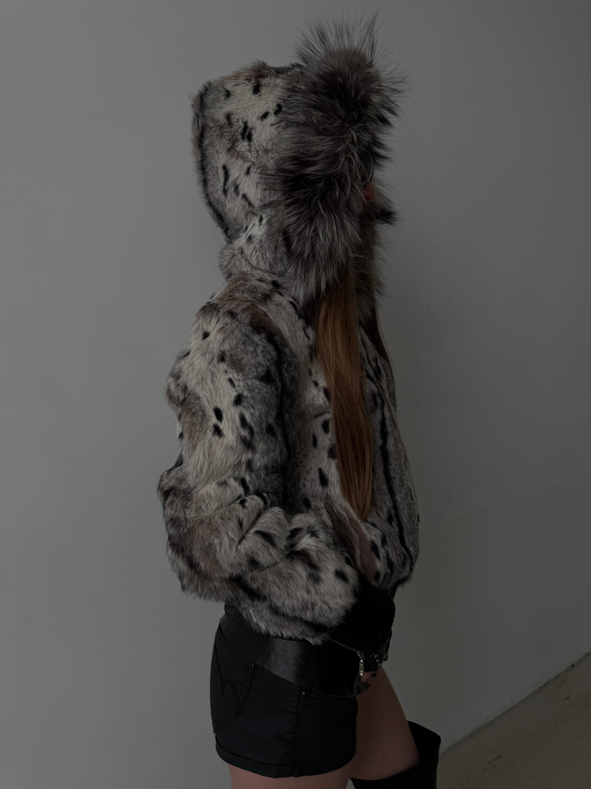 Vintage genuine leather jacket with natural rabbit fur and hood TWINKLING GLOBAL