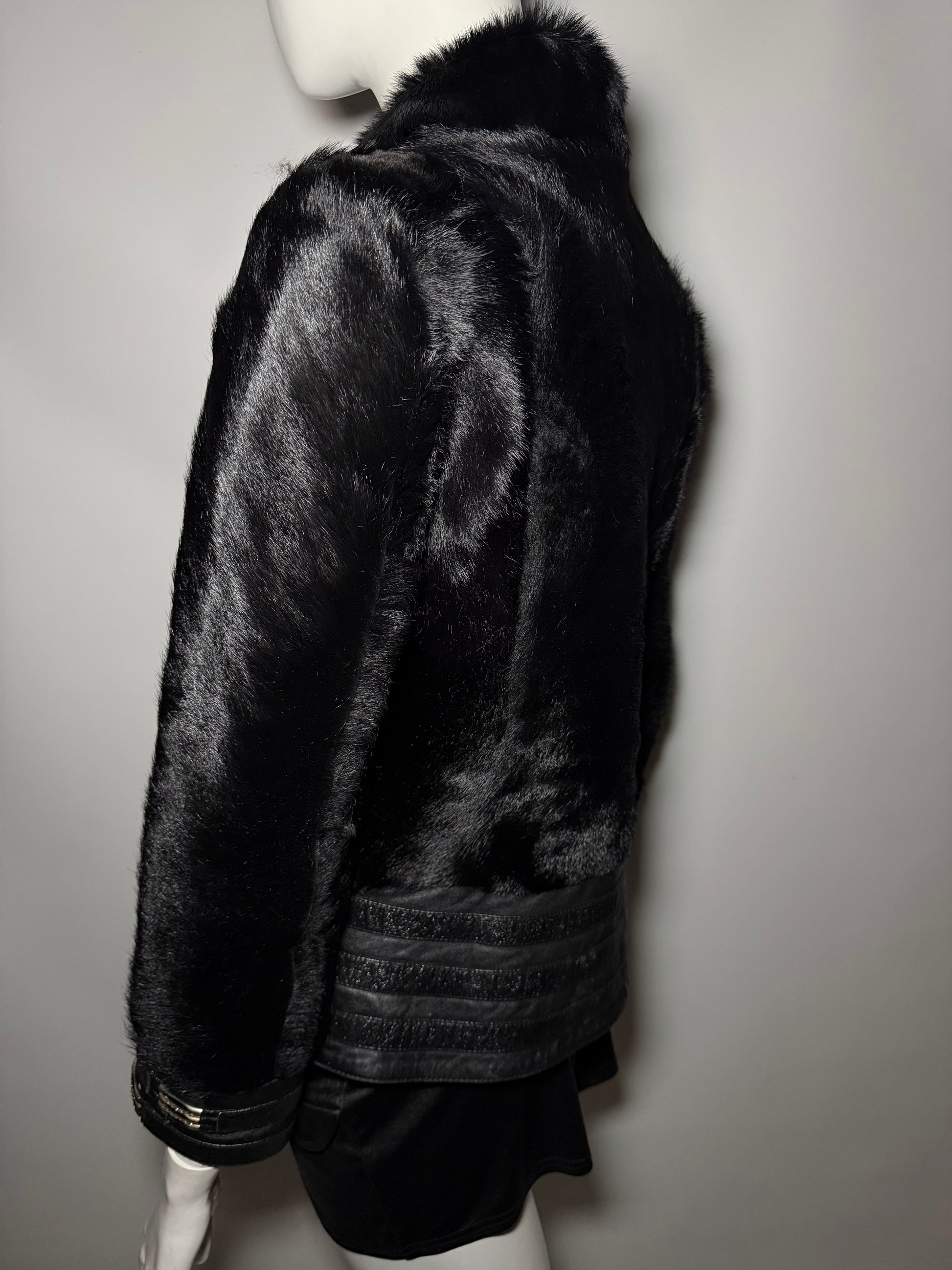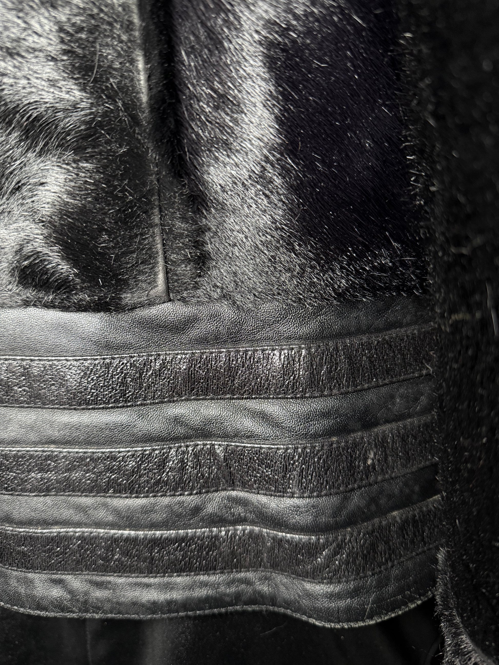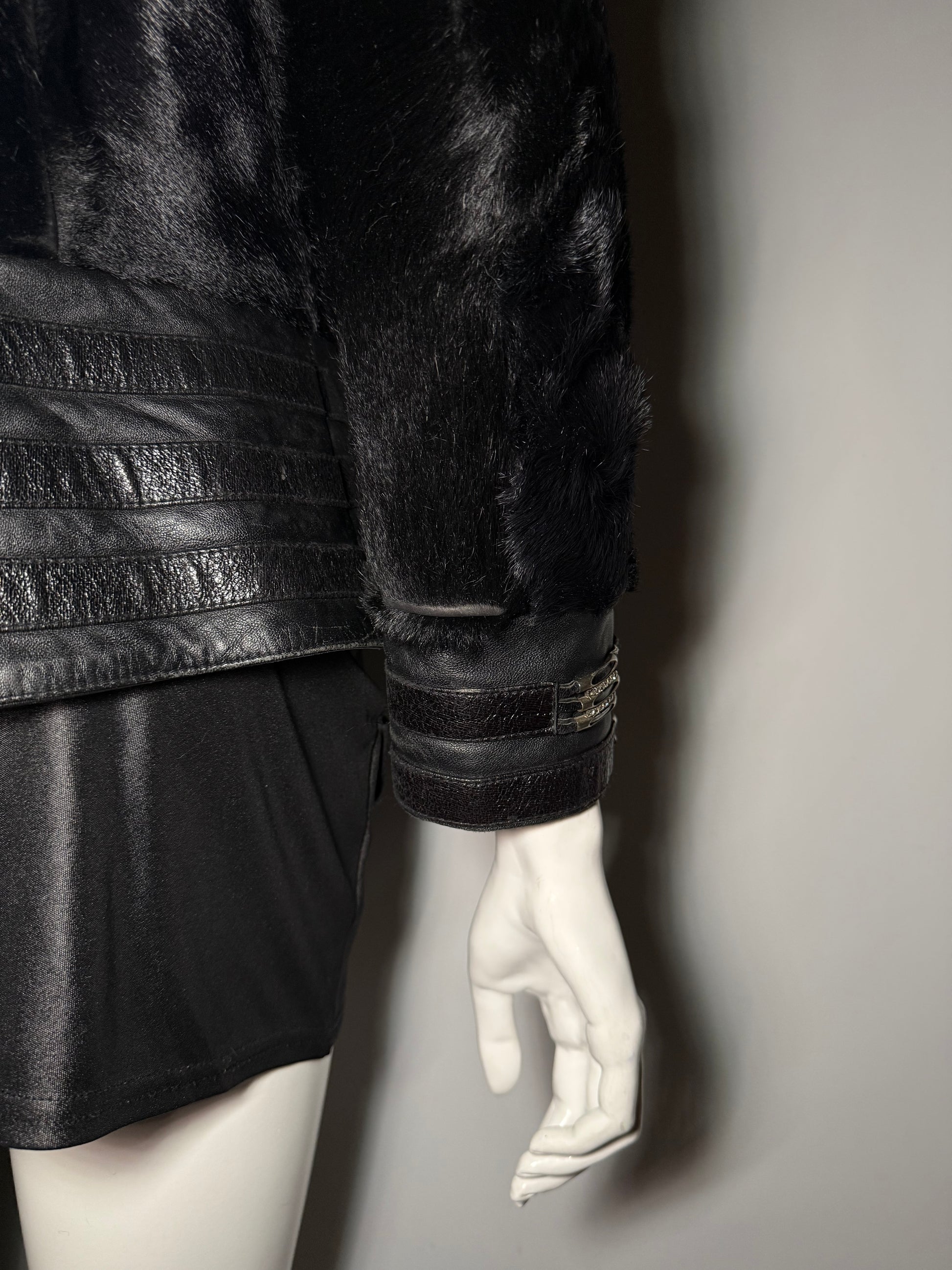 Vintage black leather jacket with real fur front and sleeves. Detailed leather patchwork at the bottom and cuffs with metallic accents. Unique structured silhouette with front zip closure. Very good condition, minor wear on the fur along some seams (see last photo).