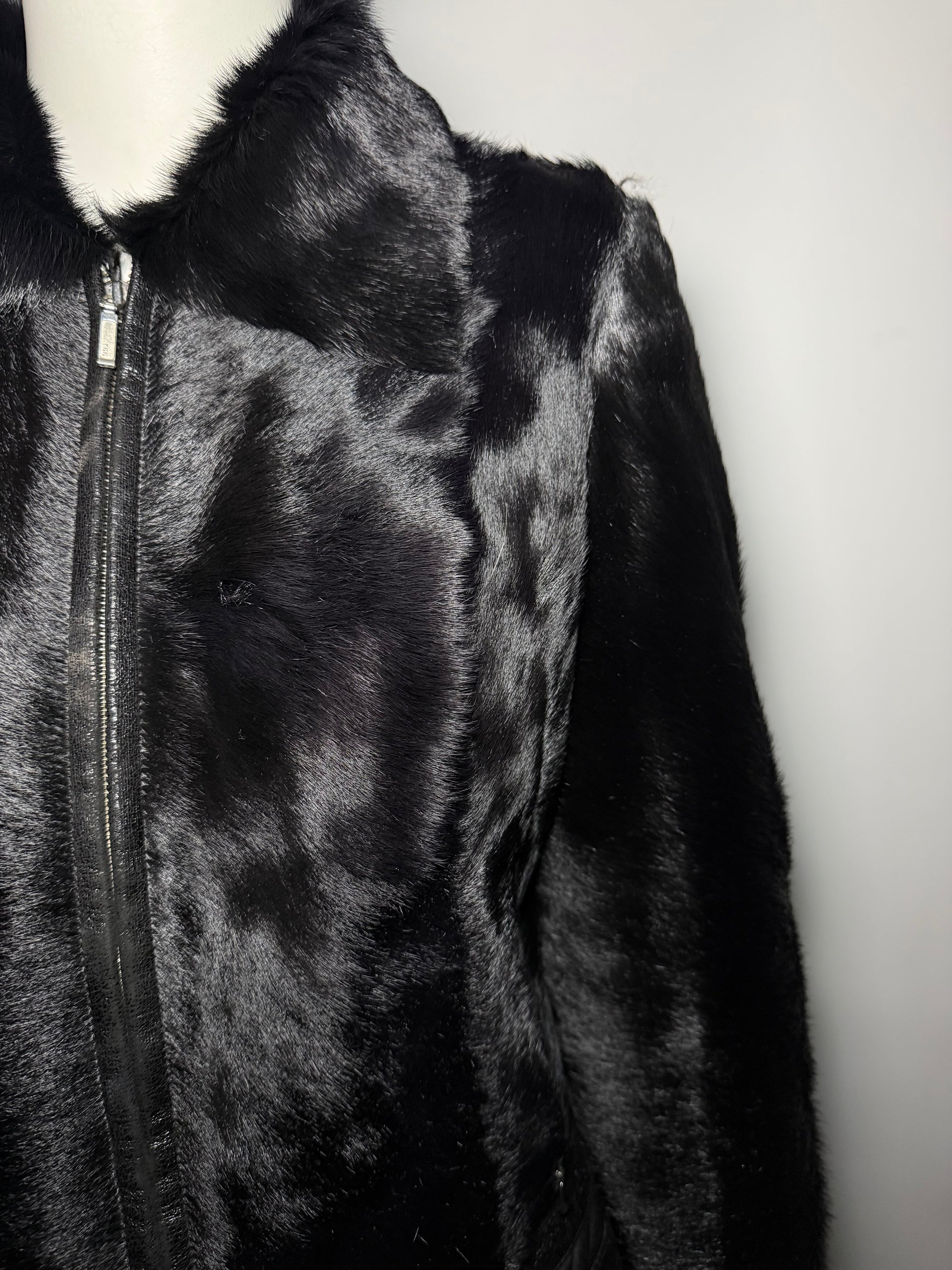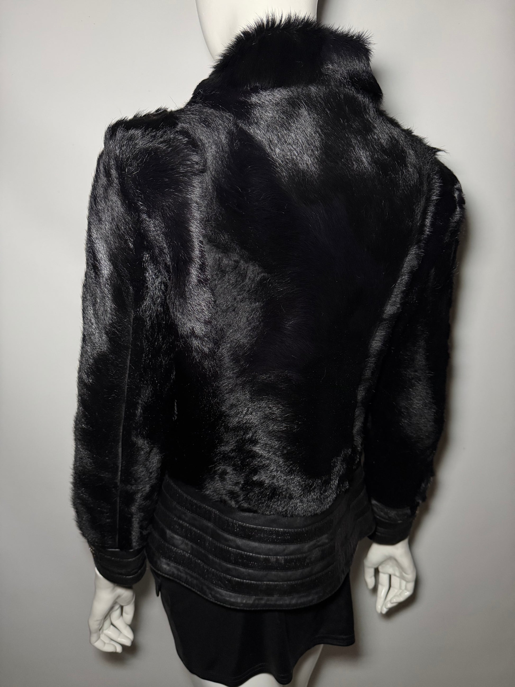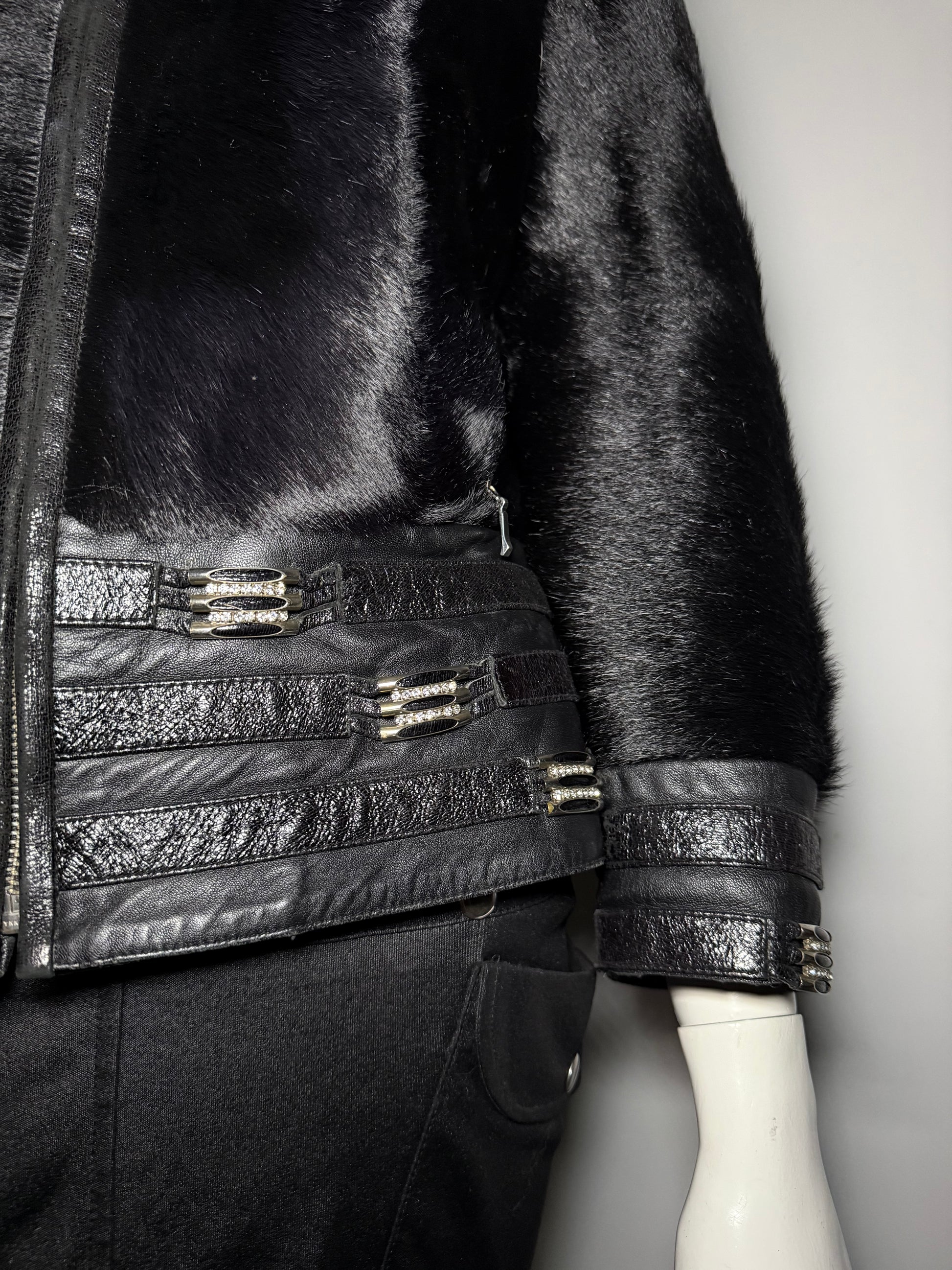 Vintage black leather jacket with real fur front and sleeves. Detailed leather patchwork at the bottom and cuffs with metallic accents. Unique structured silhouette with front zip closure. Very good condition, minor wear on the fur along some seams (see last photo).