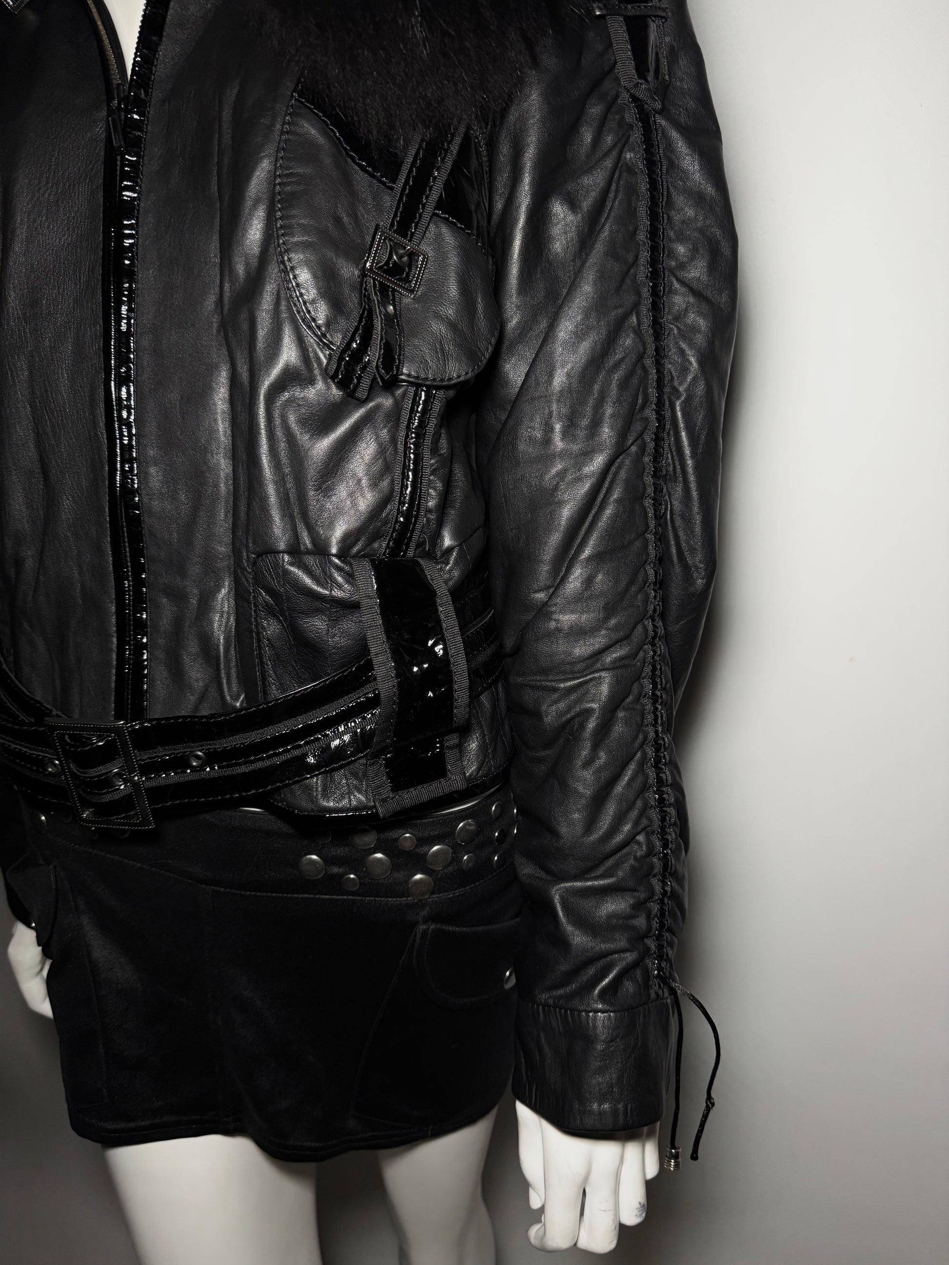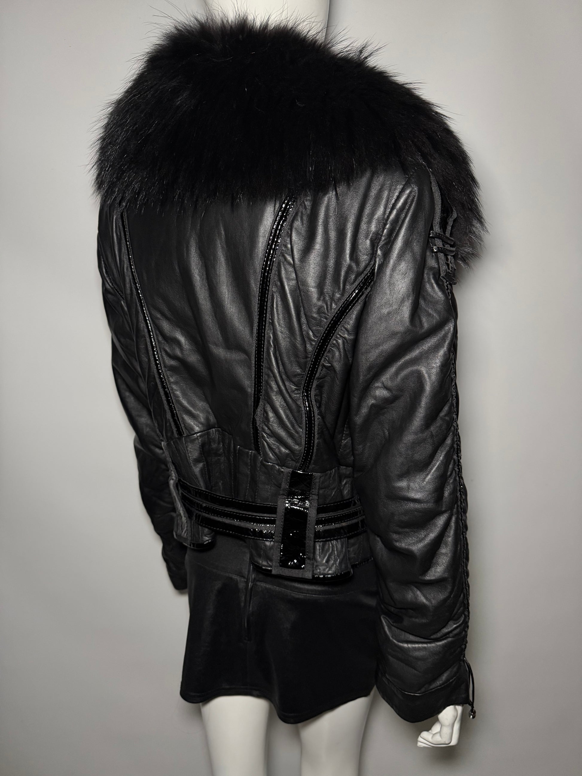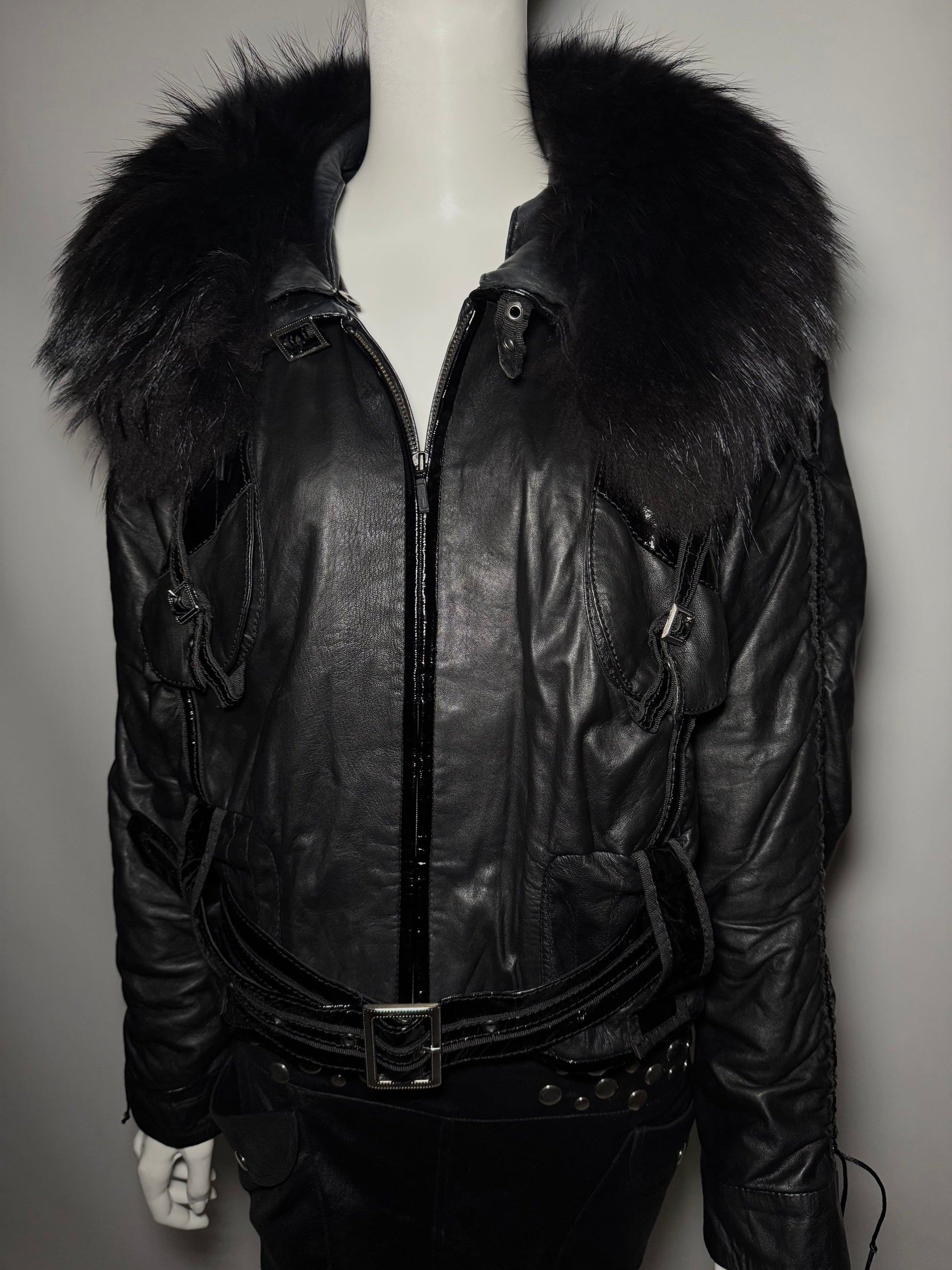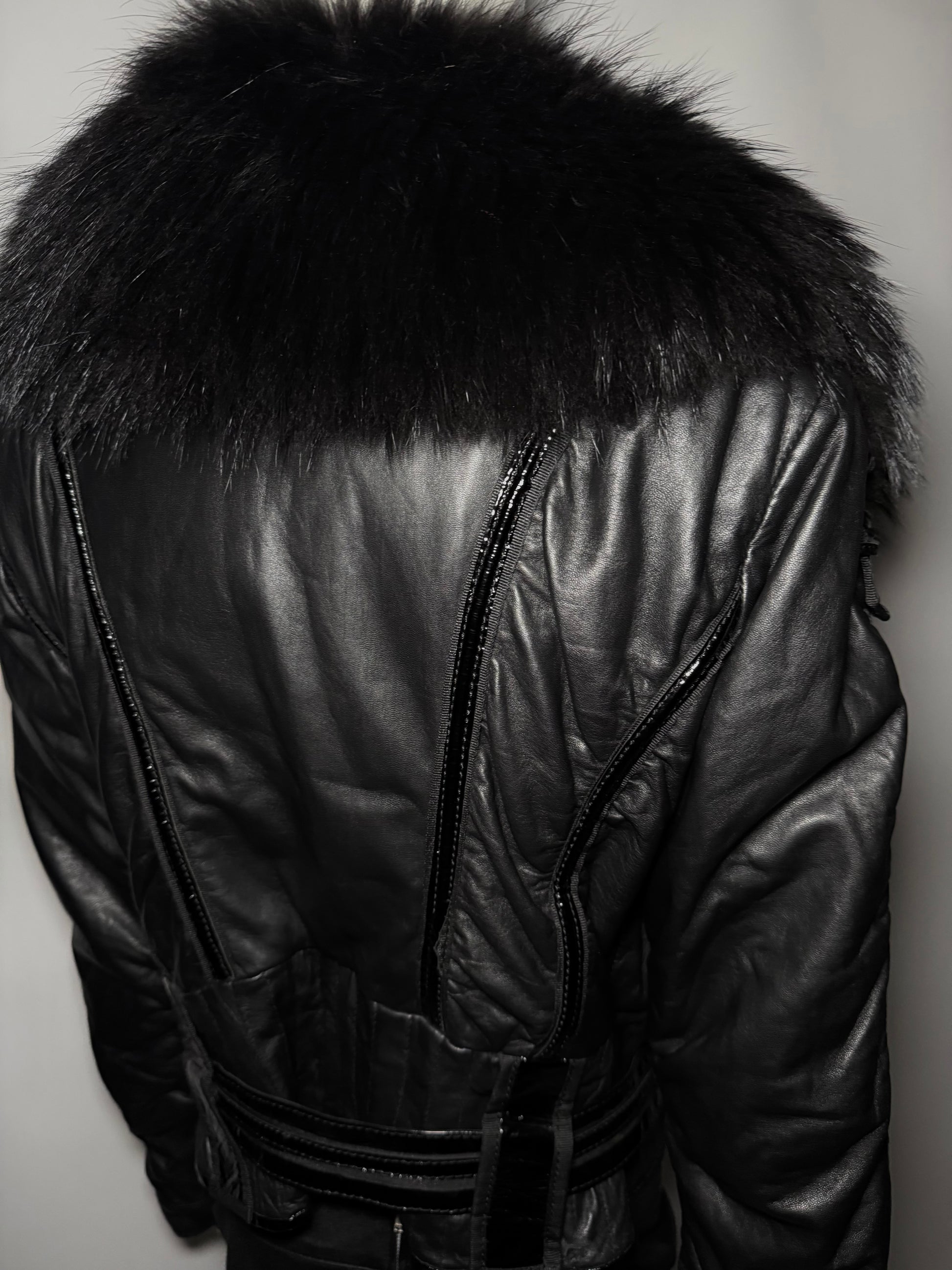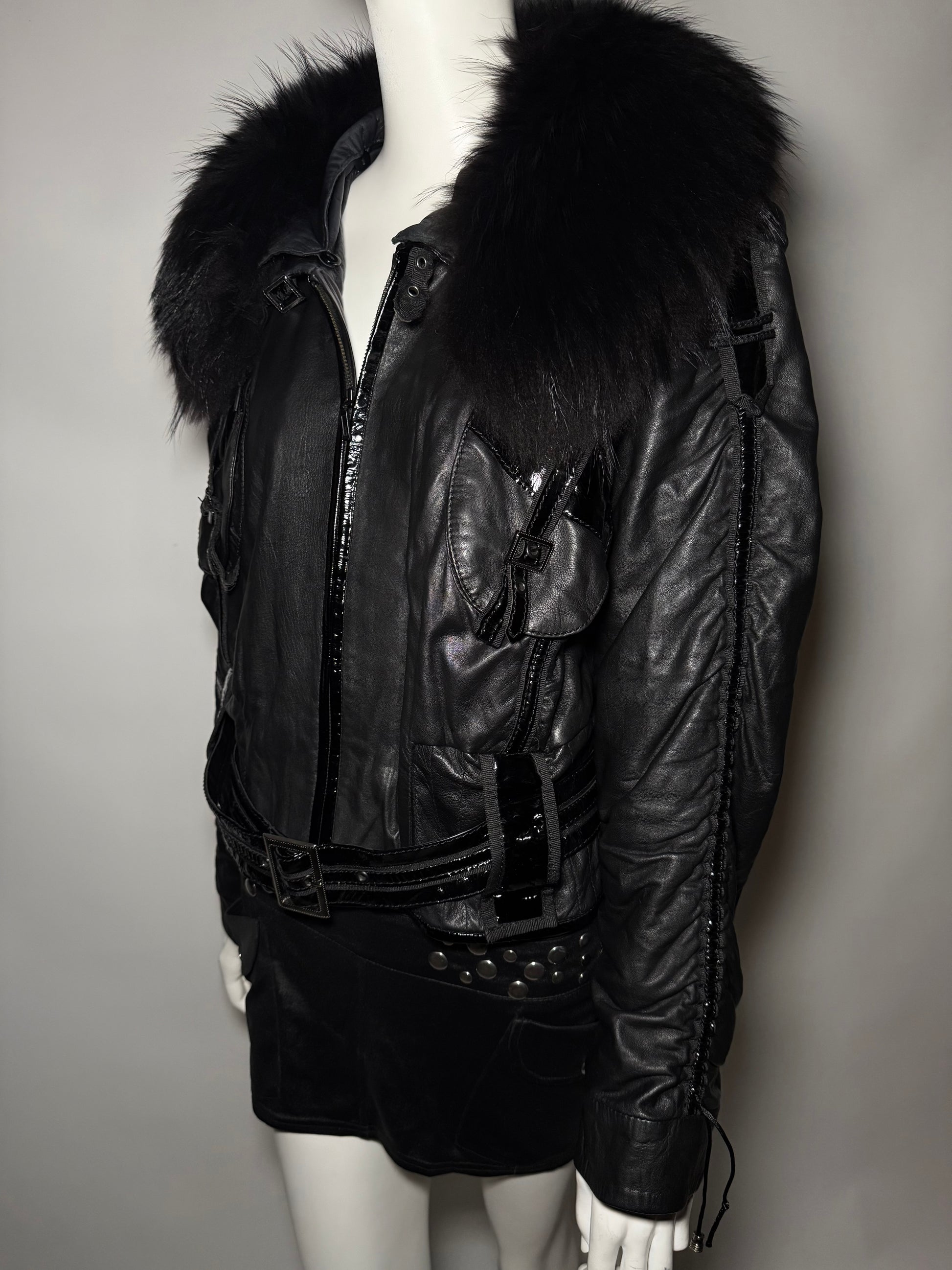 Striking vintage black leather jacket with luxurious real fur collar. Oversized fit with glossy black patent trim details and a matching belt. Unique cut-out shoulder design with buckle accents. Excellent condition, close to perfect.