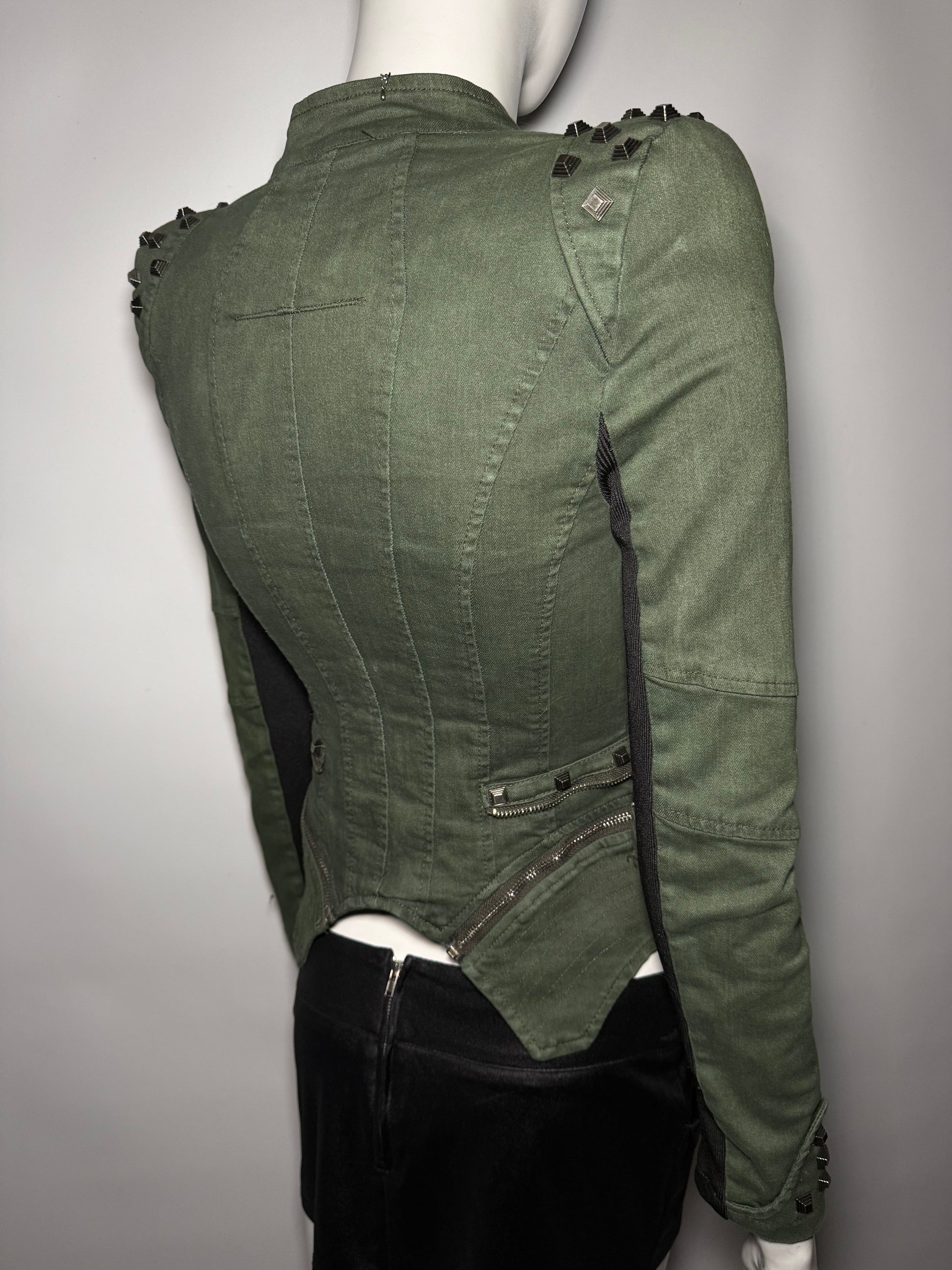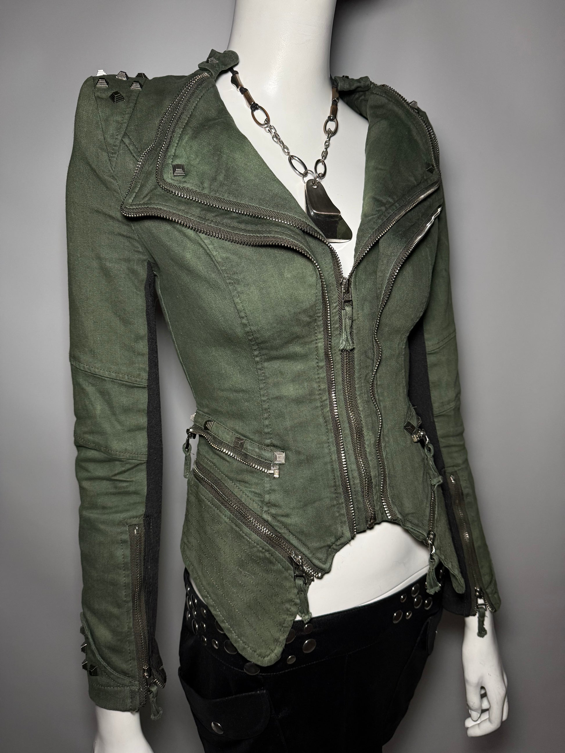 Vintage denim jacket with a fitted silhouette and unique structured shoulders (light foam inside to hold shape). Multi-zip design and modern edgy feel — very striking and relevant piece. Excellent condition.