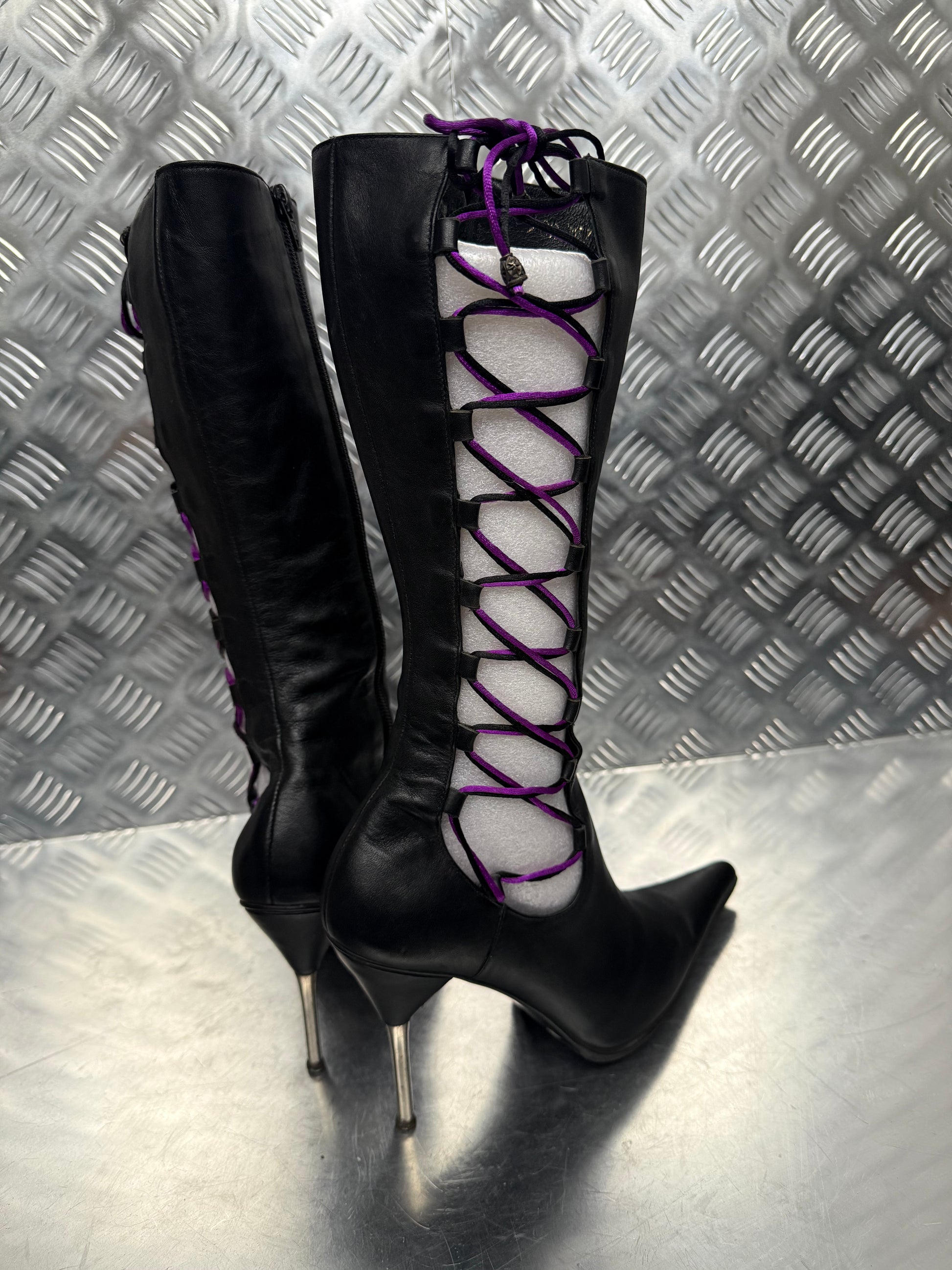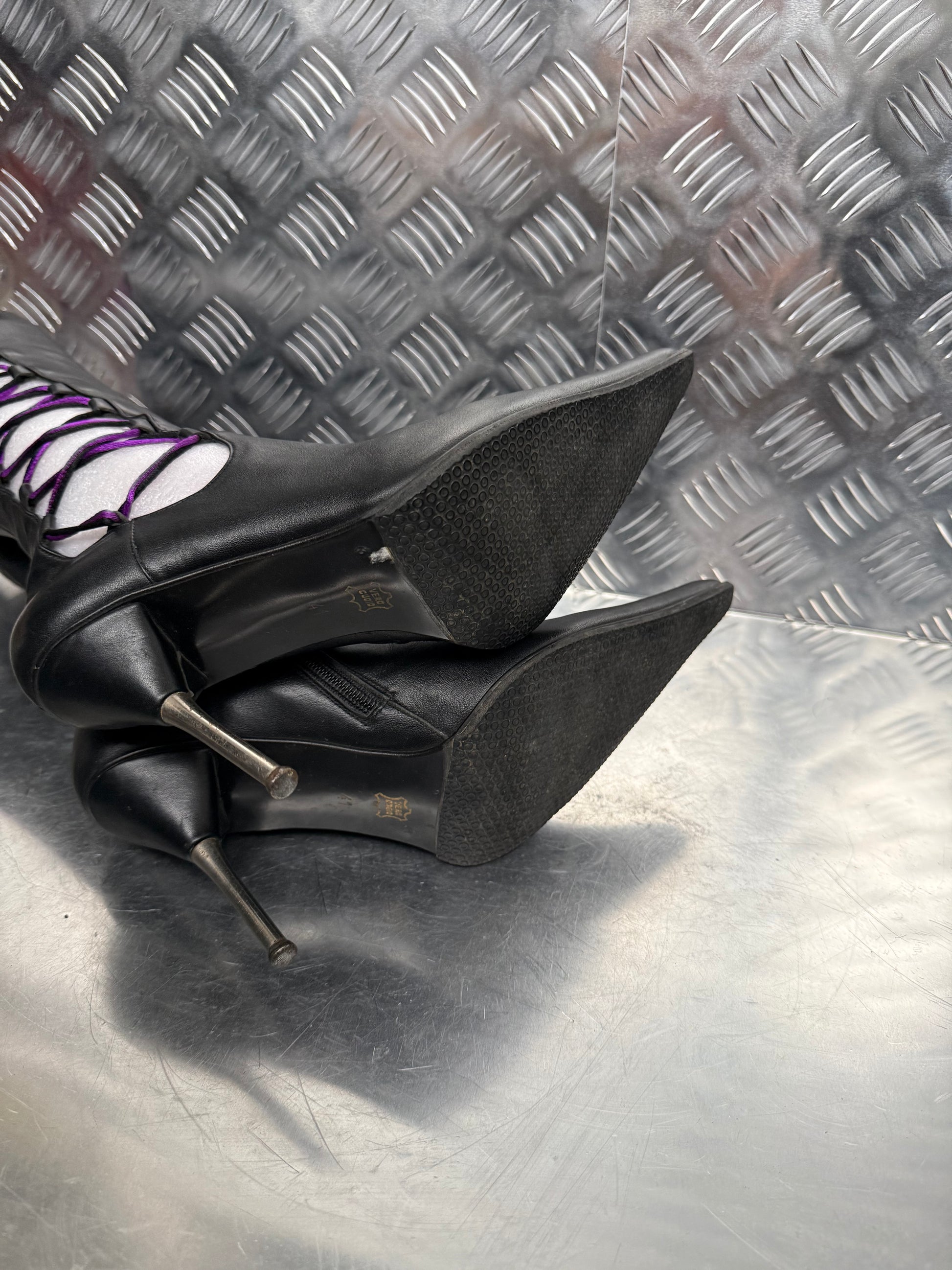 Vintage Italian genuine leather boots with a pointed toe and high stiletto heel. Decorative purple lacing at the back adds a playful and edgy detail. Side zip closure for easy wear. The boots are in good vintage condition with minor signs of wear.