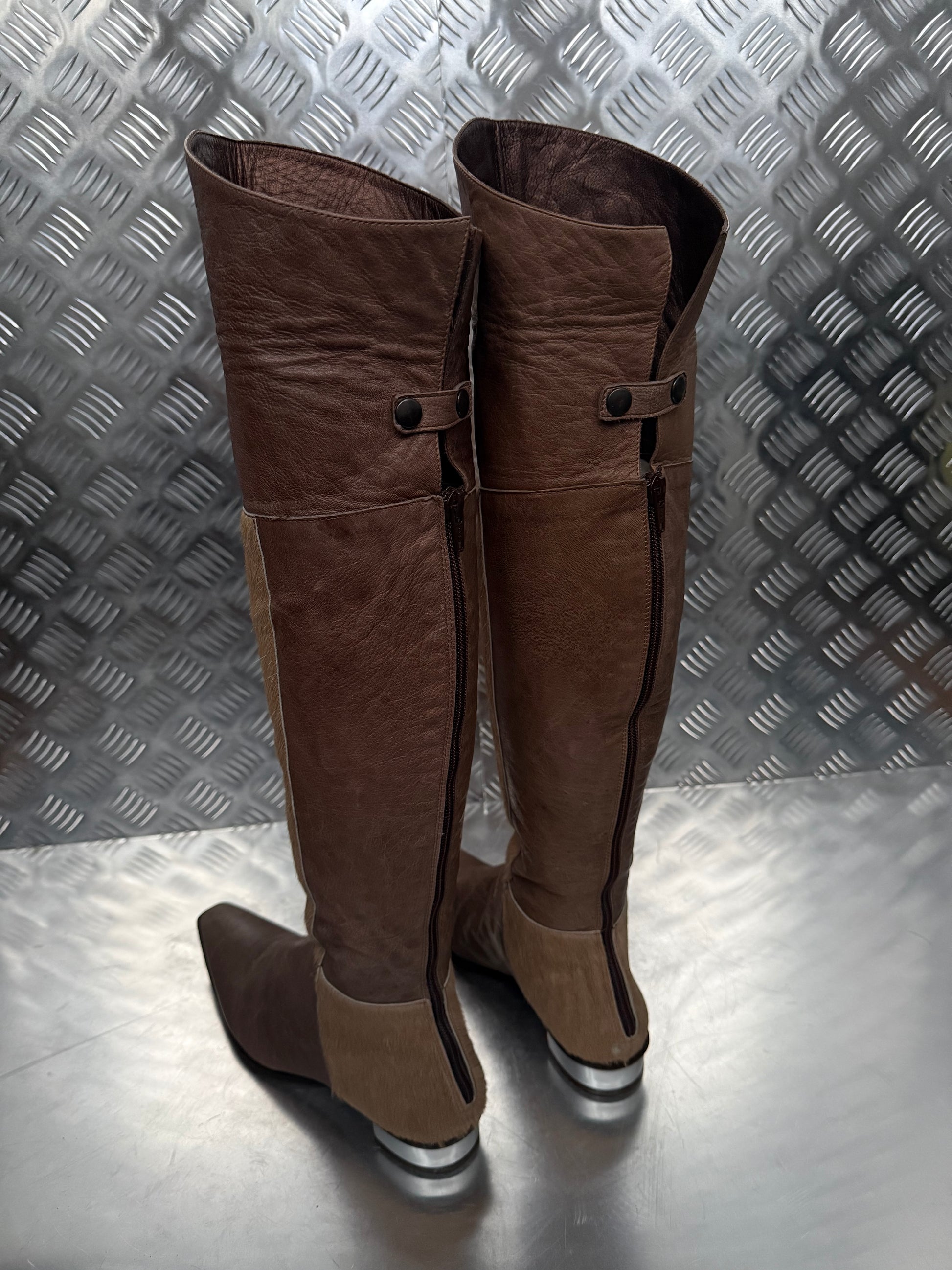 Unique vintage over-the-knee boots by Andrea Lattanzi crafted from rich brown leather and genuine pony fur panels. Sleek, pointed toe silhouette with a striking metallic accent on the heel. Side zip closure. Very good vintage condition with a minor flaw on the pony fur at the heel (see photos).