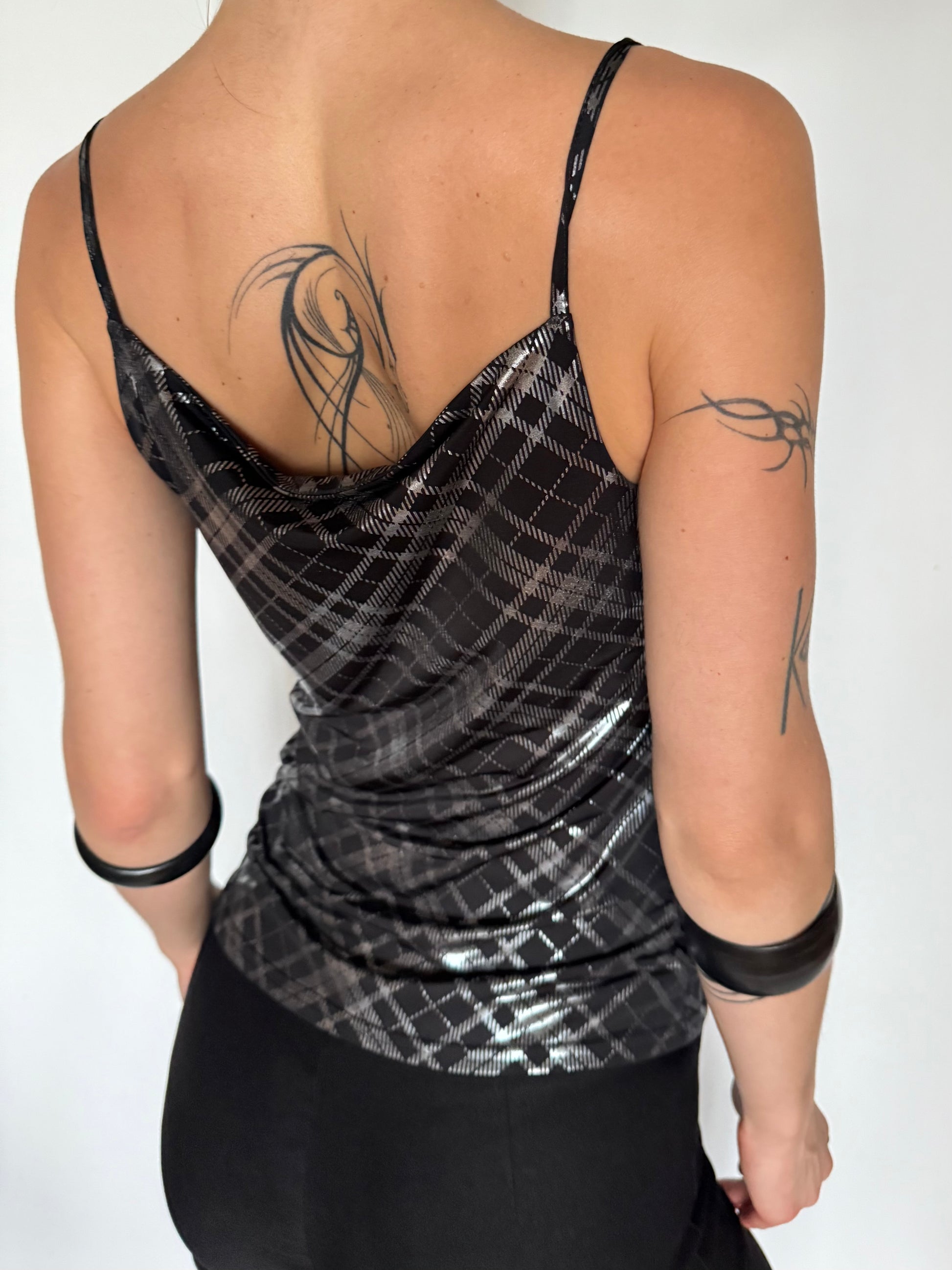 A sleek vintage camisole featuring a glossy plaid pattern with a subtle metallic sheen. Designed with a draped cowl neckline and slim straps for a flattering silhouette. Perfect for layering or wearing on its own for a night-out look.