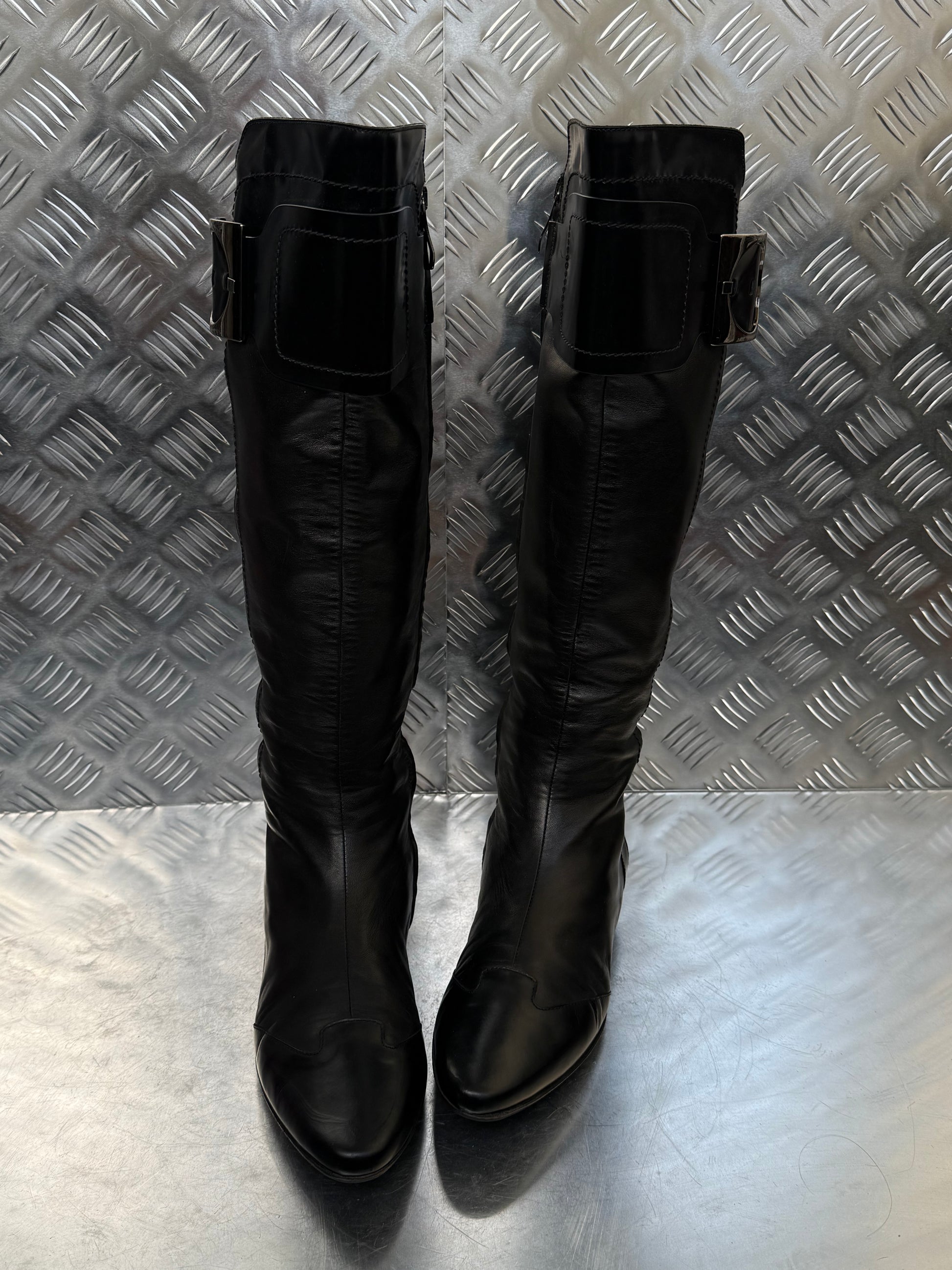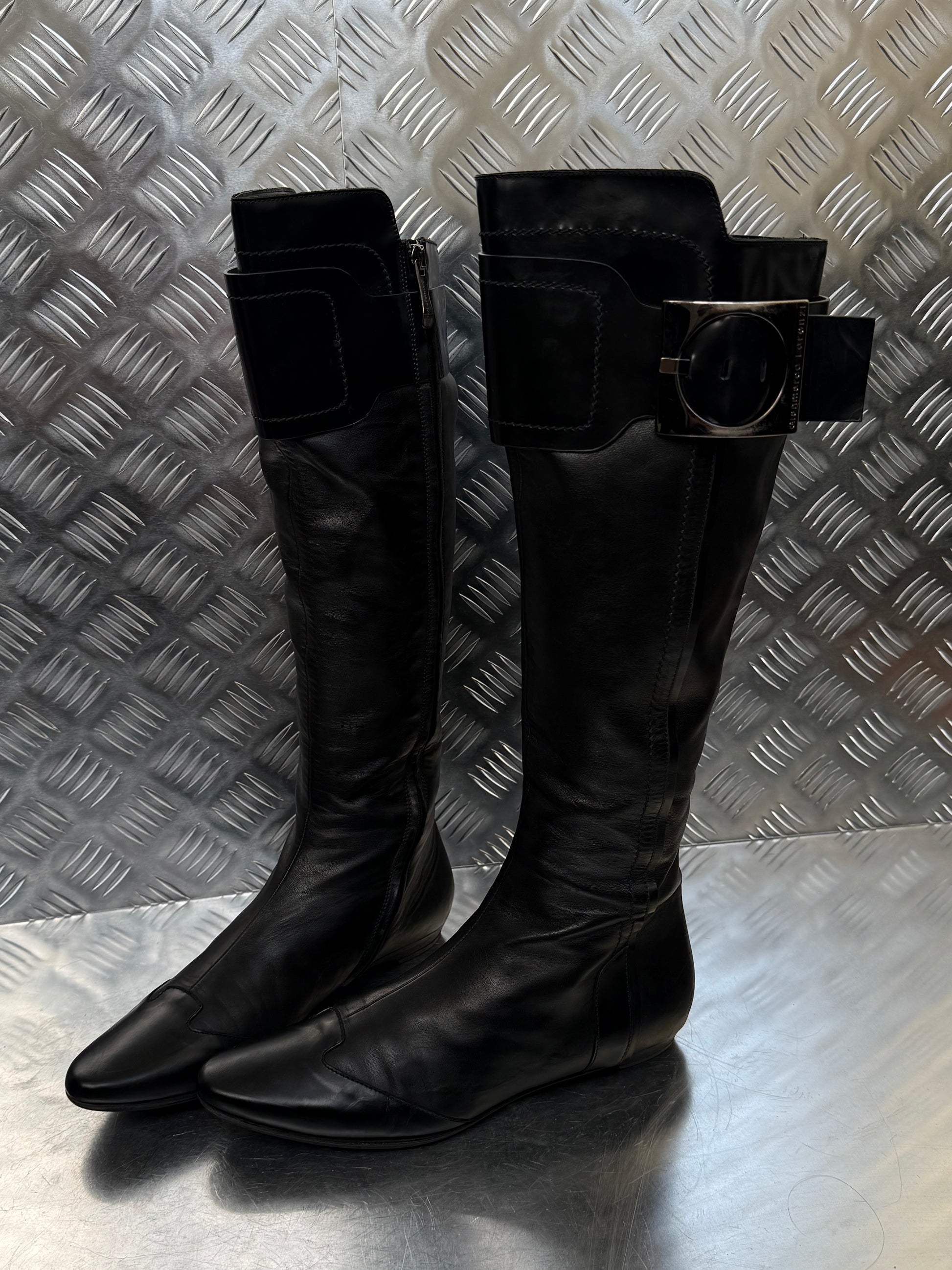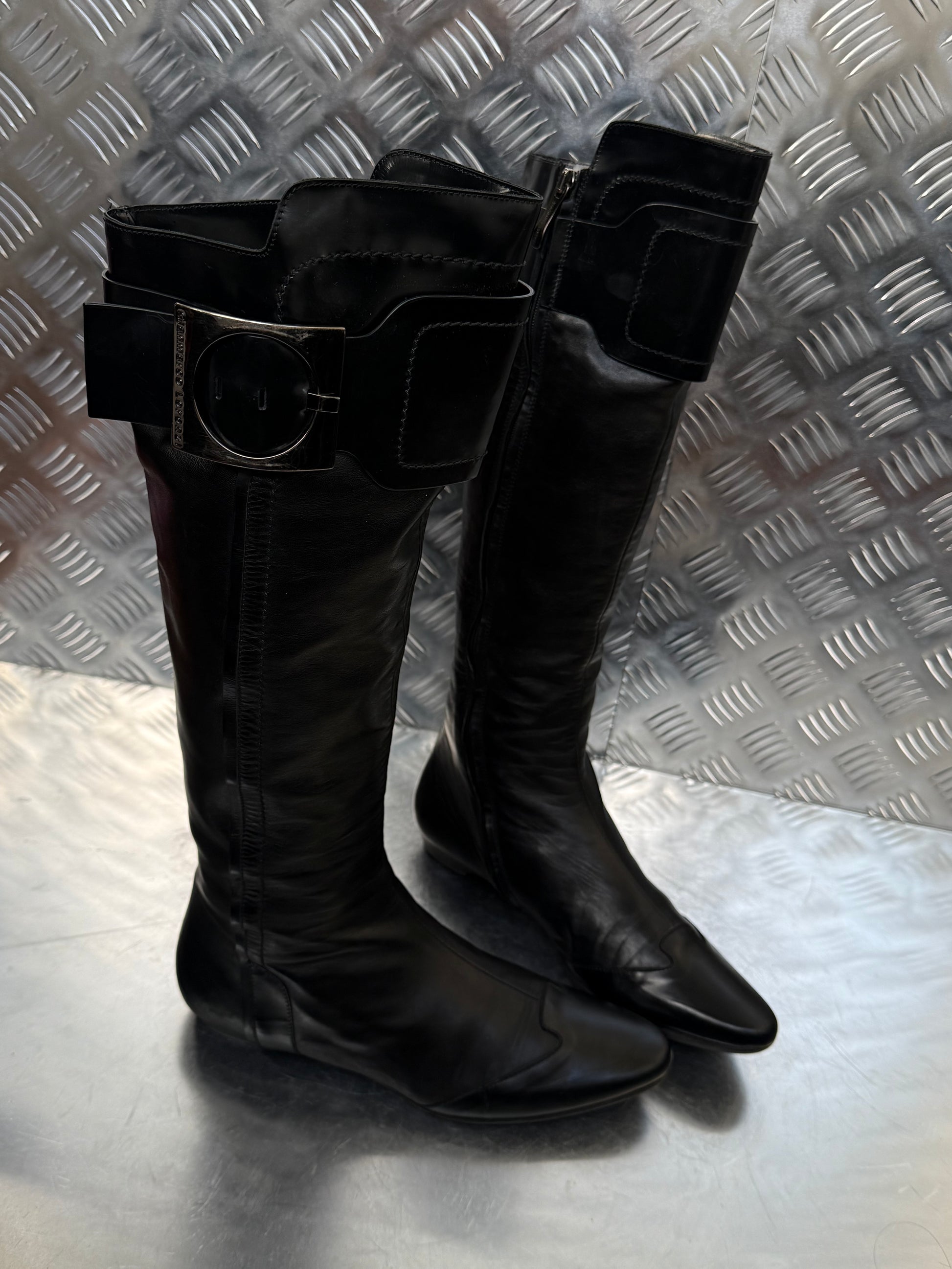 Beautiful vintage black leather boots by Gianmarco Lorenzi featuring a structured silhouette, rounded pointed toe, and signature oversized metal buckle detail. Sleek and sharp with a side zip closure. Excellent vintage condition with minor scuffs on the heels (see photos).