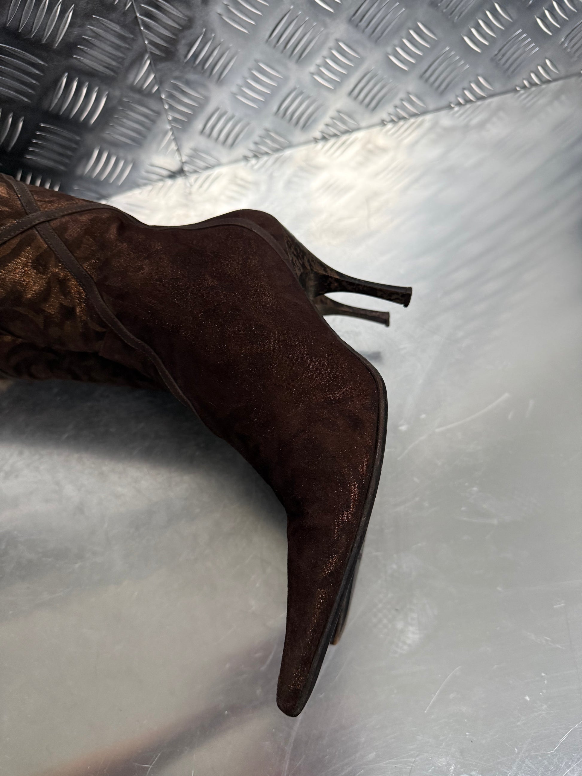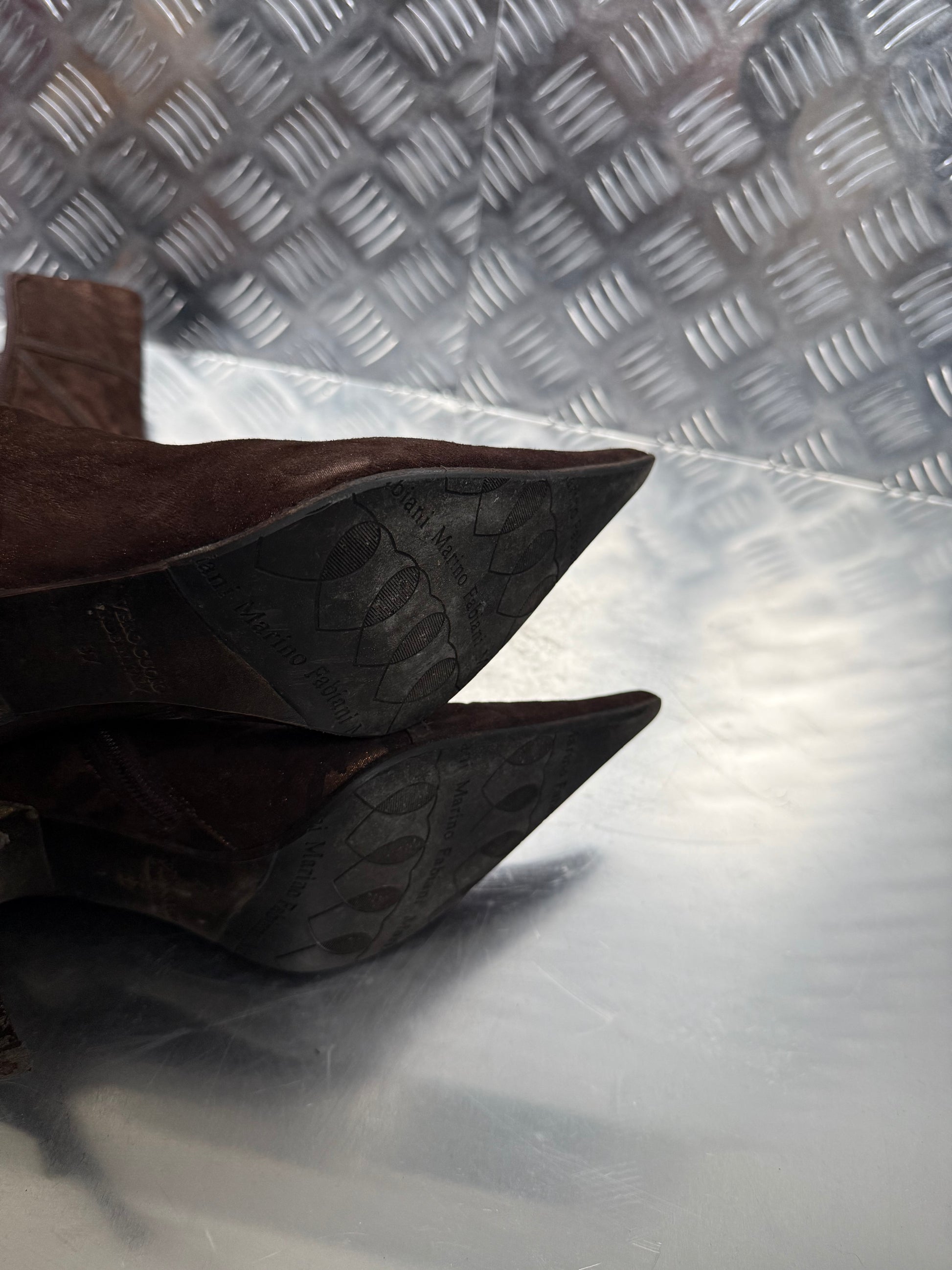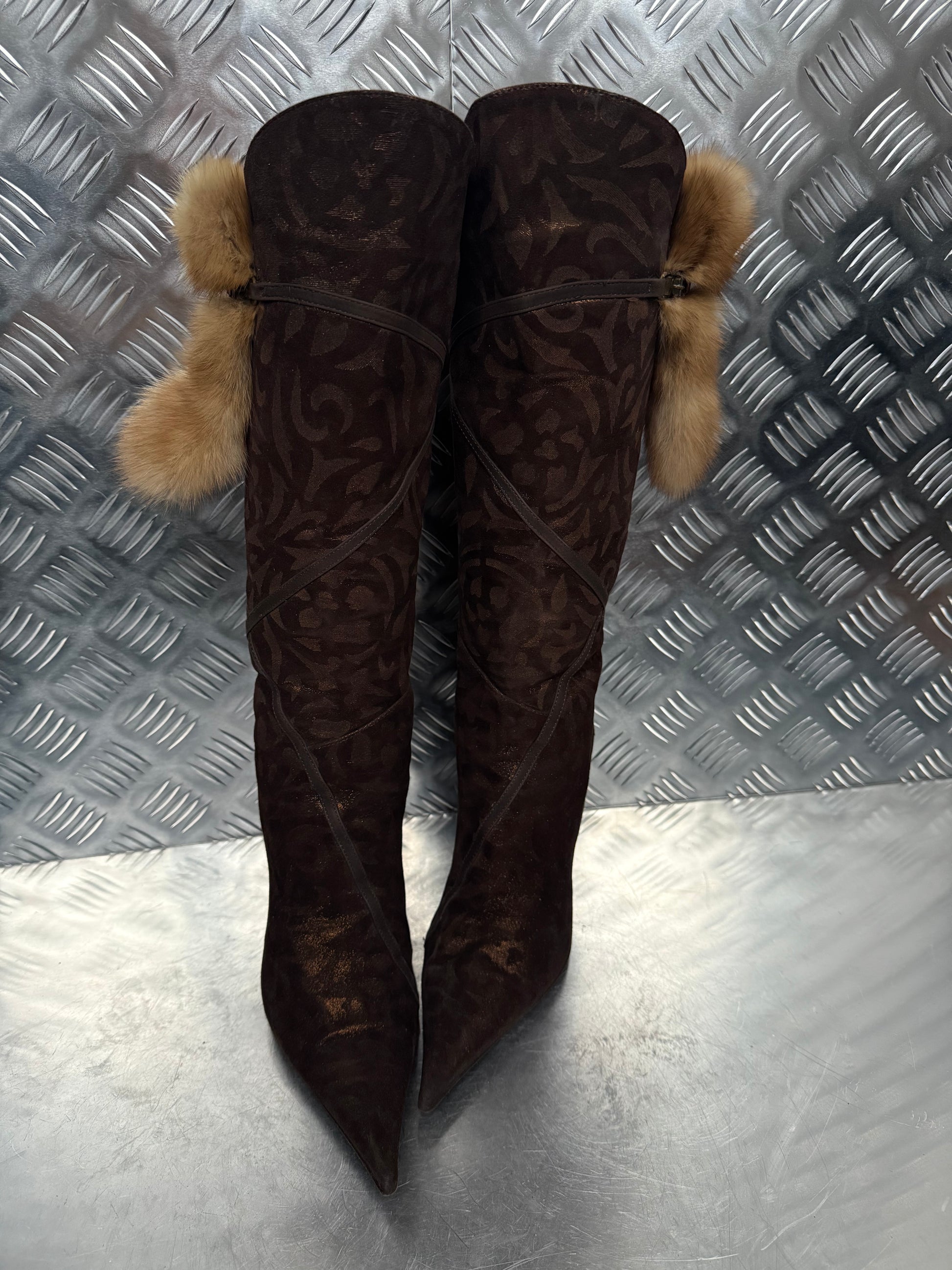 Elegant vintage heeled boots made in Italy. Dark brown suede with a textured pattern, pointed toe, and fur pom-pom accents on the sides. Slim high heel, full inner zipper. Good vintage condition with minor scuffs on the suede and some scratches on the heels.