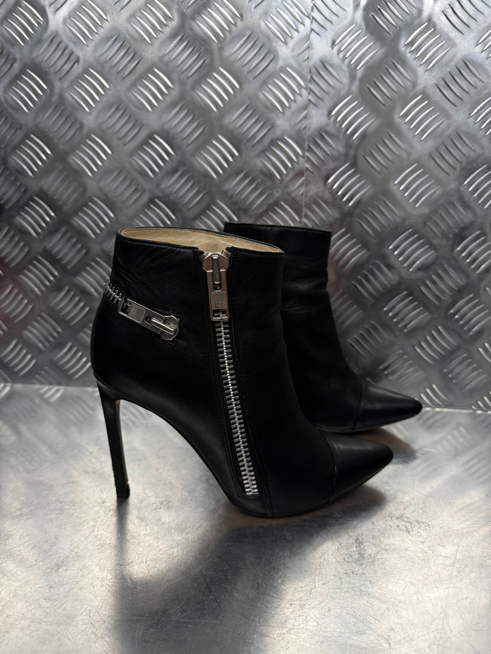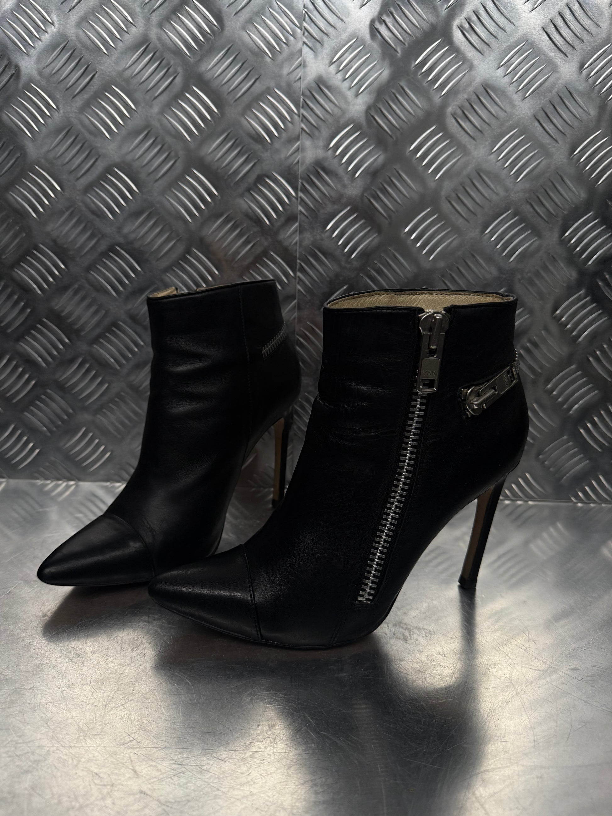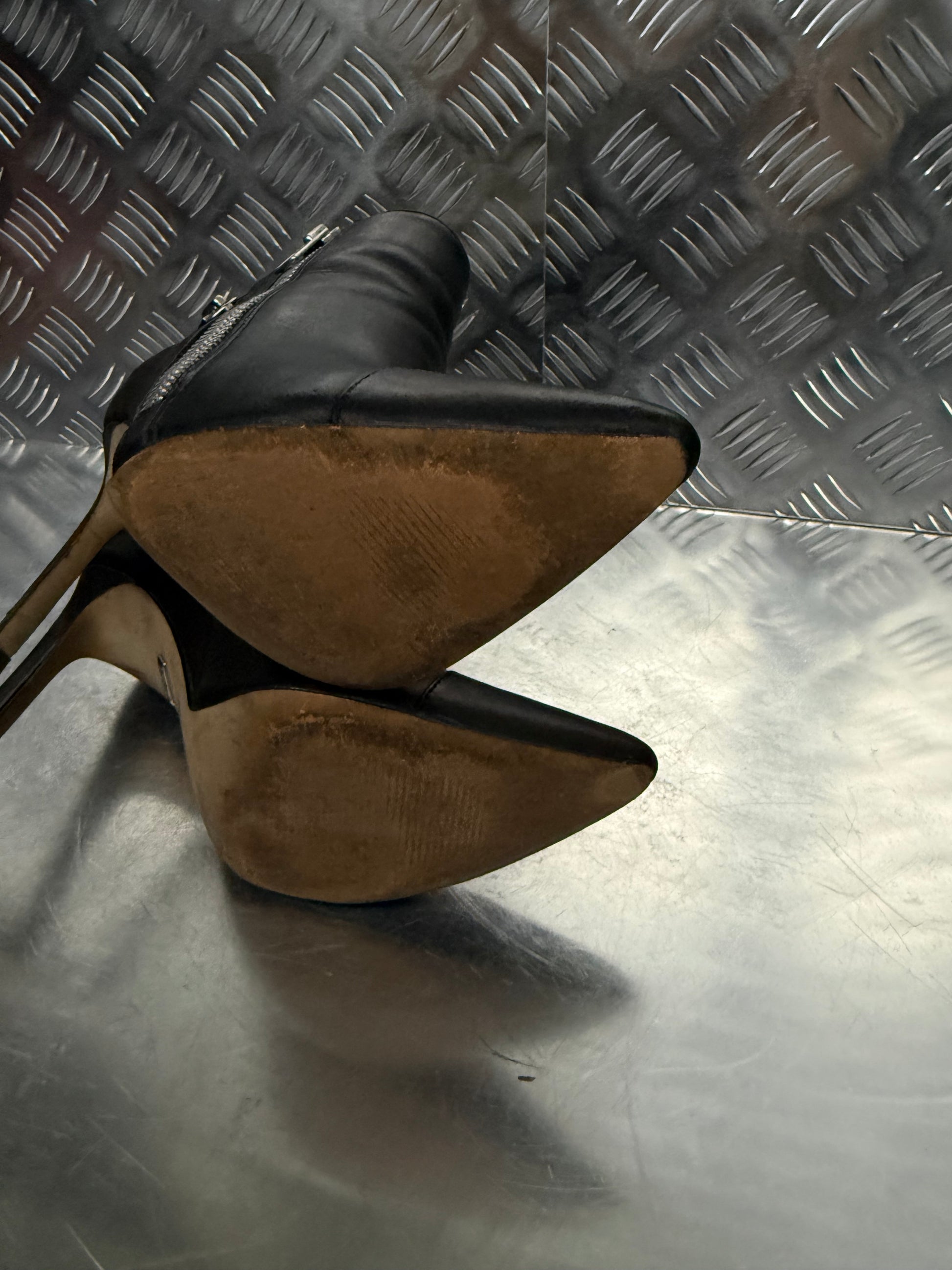 Chic vintage black leather ankle boots by Buffalo featuring a pointed toe, high stiletto heel, and bold zipper detailing on the sides. Sleek silhouette perfect for edgy or elegant looks. Very good vintage condition – no major flaws (see photos).