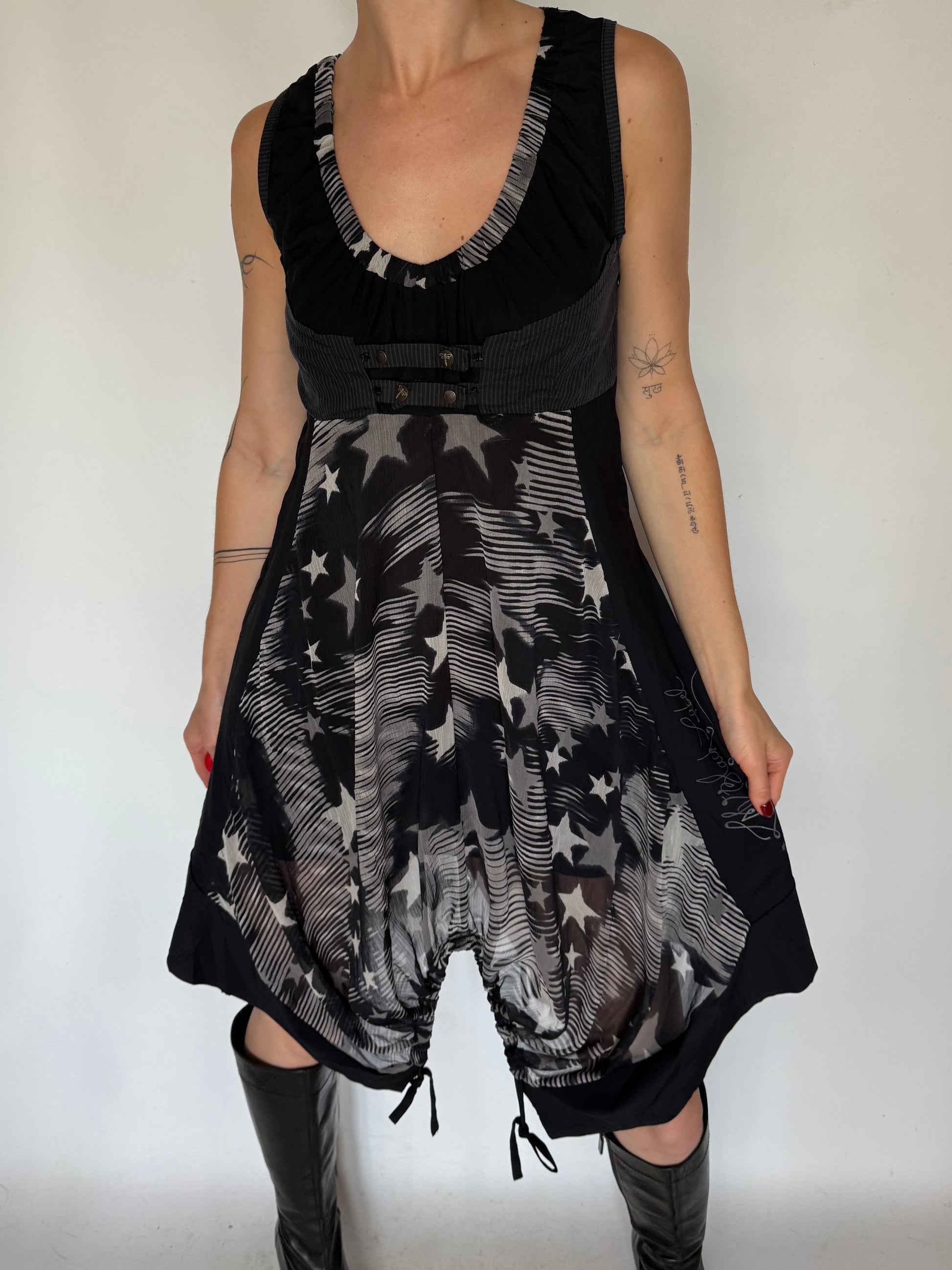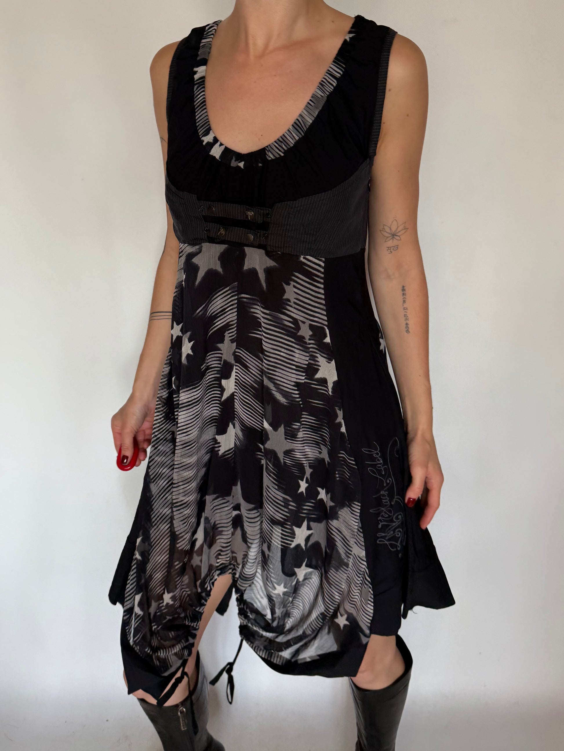 Unique vintage dress with an asymmetrical hem and dreamy star print. Designed in Paris, this sleeveless piece features soft draping, gathered sides with ties, and layered fabrics that move beautifully. A rare find for lovers of bold and playful silhouettes.