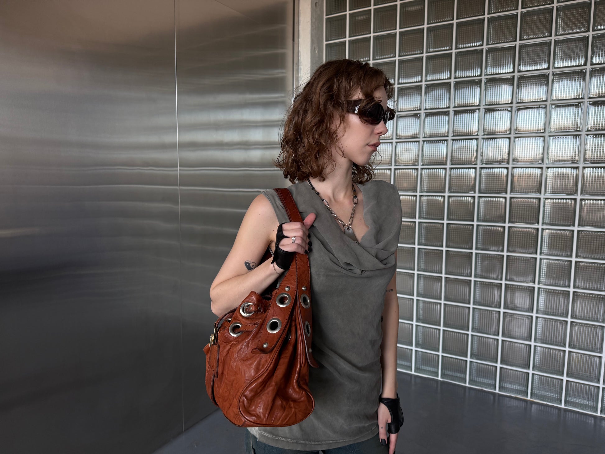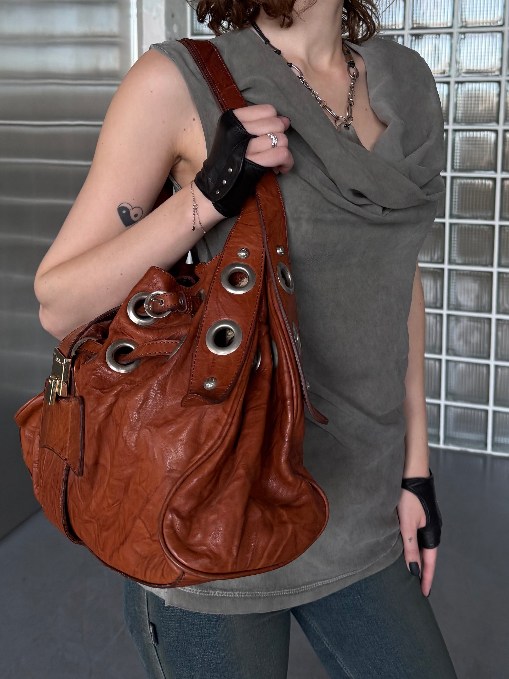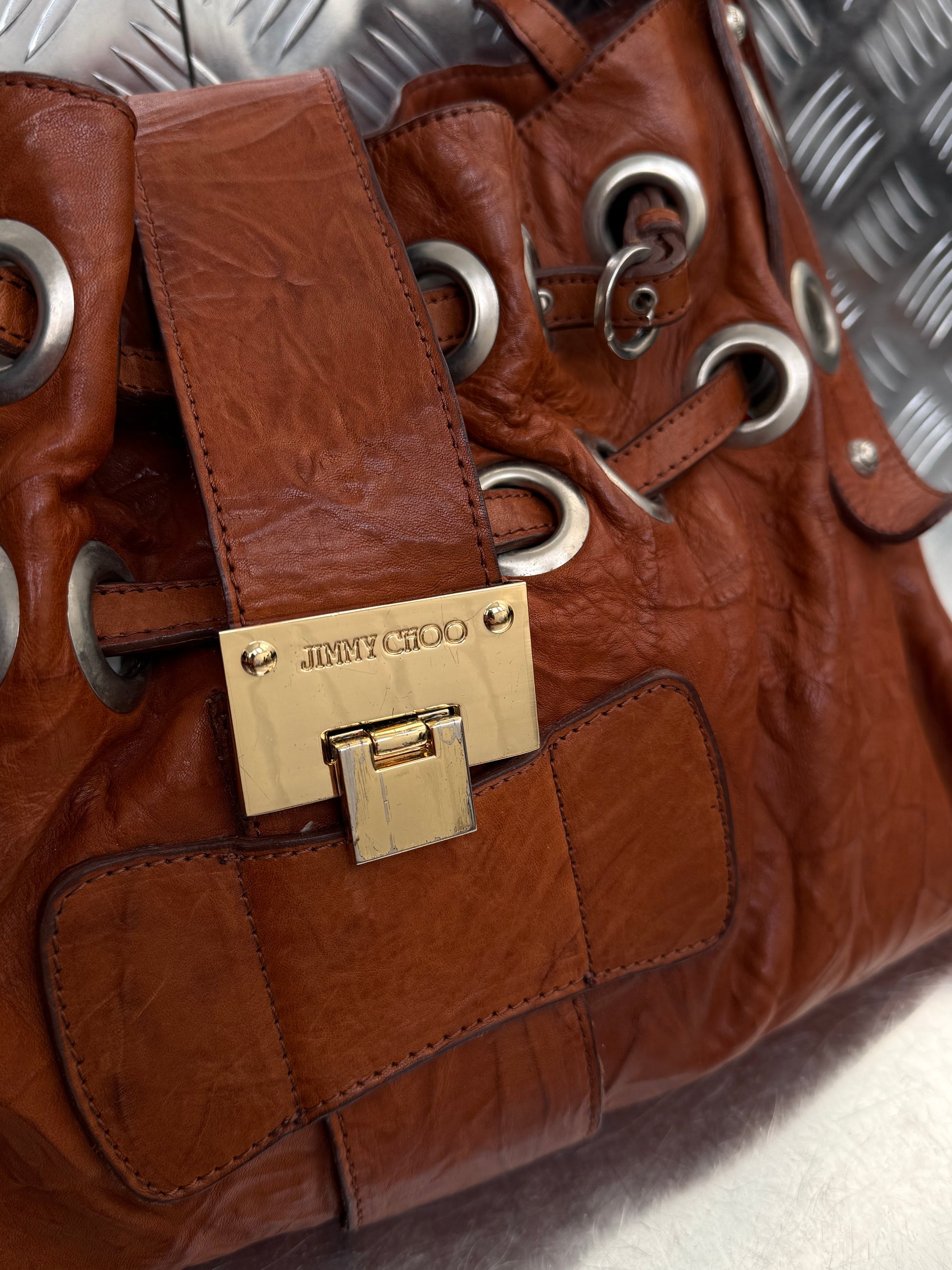 Vintage brown leather bag with chunky metal eyelets and drawstring detail. Soft natural leather with light wear and slight darkening — adds authentic vintage character. Spacious shape, shoulder carry. Please review photos closely.