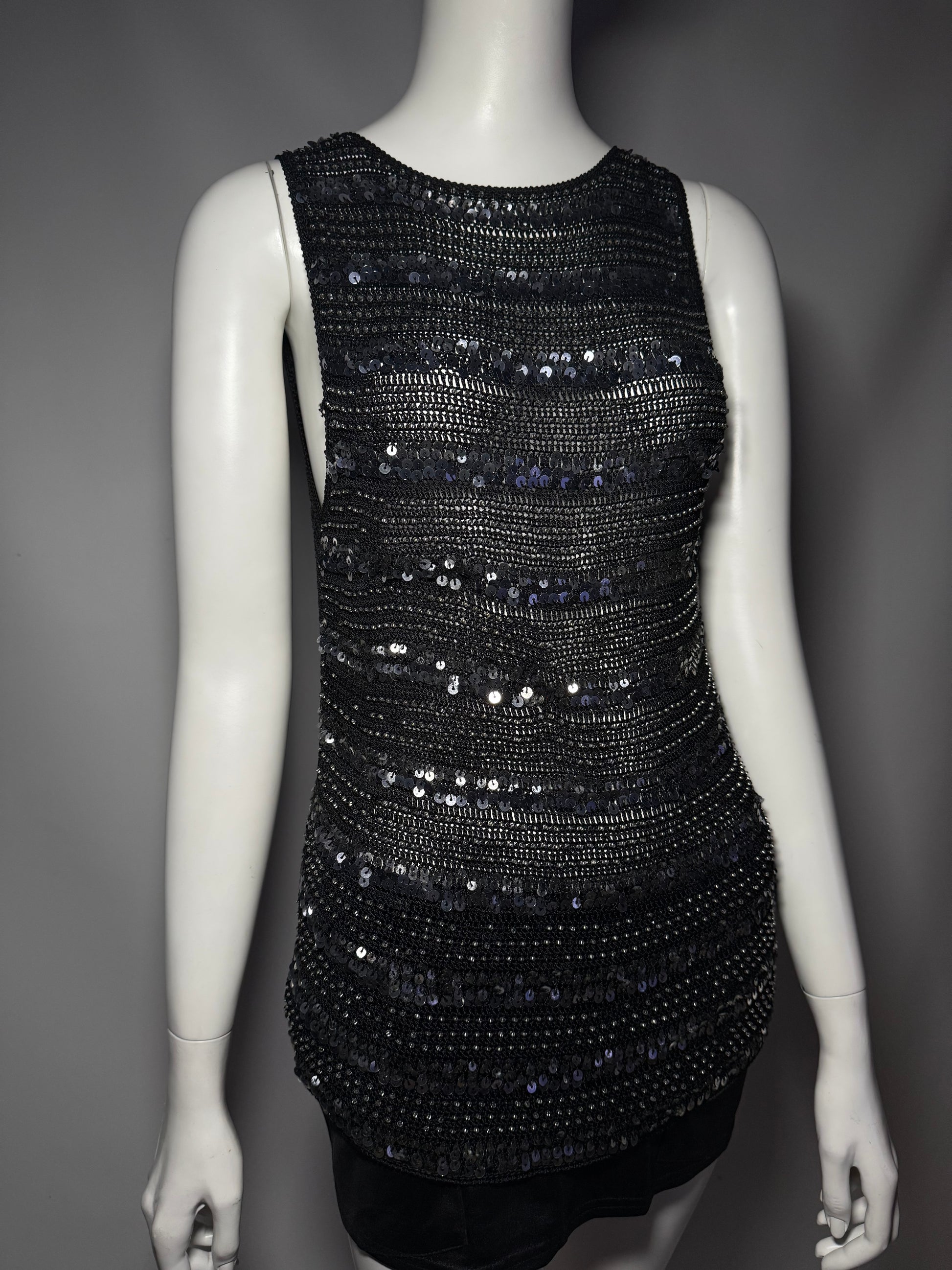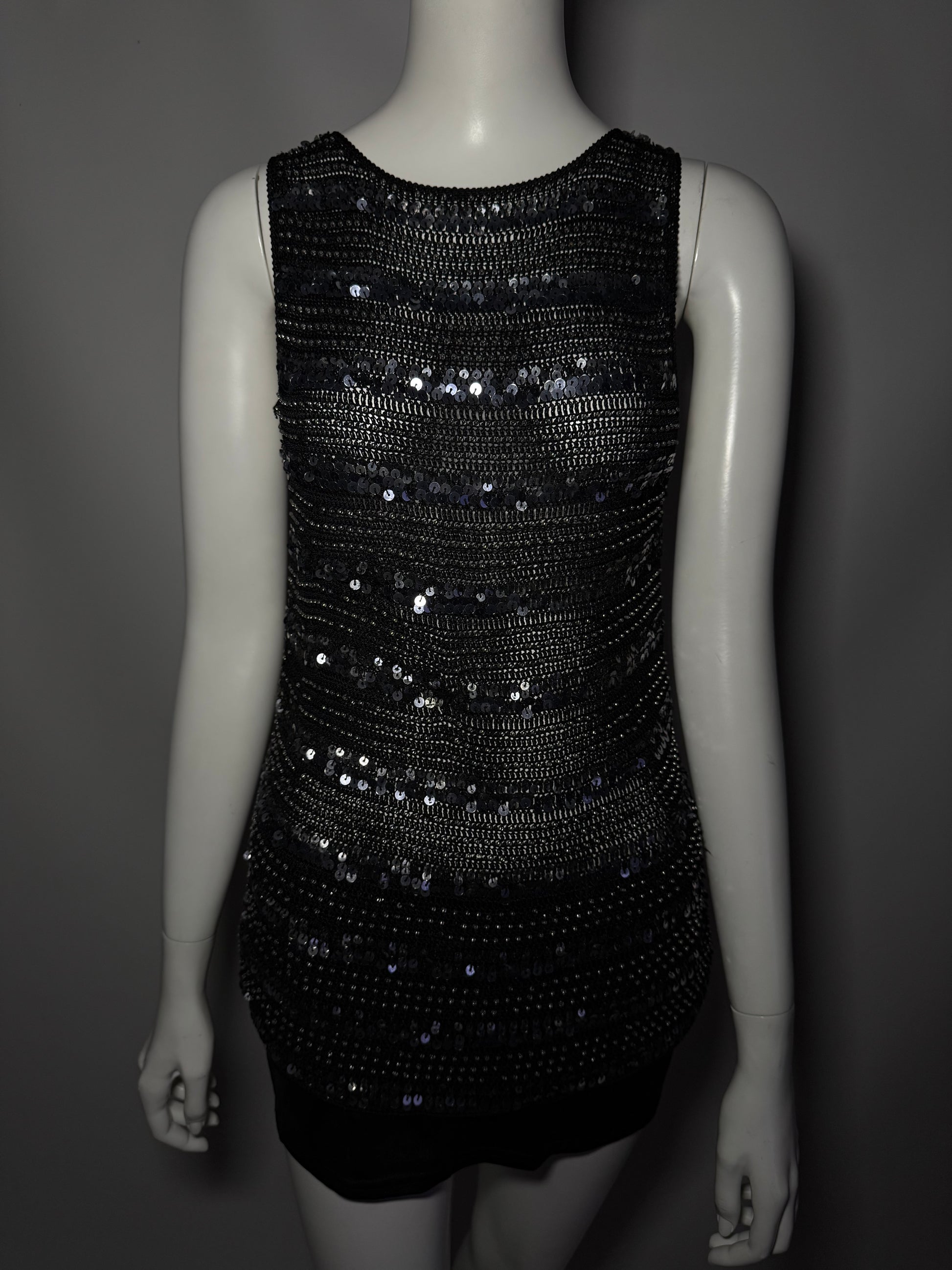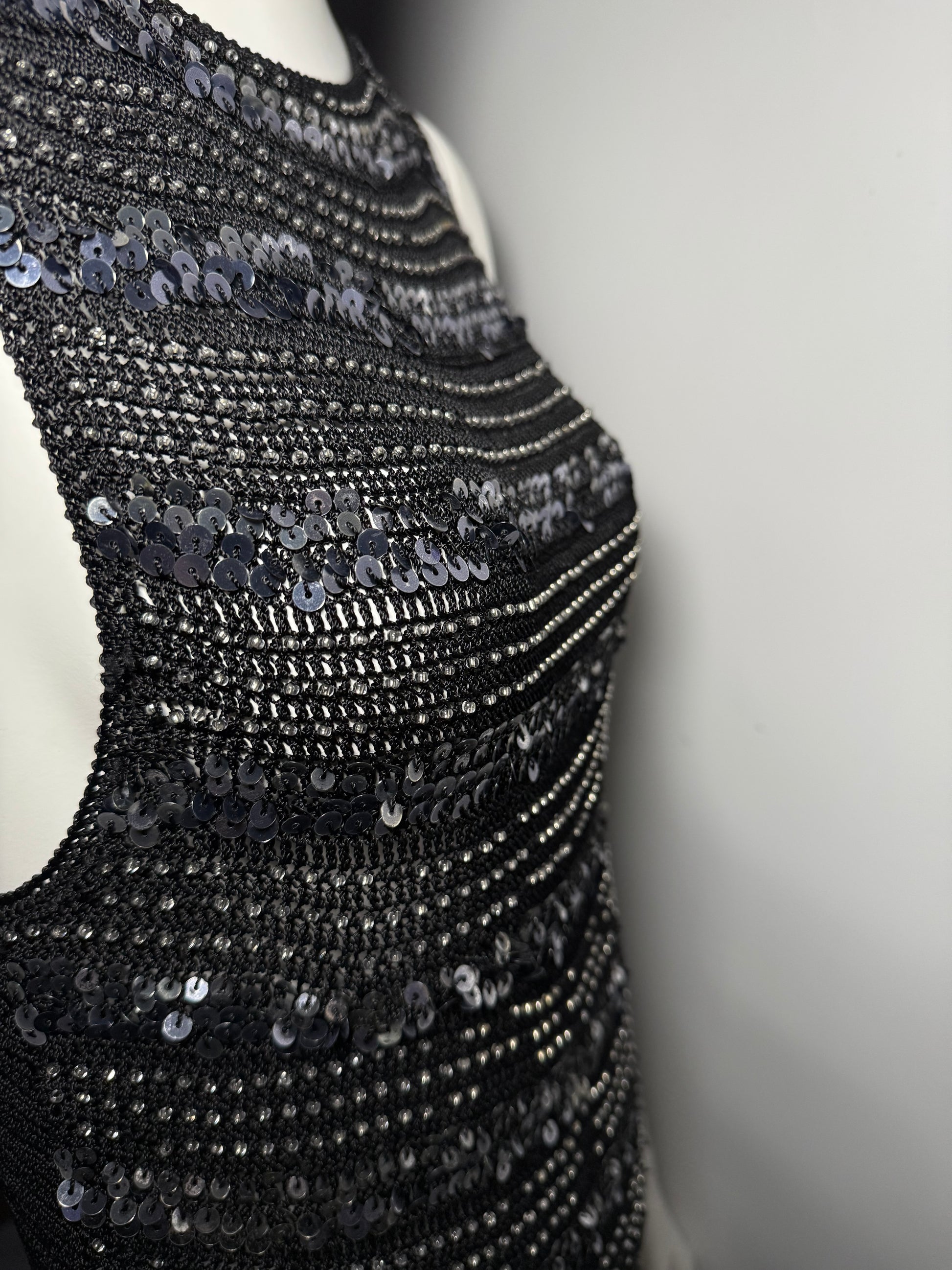 Shimmery black knit top with subtle transparency and all-over sequins on the front. Stretchy and comfortable fit.