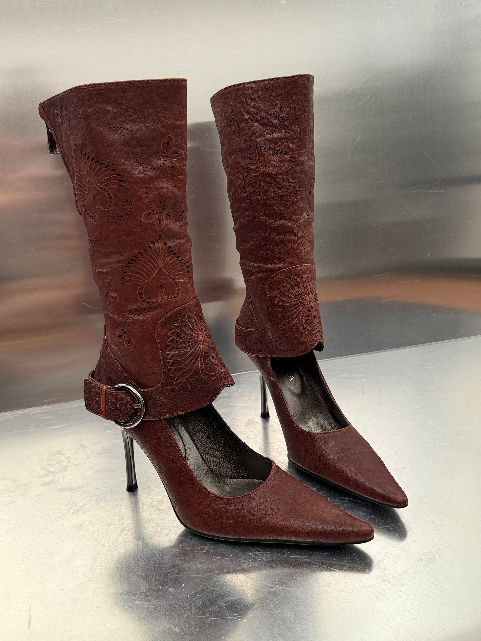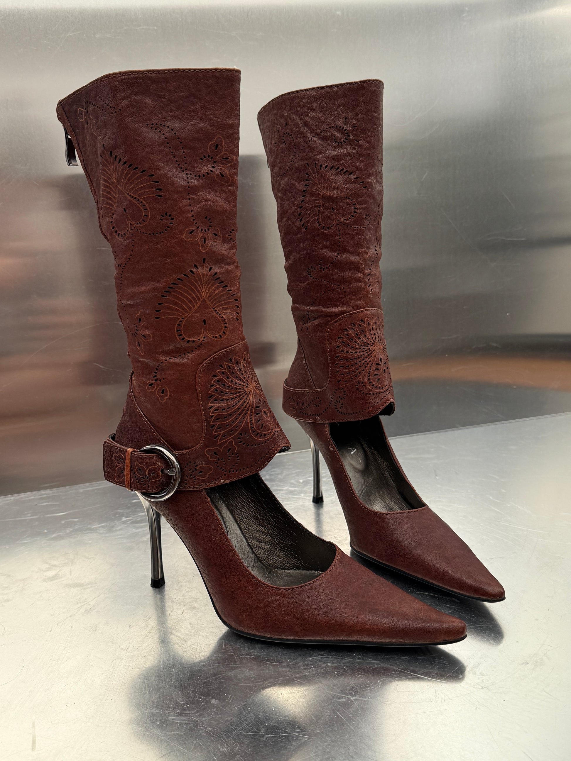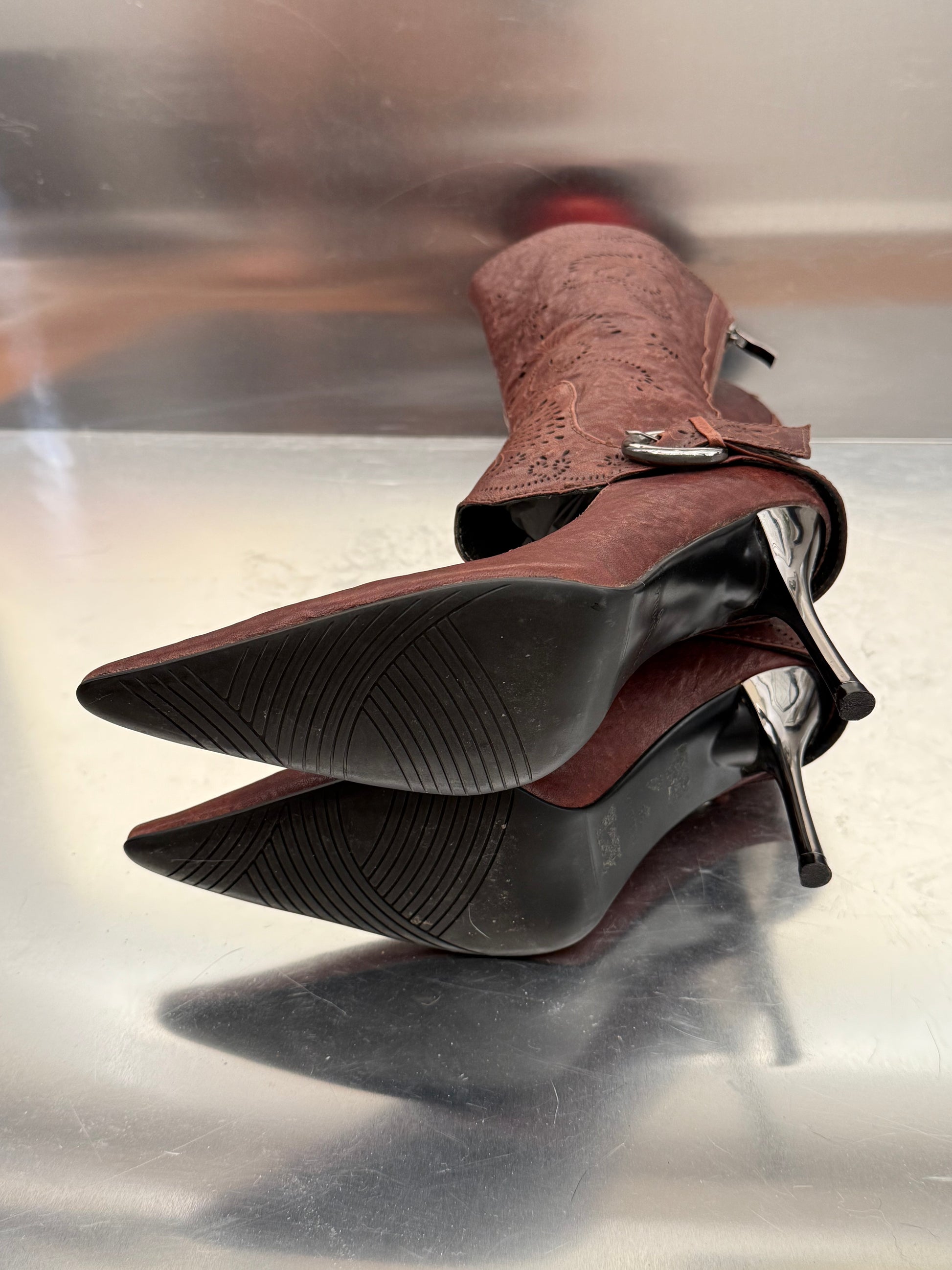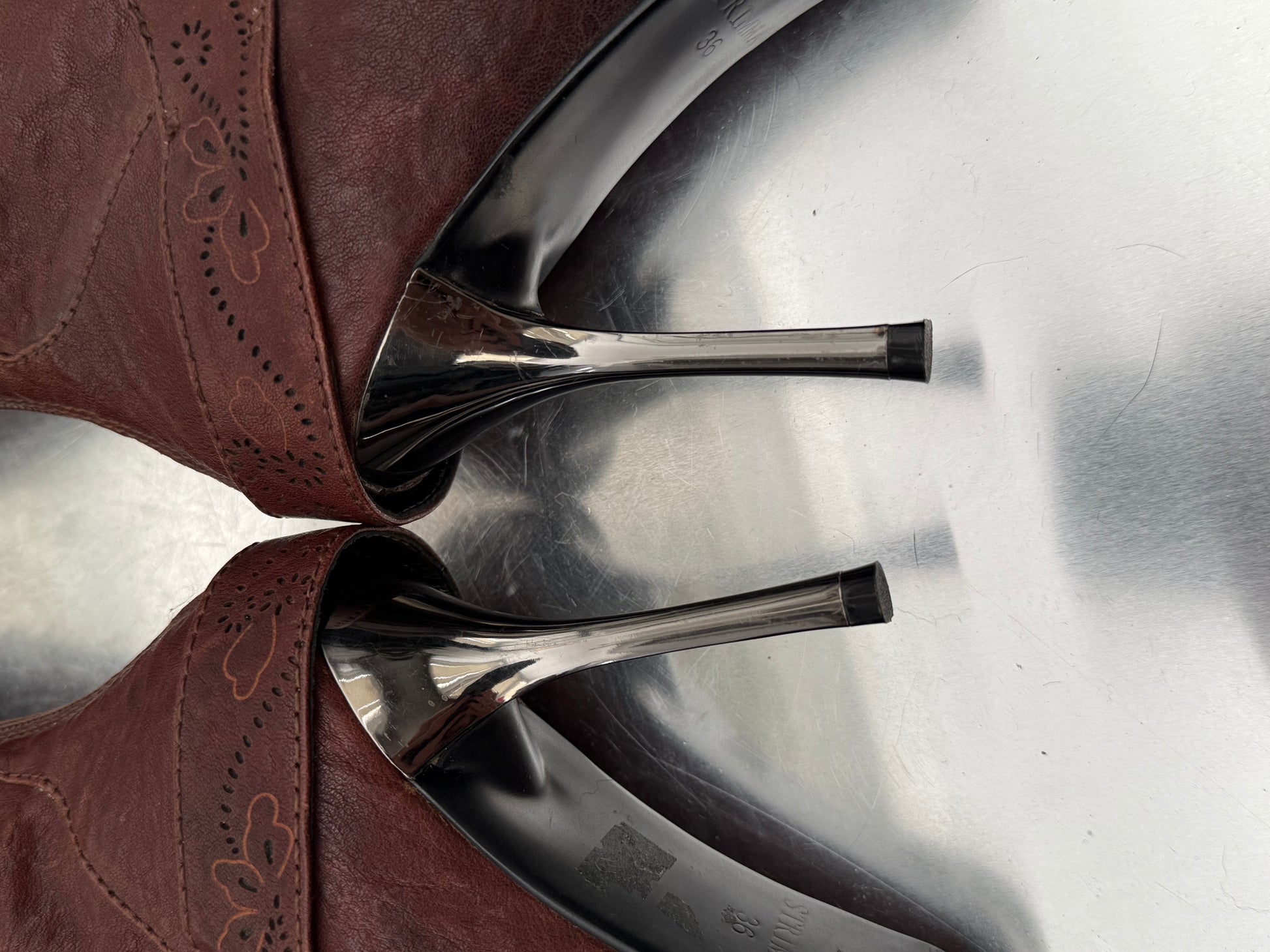 Вінтажні чоботи-туфлі з натуральної шкіри насиченого коричневого кольору із загостреним носком, високим каблуком-шпилькою, перфорованою халявою у стилі гетрів та пряжкою збоку. Нові, зі слідами зберігання та легкими потертостями на підборах від транспортування. Будь ласка, уважно перегляньте всі фото, щоб оцінити точний стан.