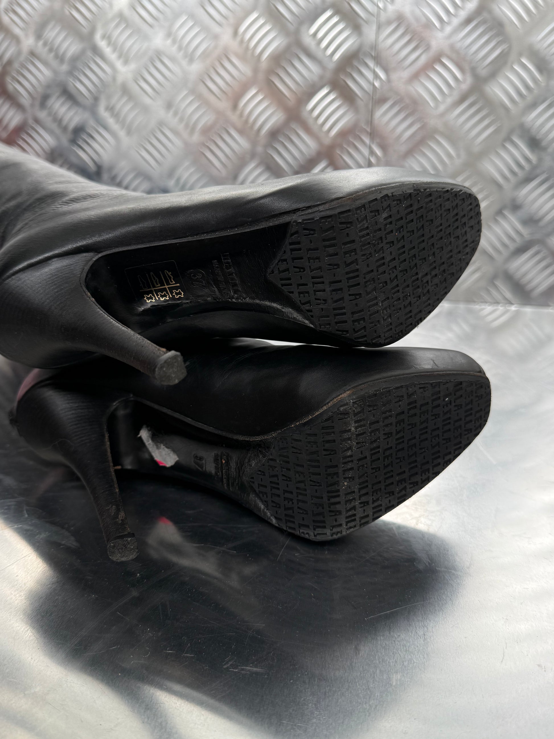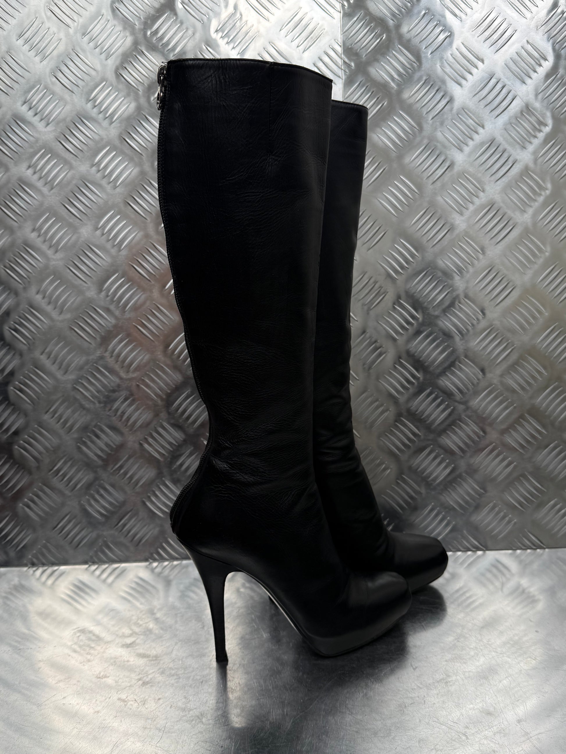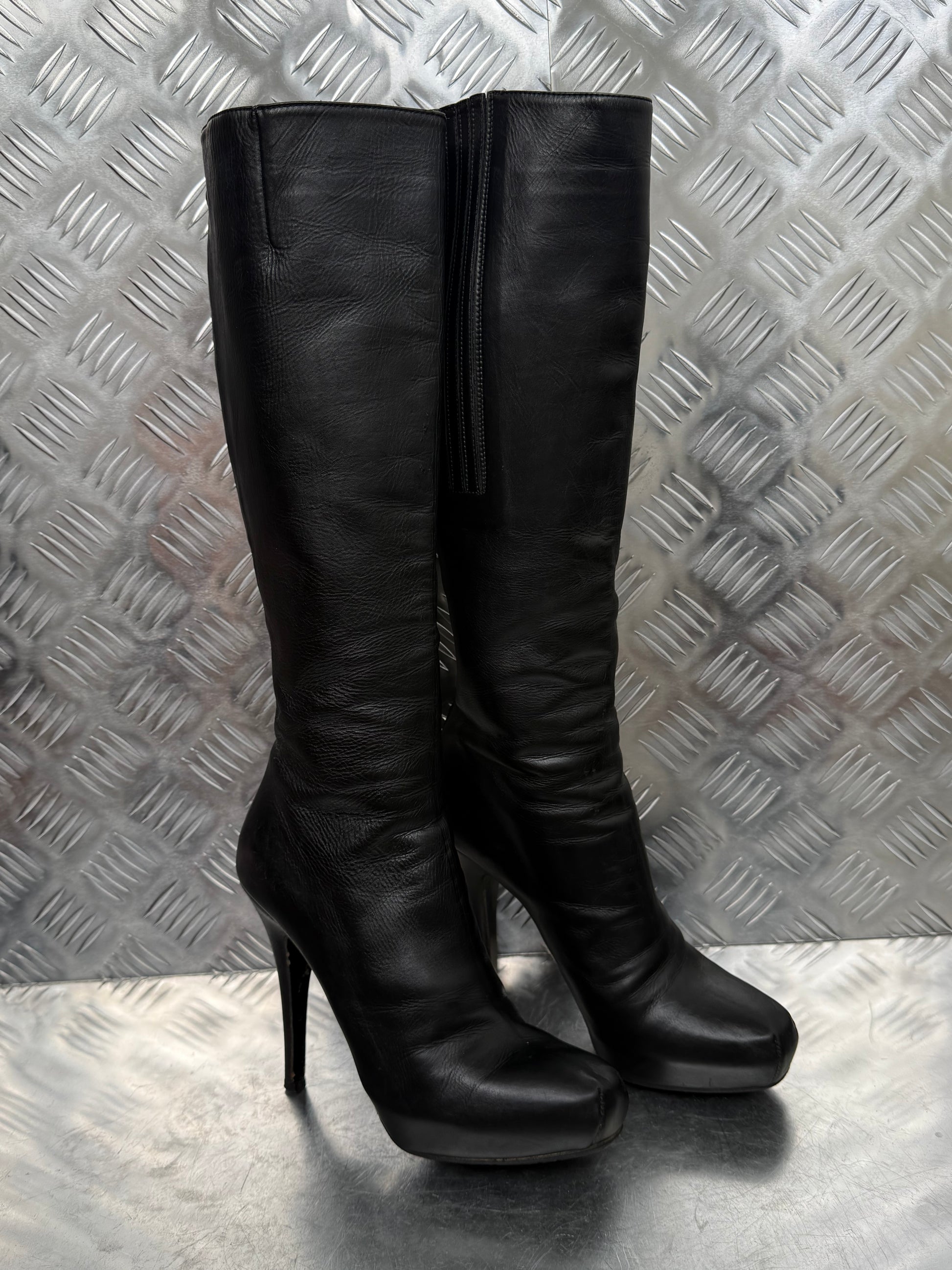 Italian genuine leather high boots with platform and rounded toe. Elegant fitted silhouette with slim stiletto heel. Very good condition; minor scuffs on the toes and light creasing/wear on leather — please review photos.