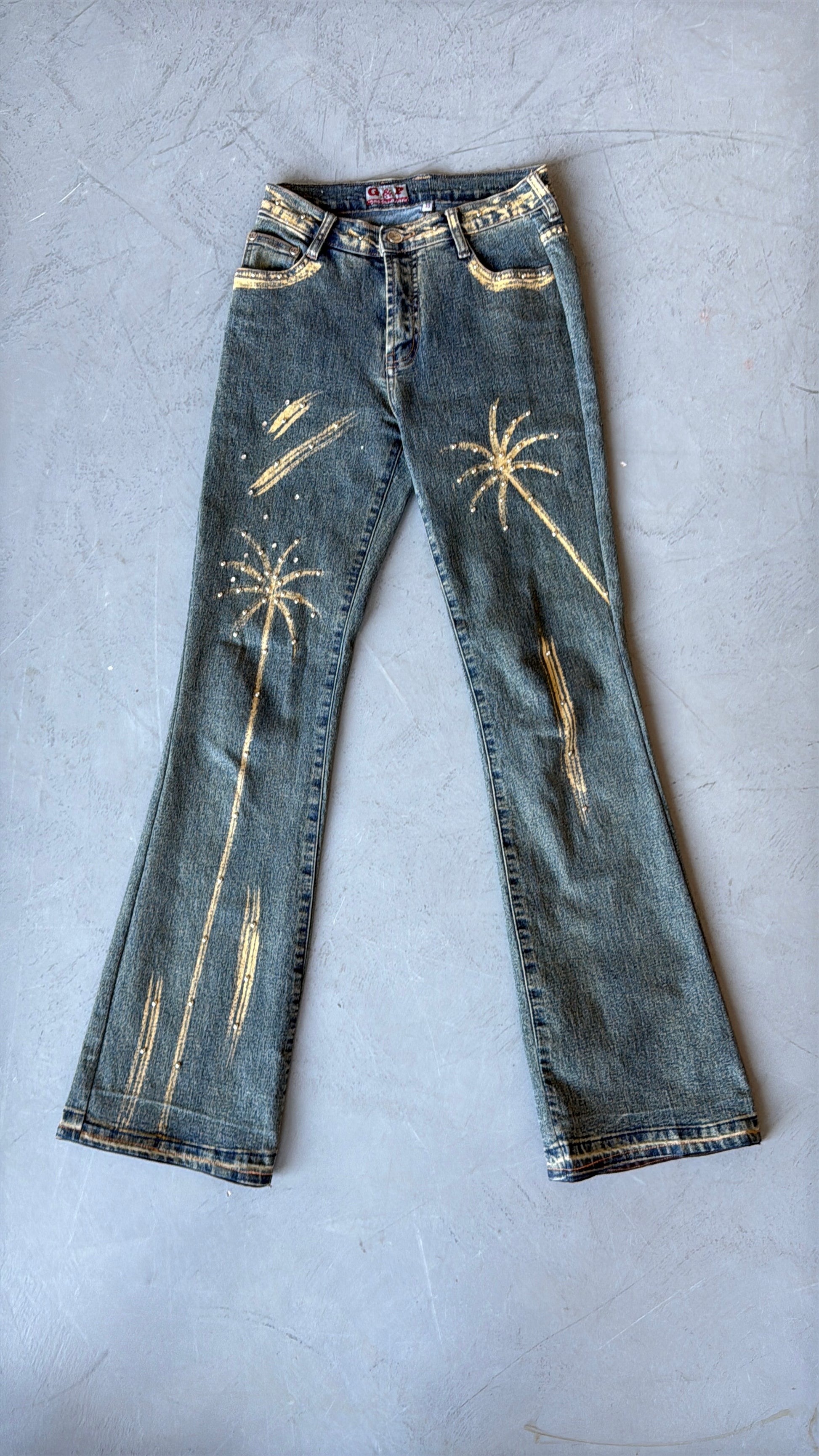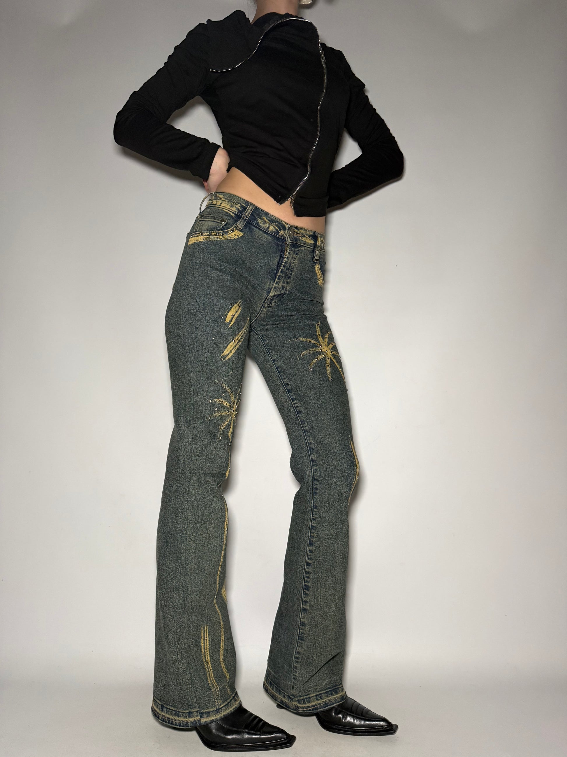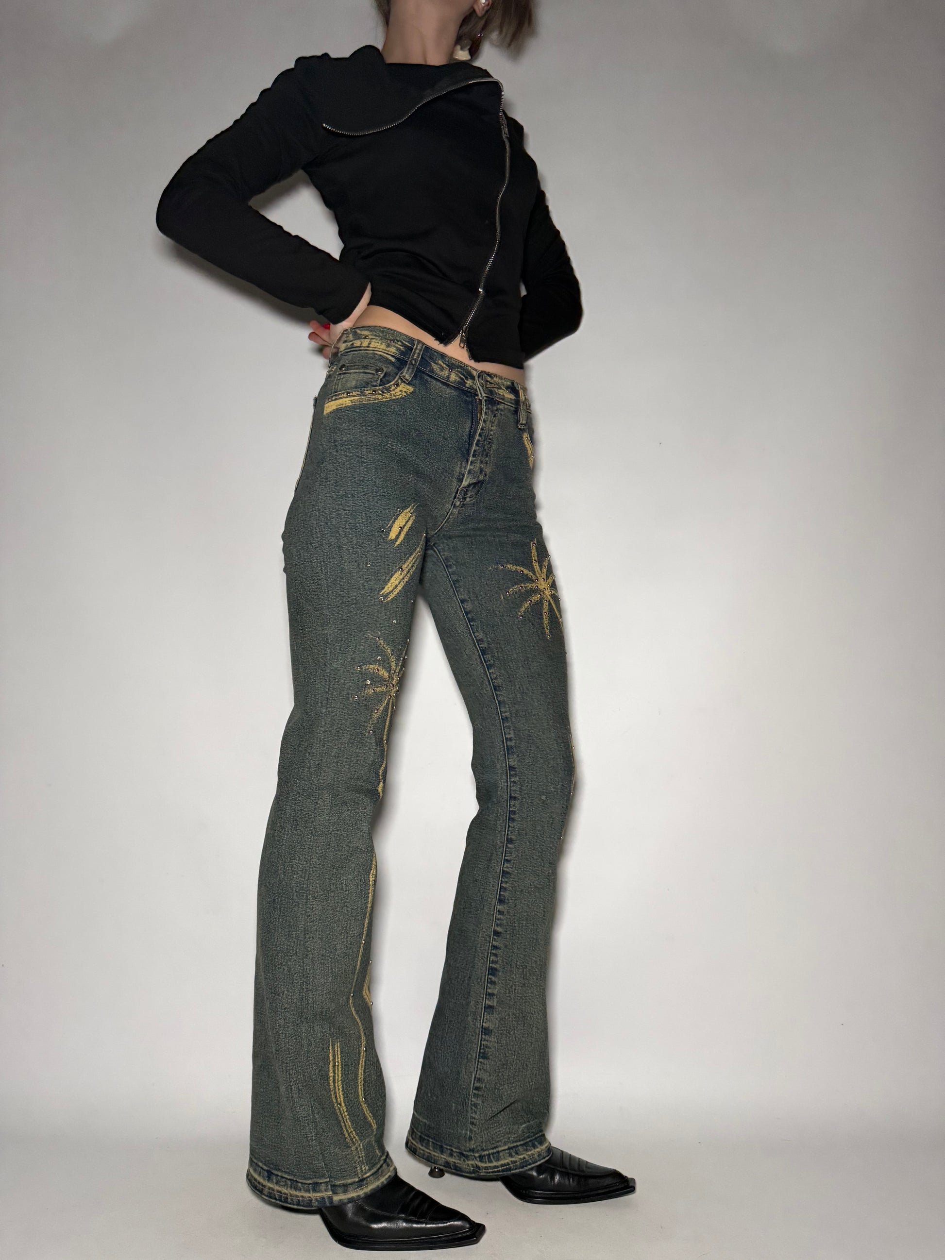 Stretch flare jeans with yellow distressed detailing. Low rise, soft denim, hugs the body and stretches comfortably. Good condition.