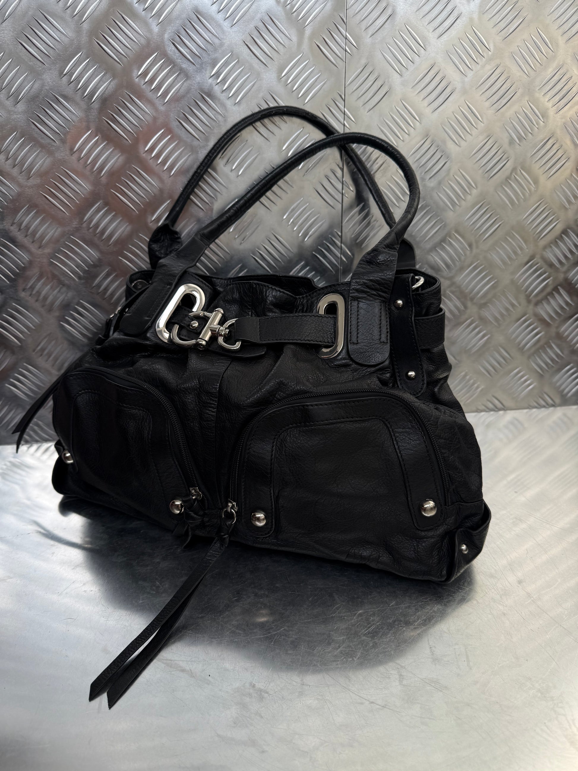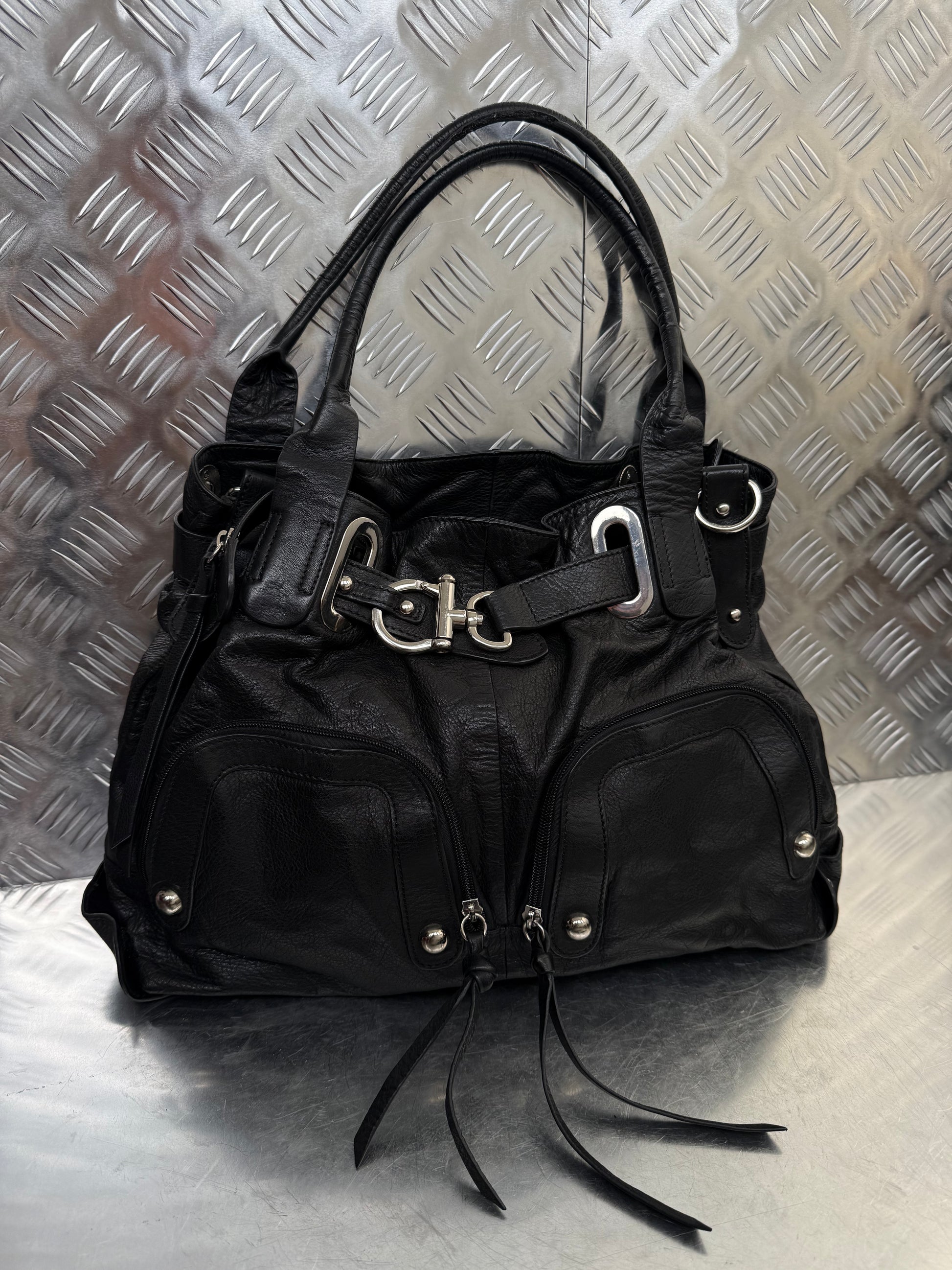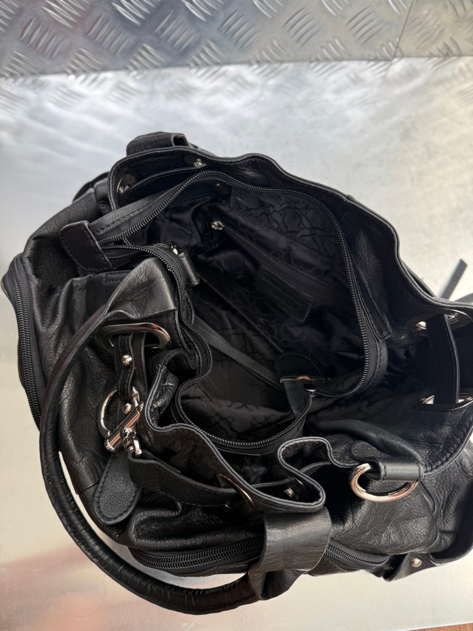 Vintage genuine leather bag in black. Soft textured leather, multiple pockets, silver hardware, stylish structured shape. Very good condition. Minor wear on handles — please see photos