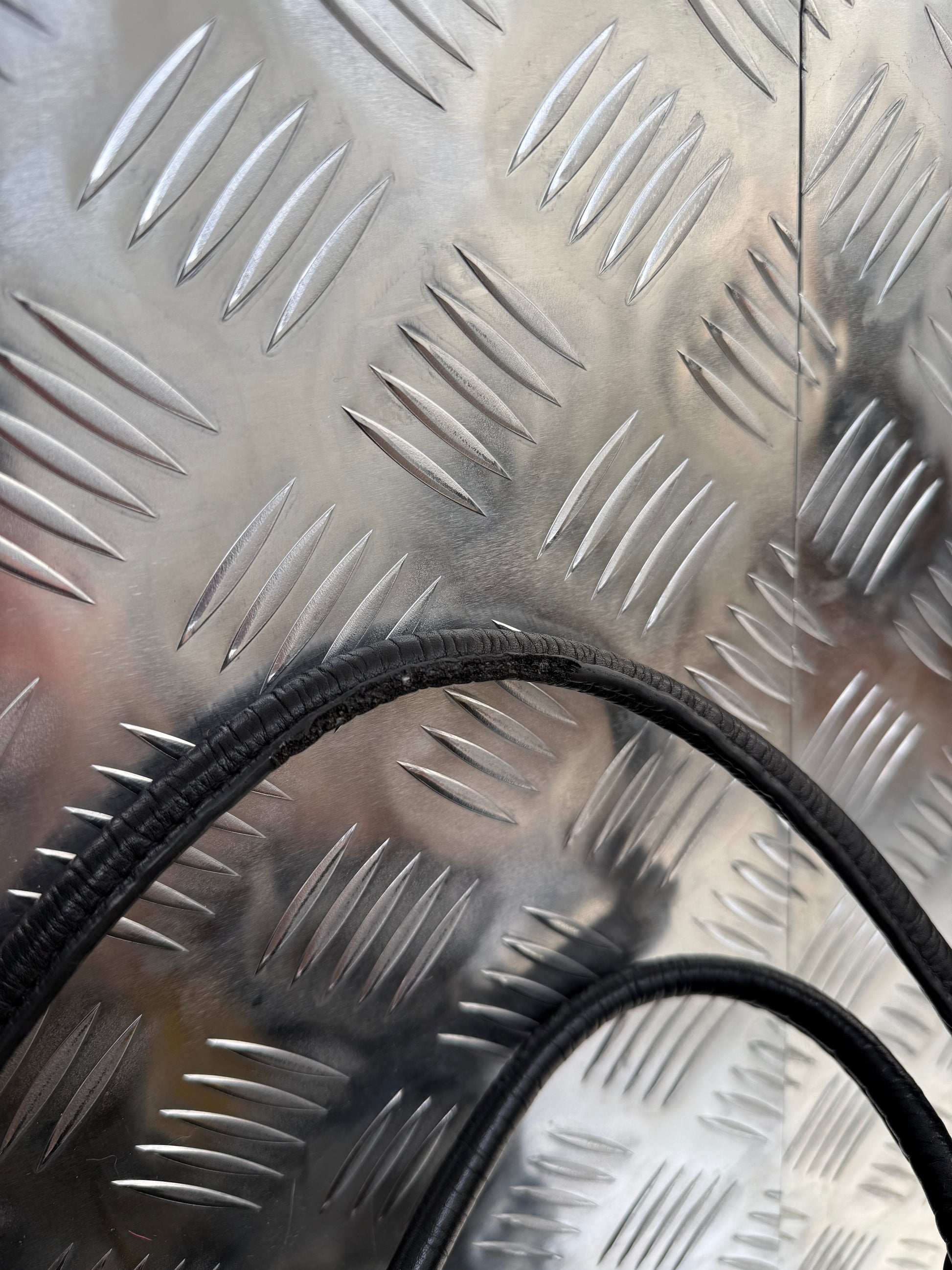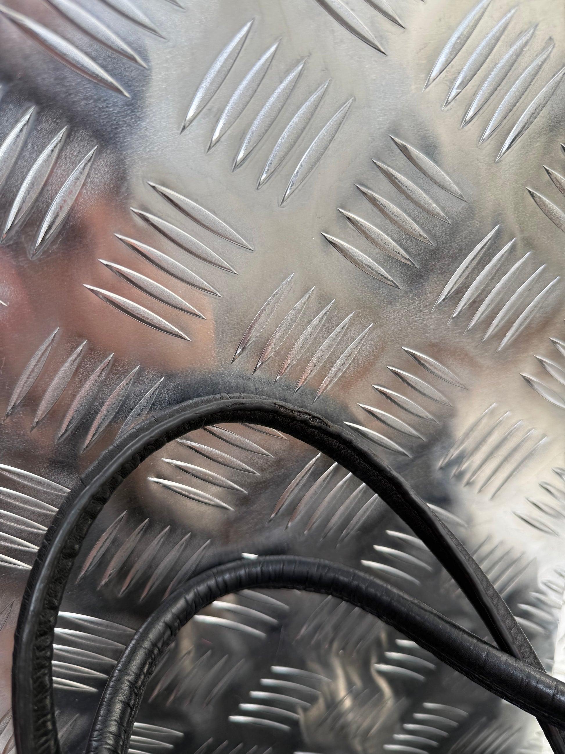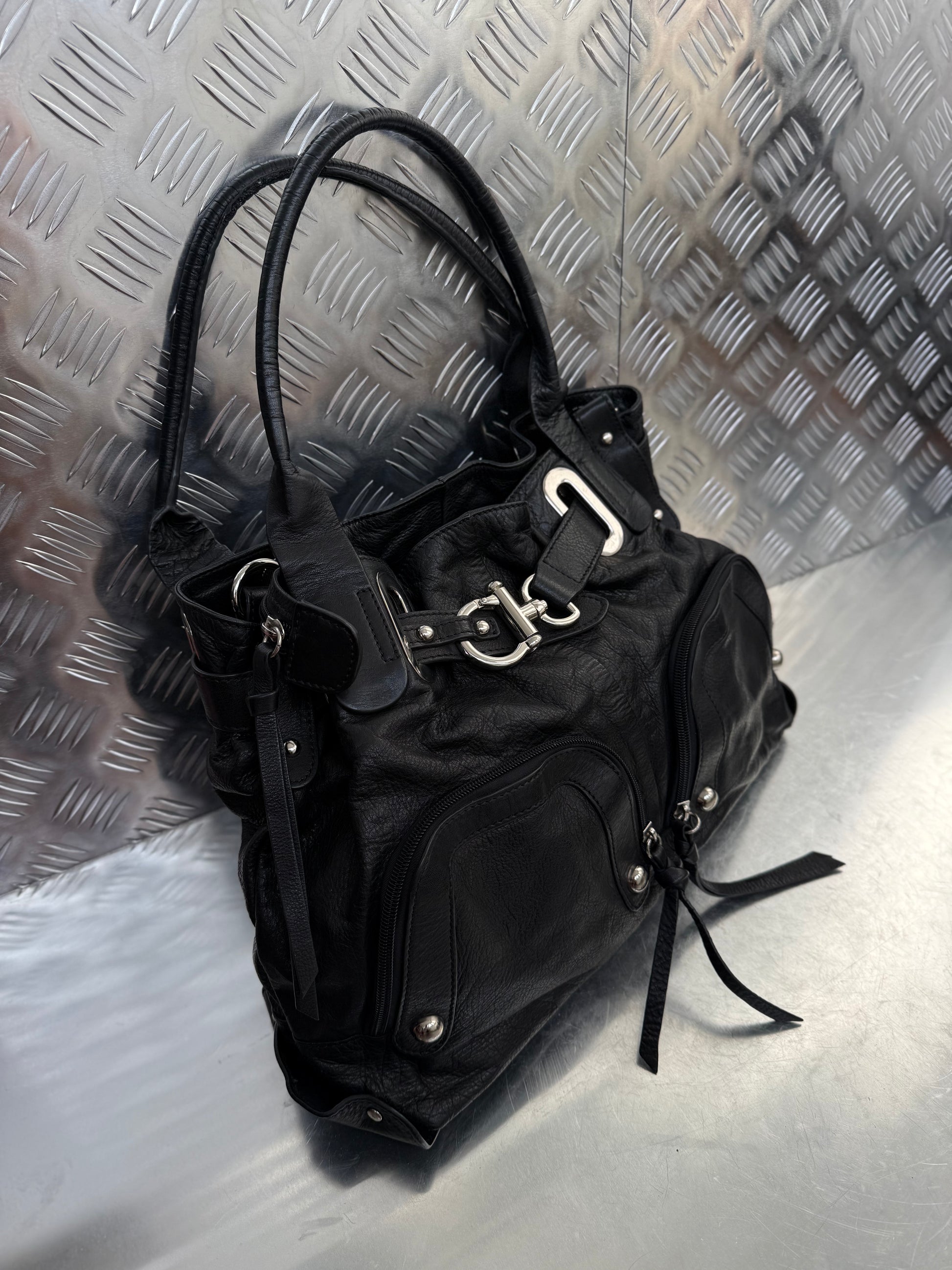 Vintage genuine leather bag in black. Soft textured leather, multiple pockets, silver hardware, stylish structured shape. Very good condition. Minor wear on handles — please see photos