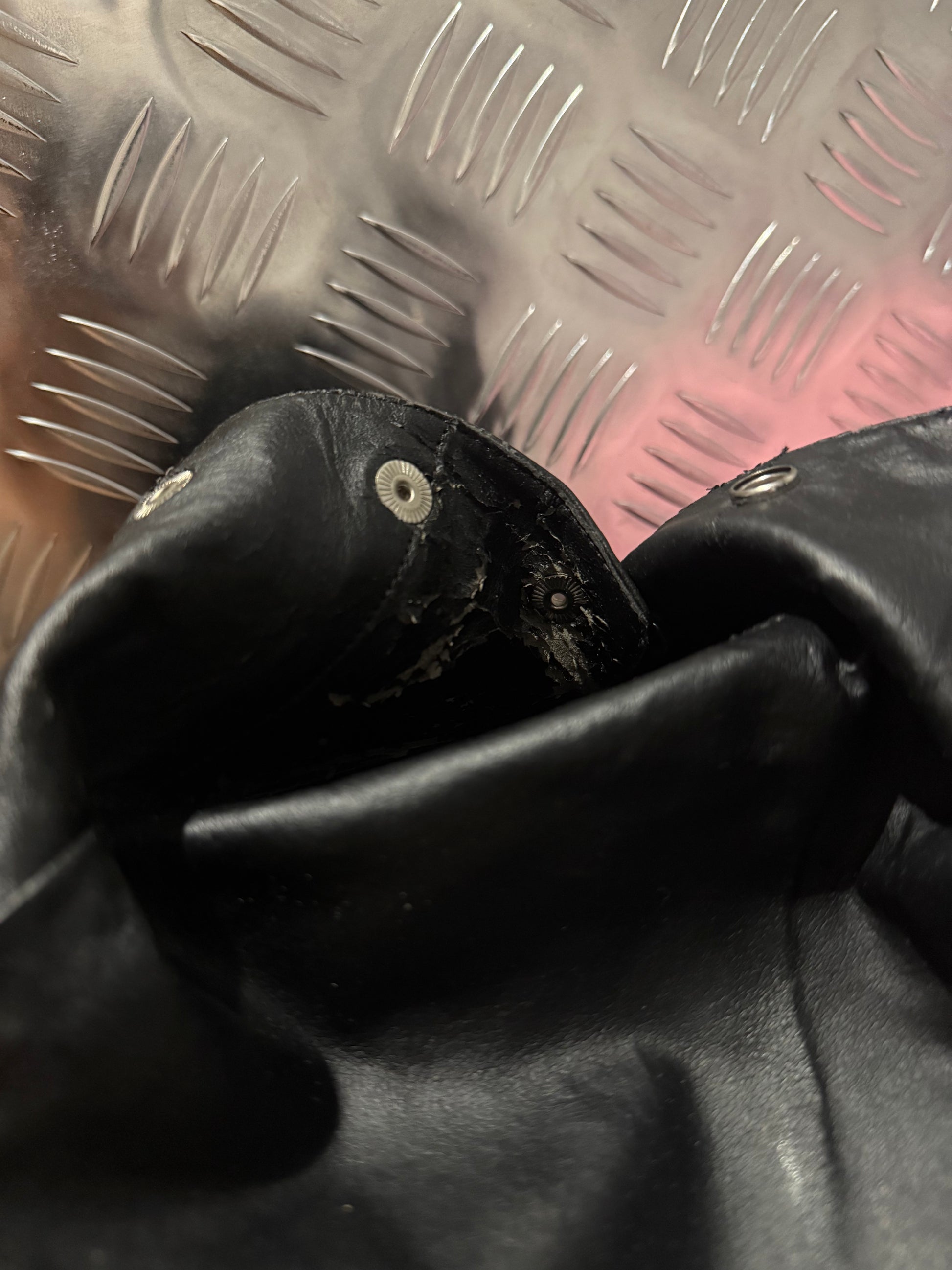 Outer: genuine leather. Inner lining: eco-leather. The lining material has started to peel and may shed slightly; it isn’t visible when worn. Please examine all photos carefully and note this nuance