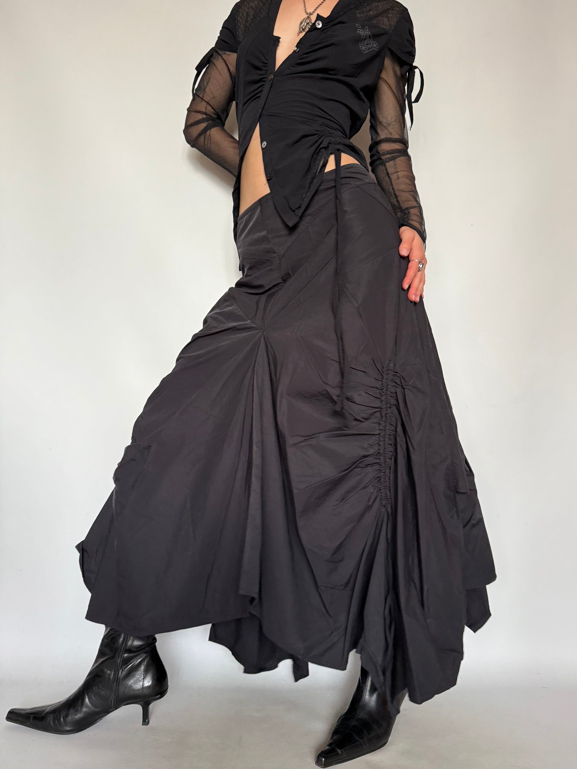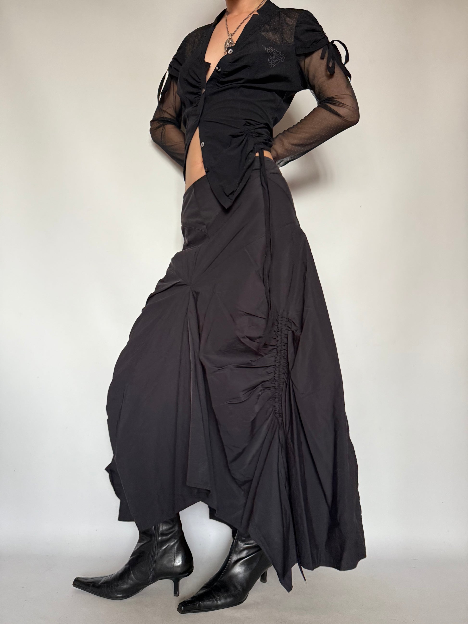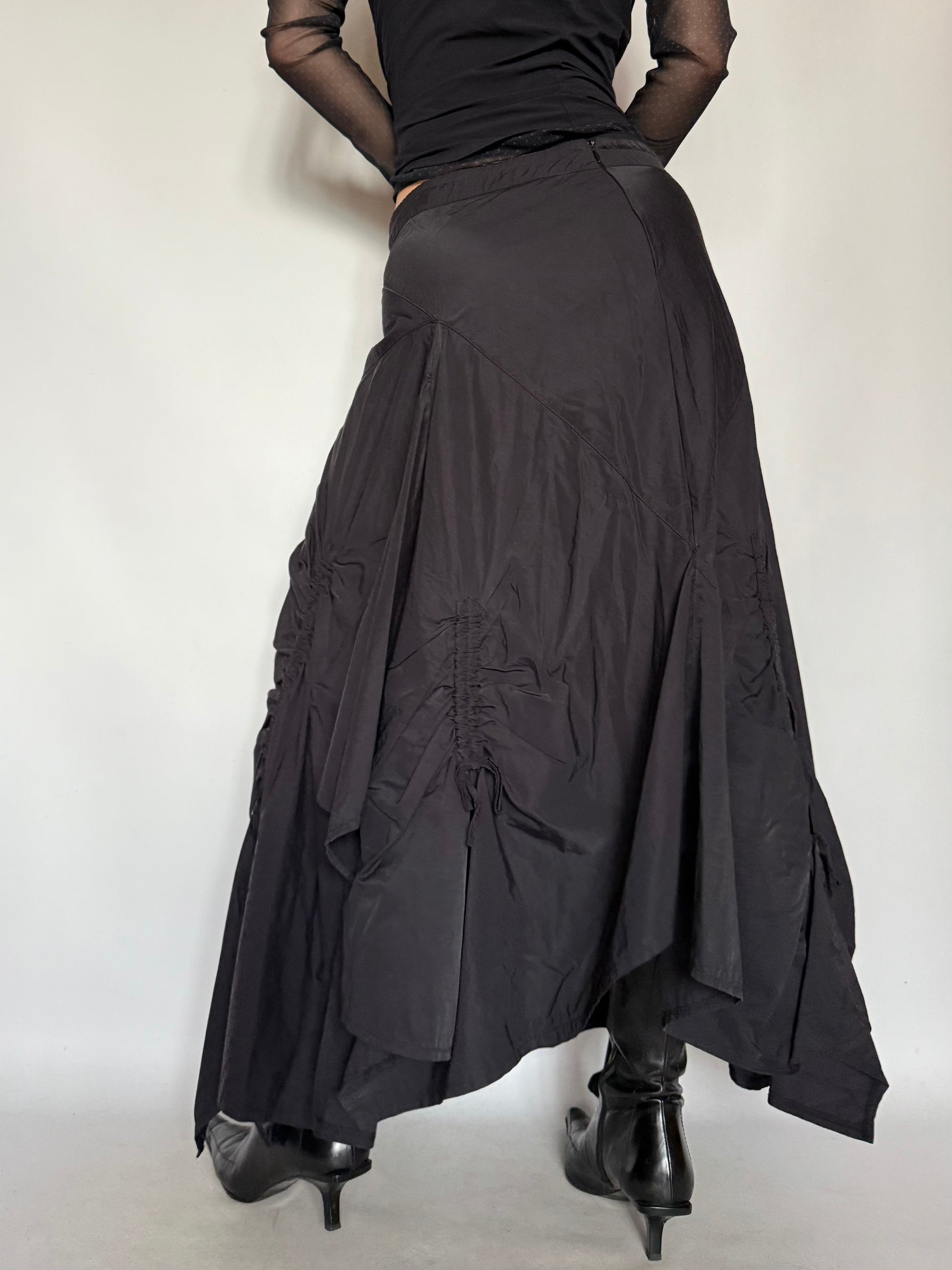 A dramatic vintage gothic-inspired maxi skirt with an asymmetrical cut and ruched detailing. The irregular hemline and gathered design create a bold, mysterious silhouette, perfect for statement evening looks and alternative styling.