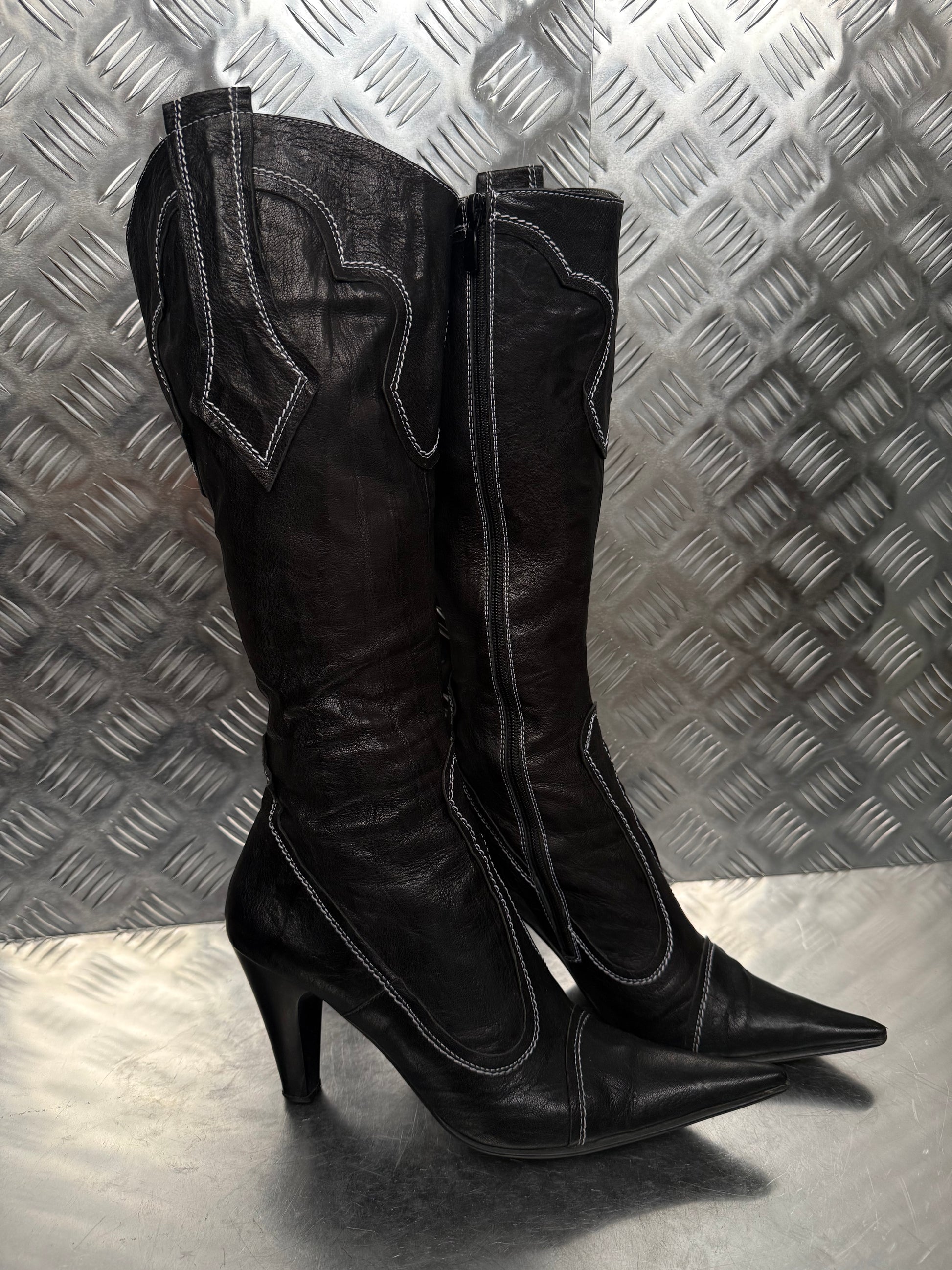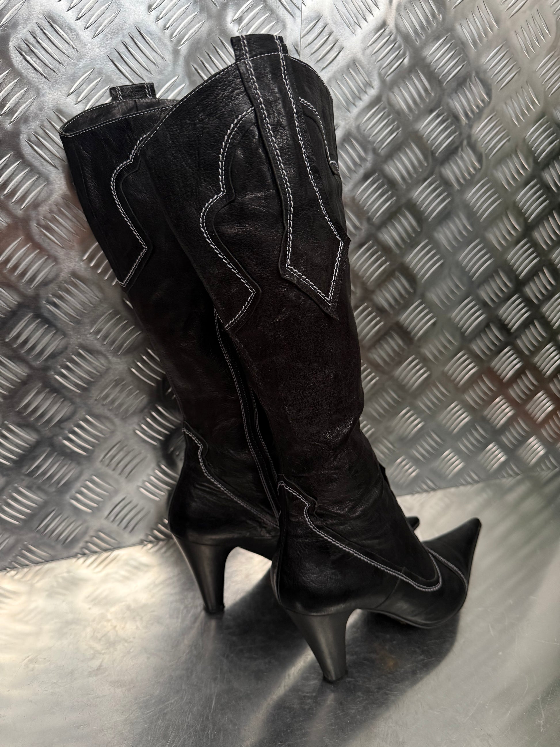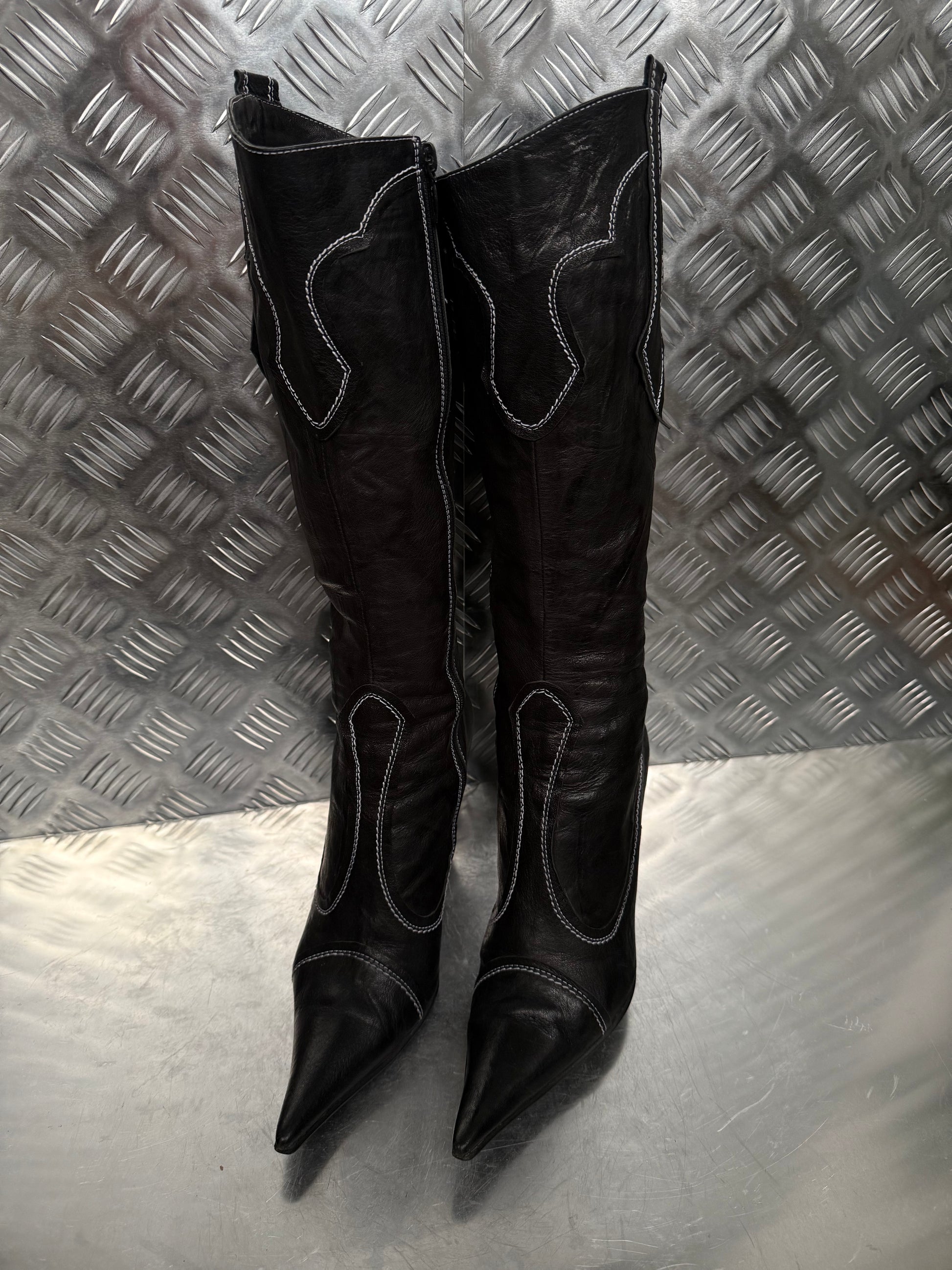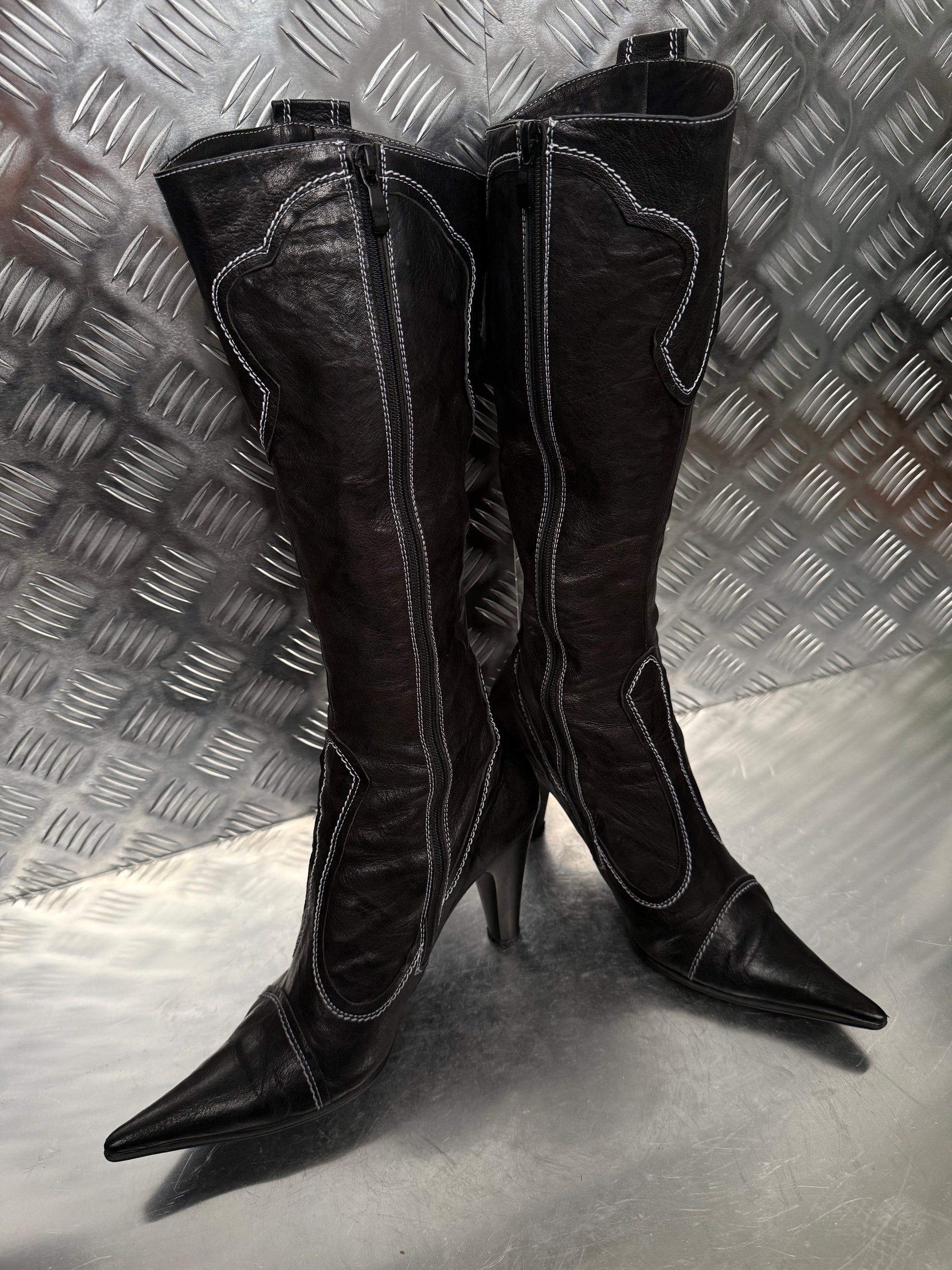 Black leather vintage cowboy boots with pointed toe and contrast stitching. Beautiful fit, great shape, quality leather. Excellent condition.