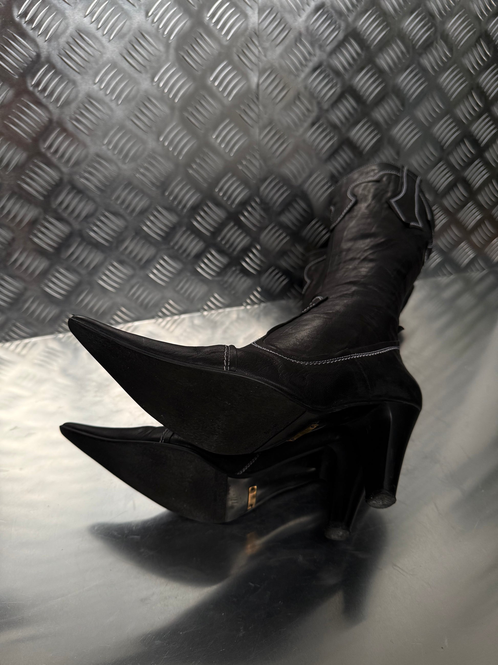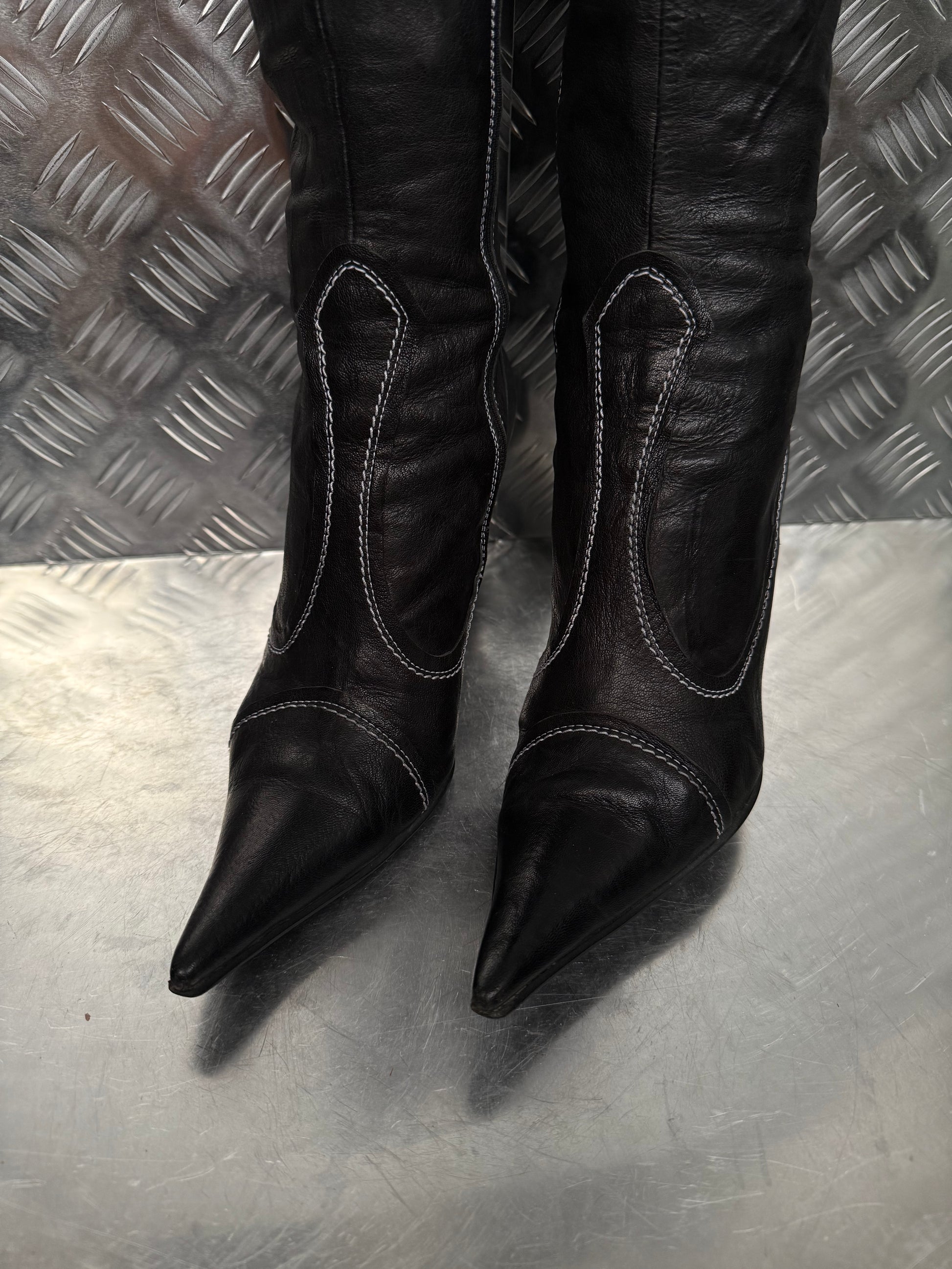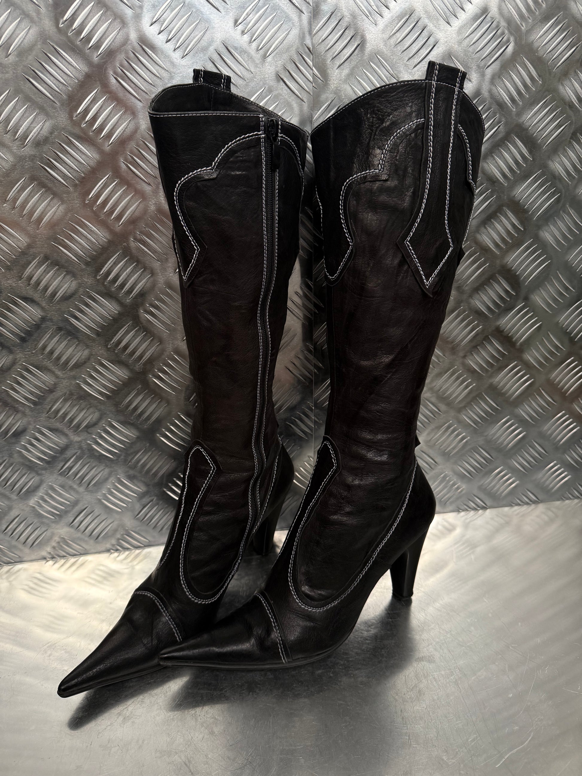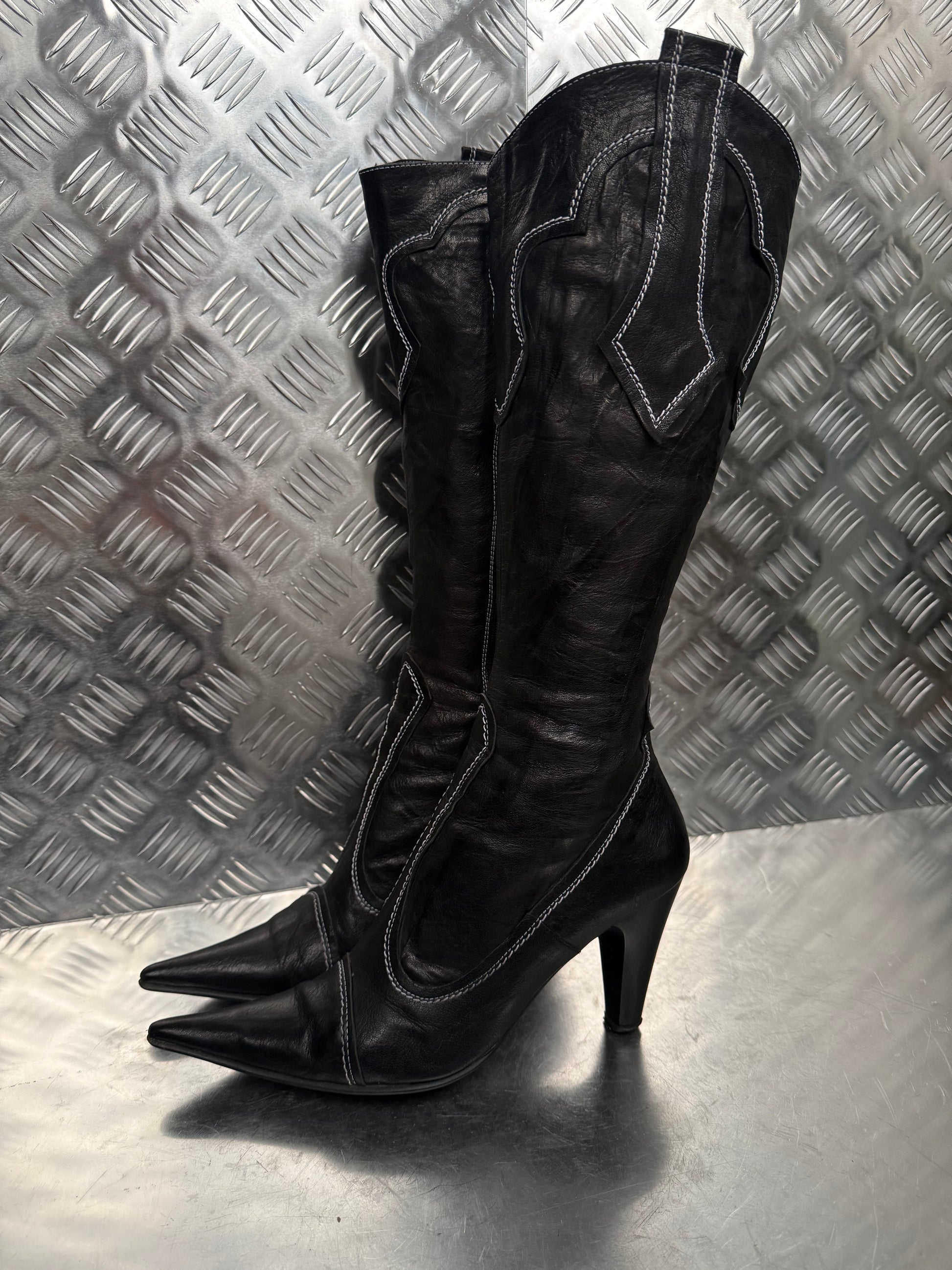 Black leather vintage cowboy boots with pointed toe and contrast stitching. Beautiful fit, great shape, quality leather. Excellent condition.