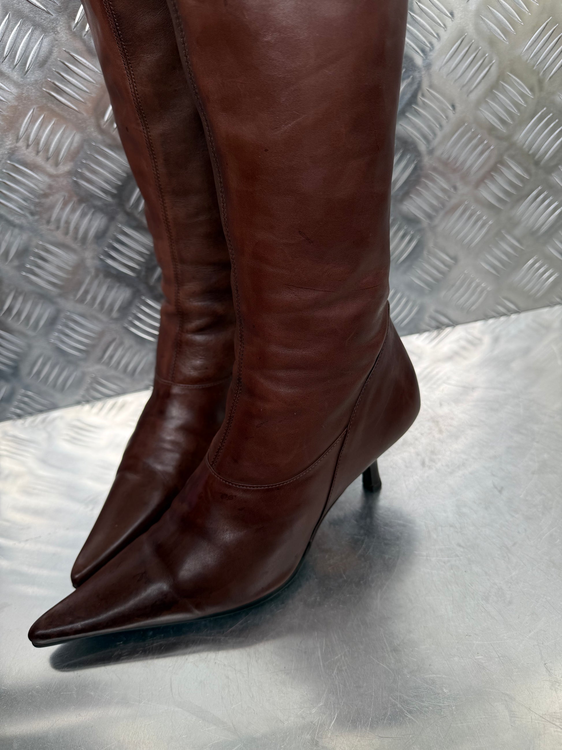 Brown genuine leather over-the-knee boots by Buffalo. Soft leather, comfortable heel, beautiful pointed shape. Excellent condition with minor natural leather wear and slight darkening — very subtle, does not affect look or comfort.