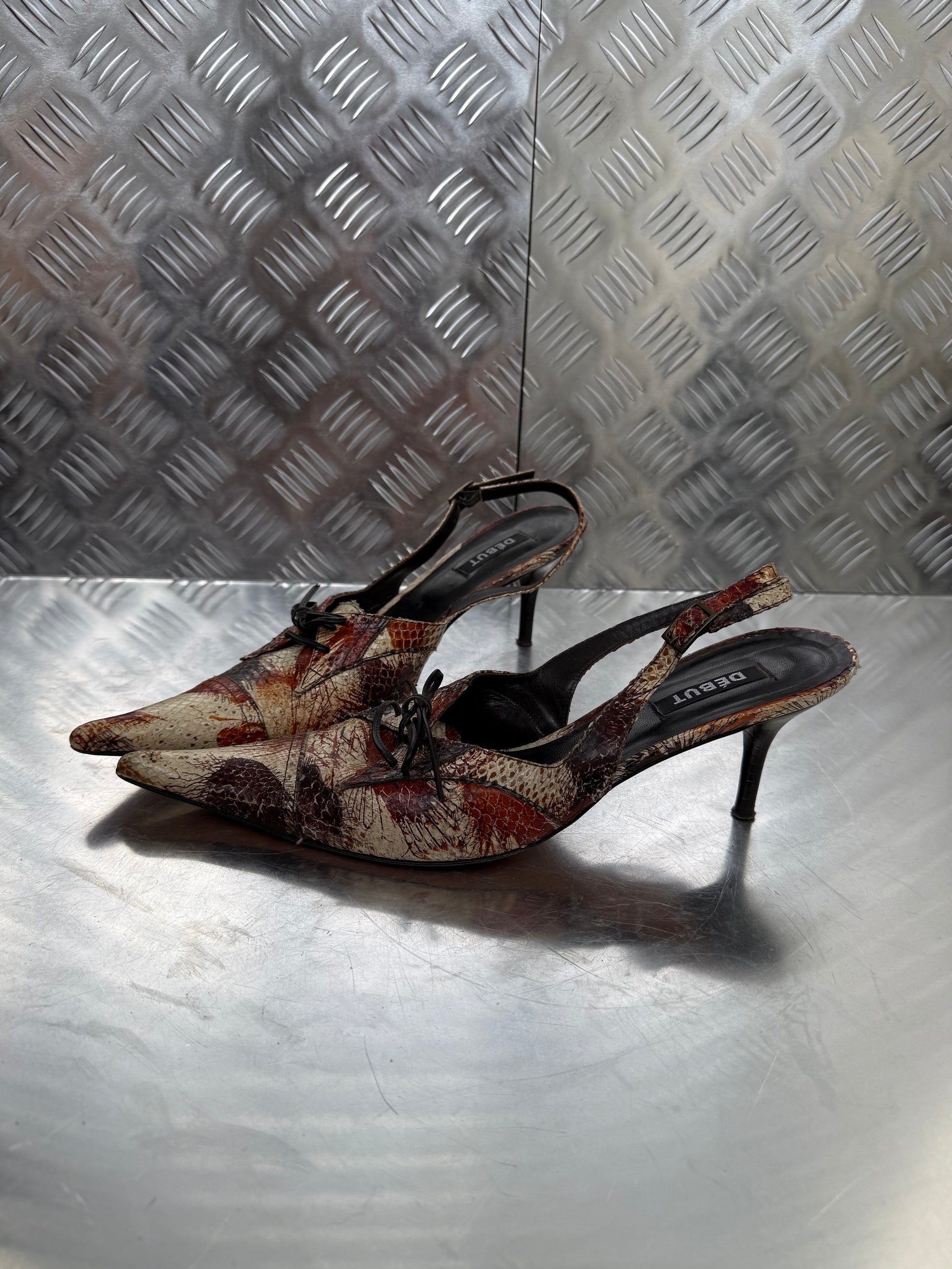 Unique vintage Italian leather slingback mules in artistic multi-tone print. Pointed toe, low kitten heel, delicate bow detail. Good condition; minor scuffs and small scratches on toes and heels — please review photos.